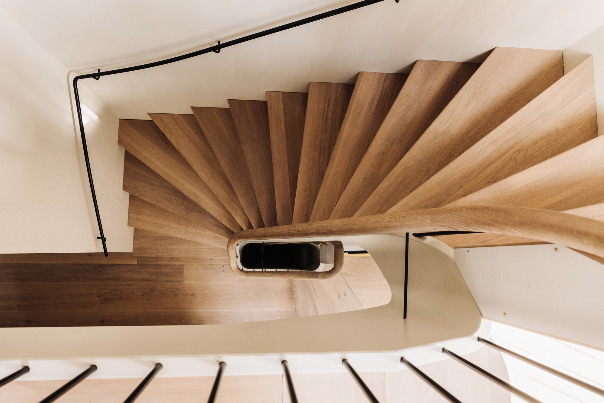Het trappenhuis is centraal tussen het voorhuis en achterhuis en heeft eveneens ramen naar het lichthof. Zij vormt de verbinding naar alle woonlagen en tussen voor- en achterhuis. De trap en leuningen zijn heel mooi gedetailleerd met eikenhout. Het lichthof zorgt voor extra ruimtelijkheid en extra daglicht toetreding.