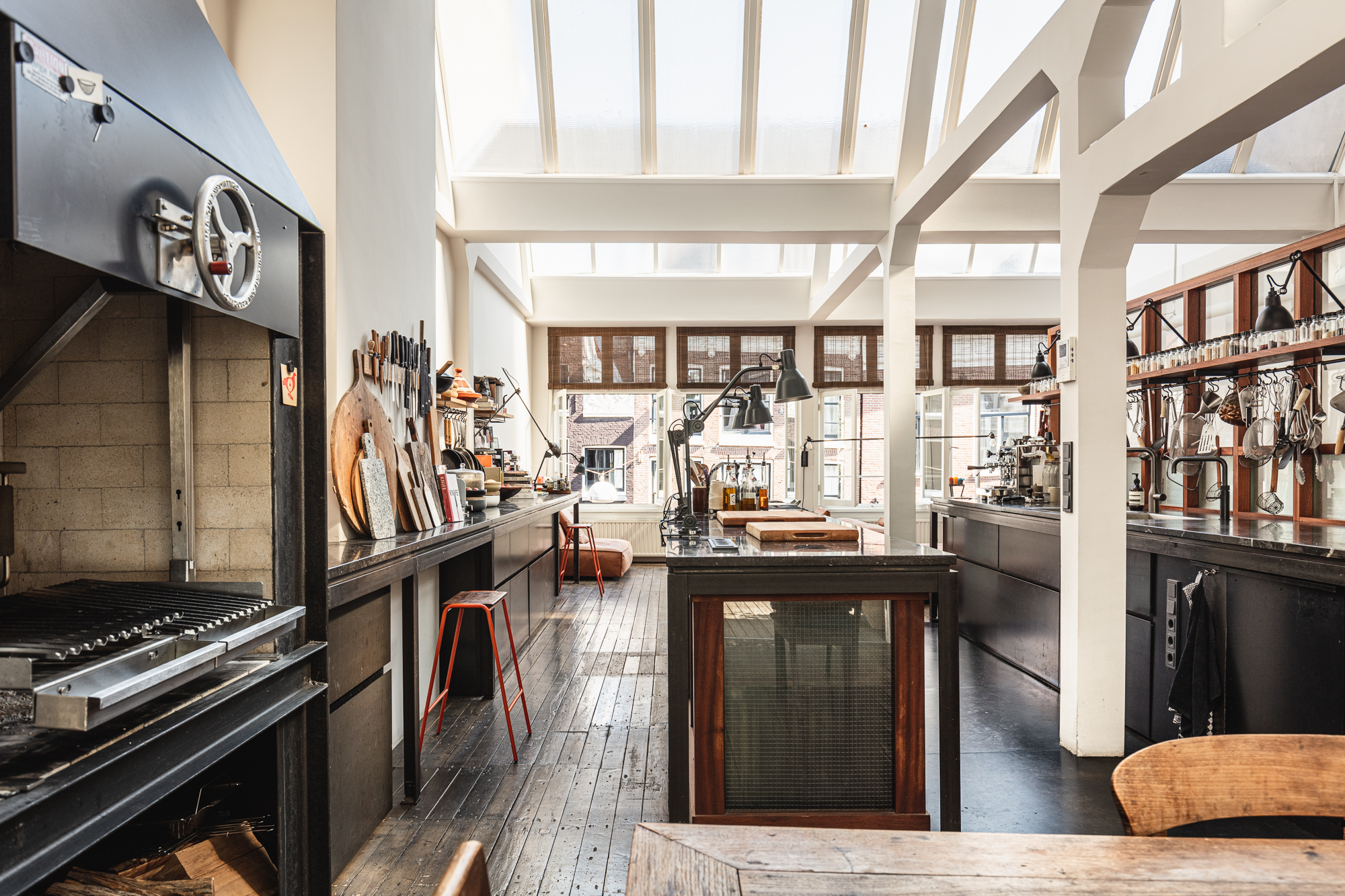 'Alle vaste meubilair, de badkamerinrichting en het staalwerk zijn voor dit huis op maat ontworpen in een combinatie van mahoniehout en zwart staal.'