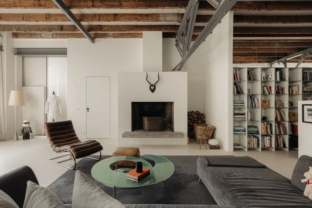 ‘Deze lichte, zonnige loft biedt een unieke combinatie van openheid en gezelligheid, met slim ontworpen individuele ruimtes die zowel modern als historisch aanvoelen. Hoewel het technisch gezien een appartement is, functioneert het meer als een zelfstandig huis zonder directe buren en heeft het een prachtige historische gevel gecombineerd met een eigentijdse New York-stijl loft interieur. Oorspronkelijk een autoschildergarage, behoudt de ruimte een industriële charme met hoge plafonds en een vleugje van het verleden. De grote, veelzijdige ruimte biedt verschillende comfortabele settings, van lezen in de bibliotheekhoek met uitzicht op het groene buiten, tot genieten van de grote open haard in de winter, die een chaletgevoel oproept. De open keuken is perfect om gasten te ontvangen, terwijl de wijnkelder ook dienstdoet als een gezellige trattoria voor diner bij kaarslicht. Het dakterras voegt een extra speciaal element toe.’