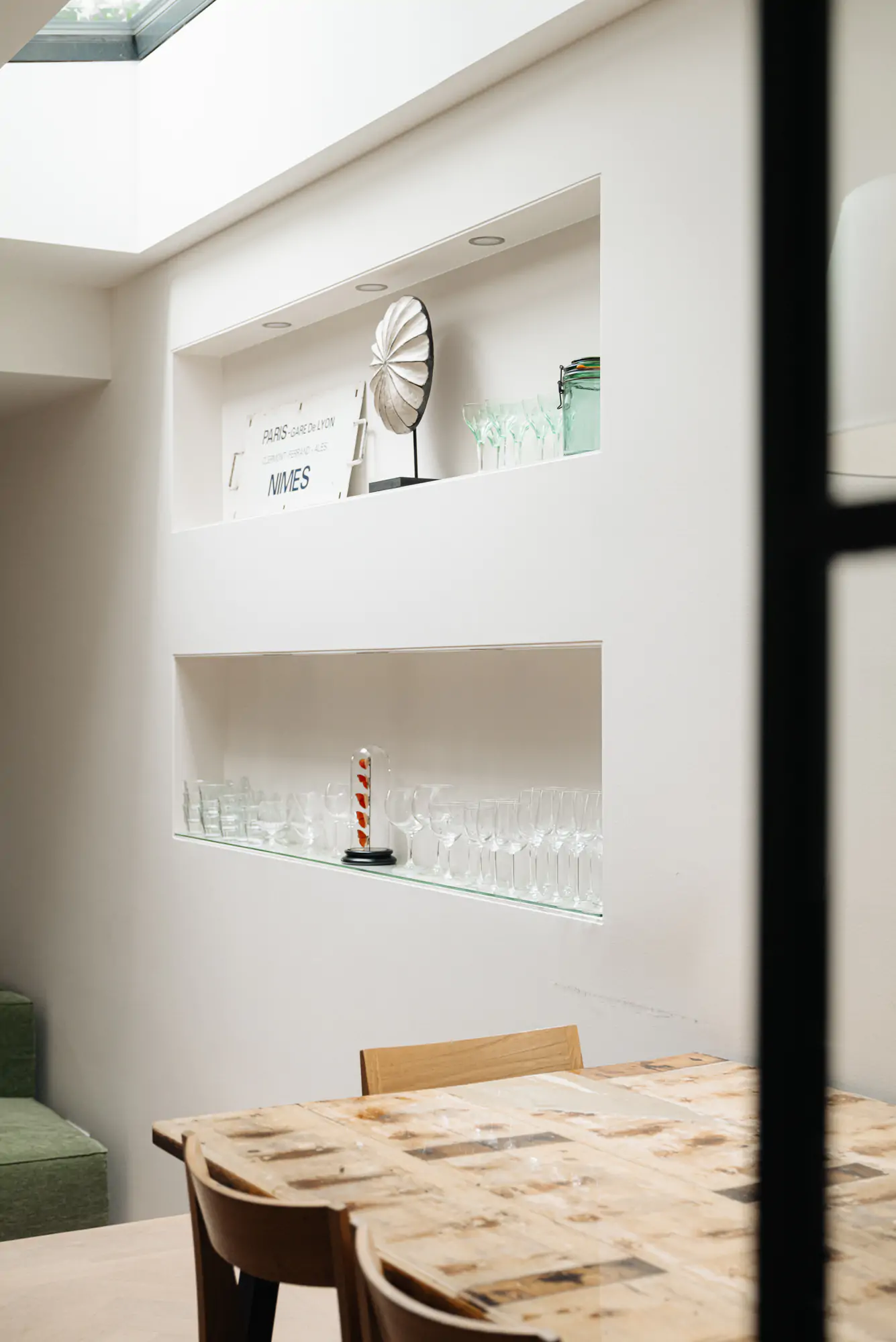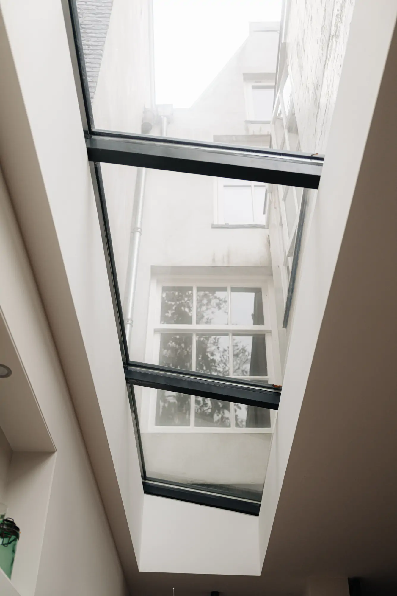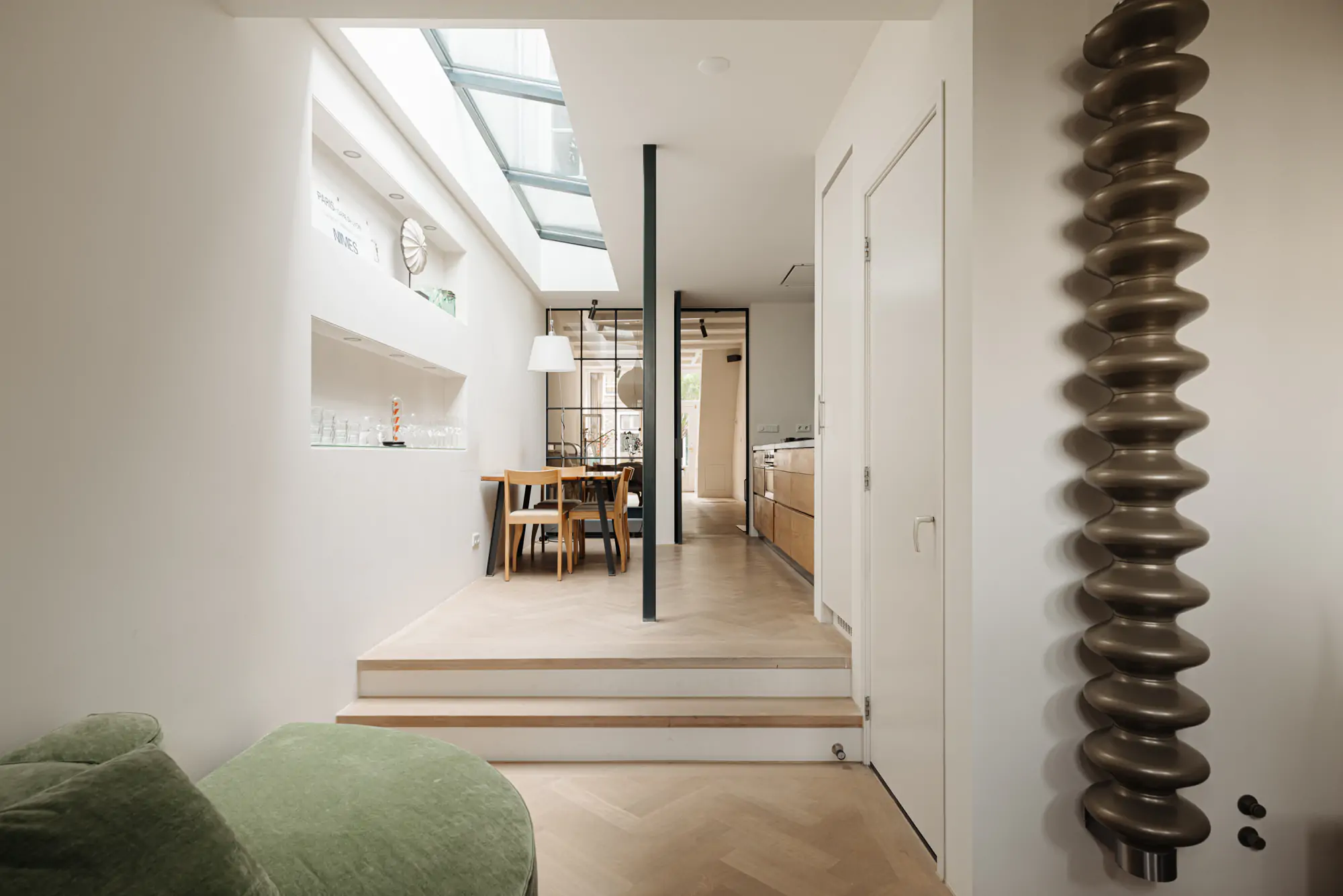 De woonkamer is gebruikt als galerie, voor feestjes en etentjes. Als het kouder is met een vuurtje in de houtkachel. De sfeer is sereen door het hoge plafond maar ook omdat skateboards en hockeysticks, vaak letterlijk, in het souterrain worden gegooid. Evenals de roeimachine en alle spullen die je nog niet wil of kan weggooien.’