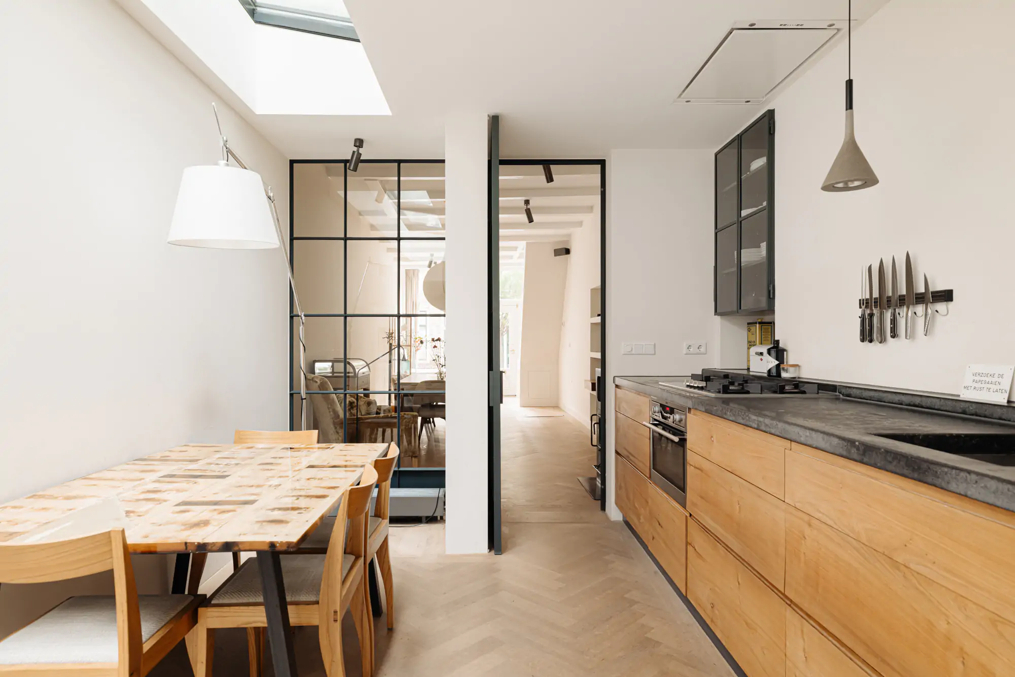 ‘De kinderen zijn hier geboren, hebben leren fietsen op het Amstelveld en liepen zelf naar de basisschool. Nu als pubers zijn ze blij met de centrale plek met cafés, clubs en alle andere leuke dingen van Amsterdam. Inmiddels hebben ze een eigen verdieping met badkamer en wc wat de sfeer s ‘ochtends zeer ten goede komt.