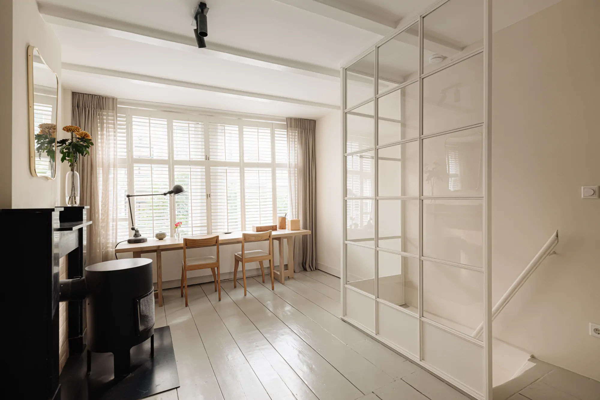 De eigen entree aan de voorzijde heeft een sfeervolle hardtenen buitentrap en geeft toegang tot het charmante en warme woonhuis. Aan de voorzijde is de voormalige winkel ruimte met de grote eettafel en gezellige houtkachel.De centrale ruimte aan de voorzijde bij de entree vormt de as van het huis, daar waar kinderen hun huiswerk maken, spelletjes spelen of ouders bij de gezellige haard natafelen of zaterdagochtend uitgebreid de krant lezen.