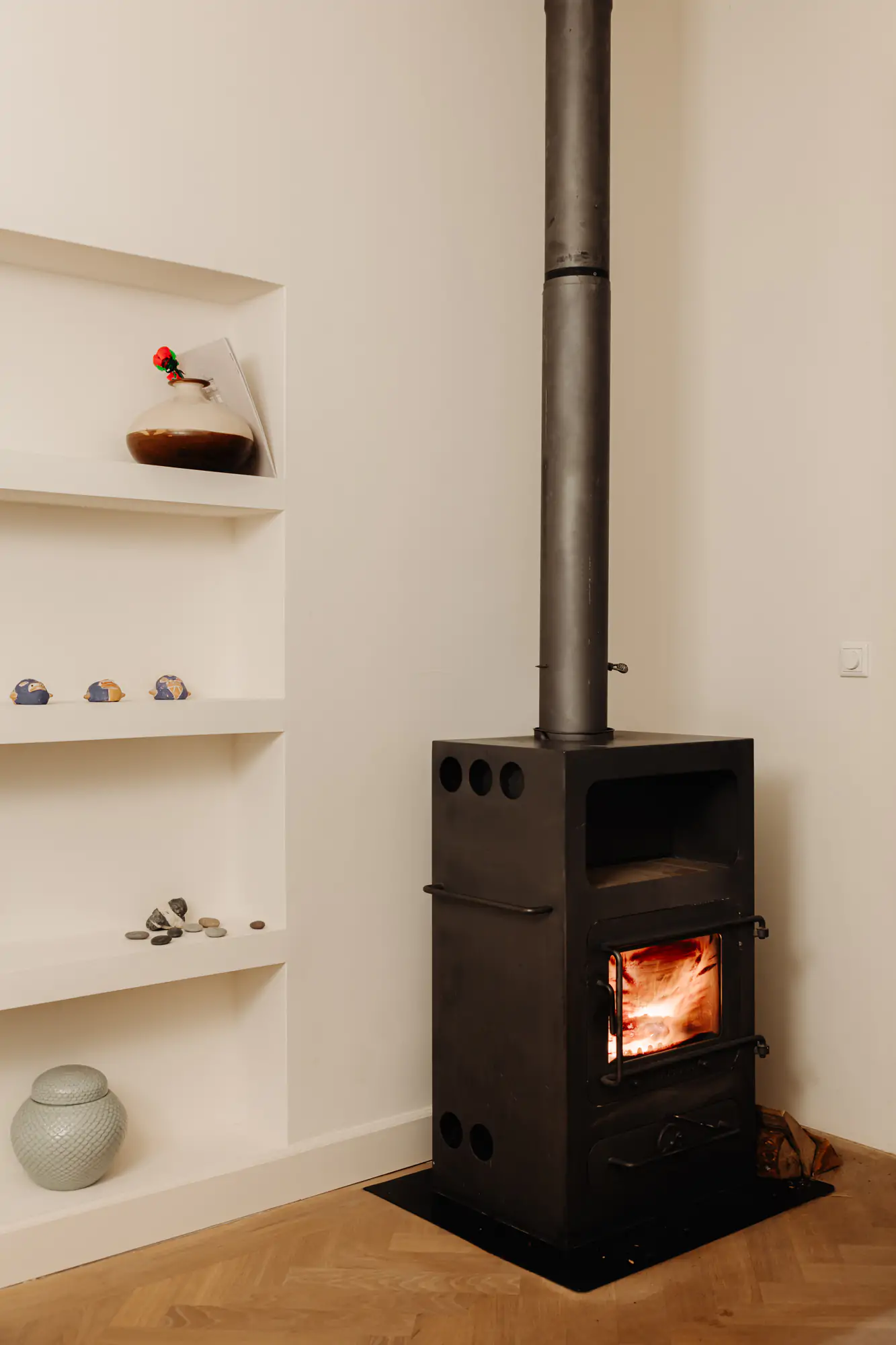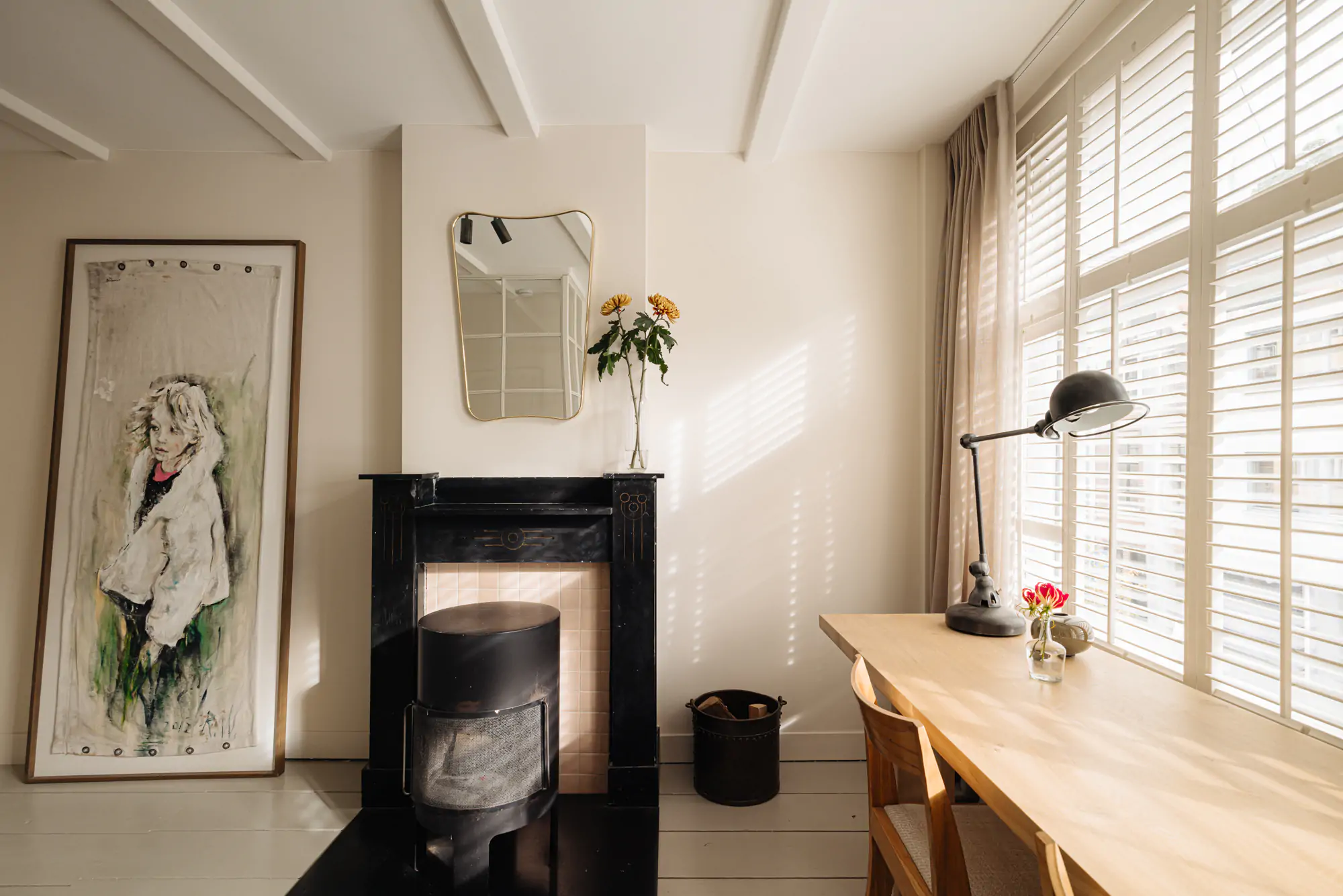 'De woonkamer is gebruikt als galerie, voor feestjes en etentjes. Als het kouder is met een vuurtje in de houtkachel.'