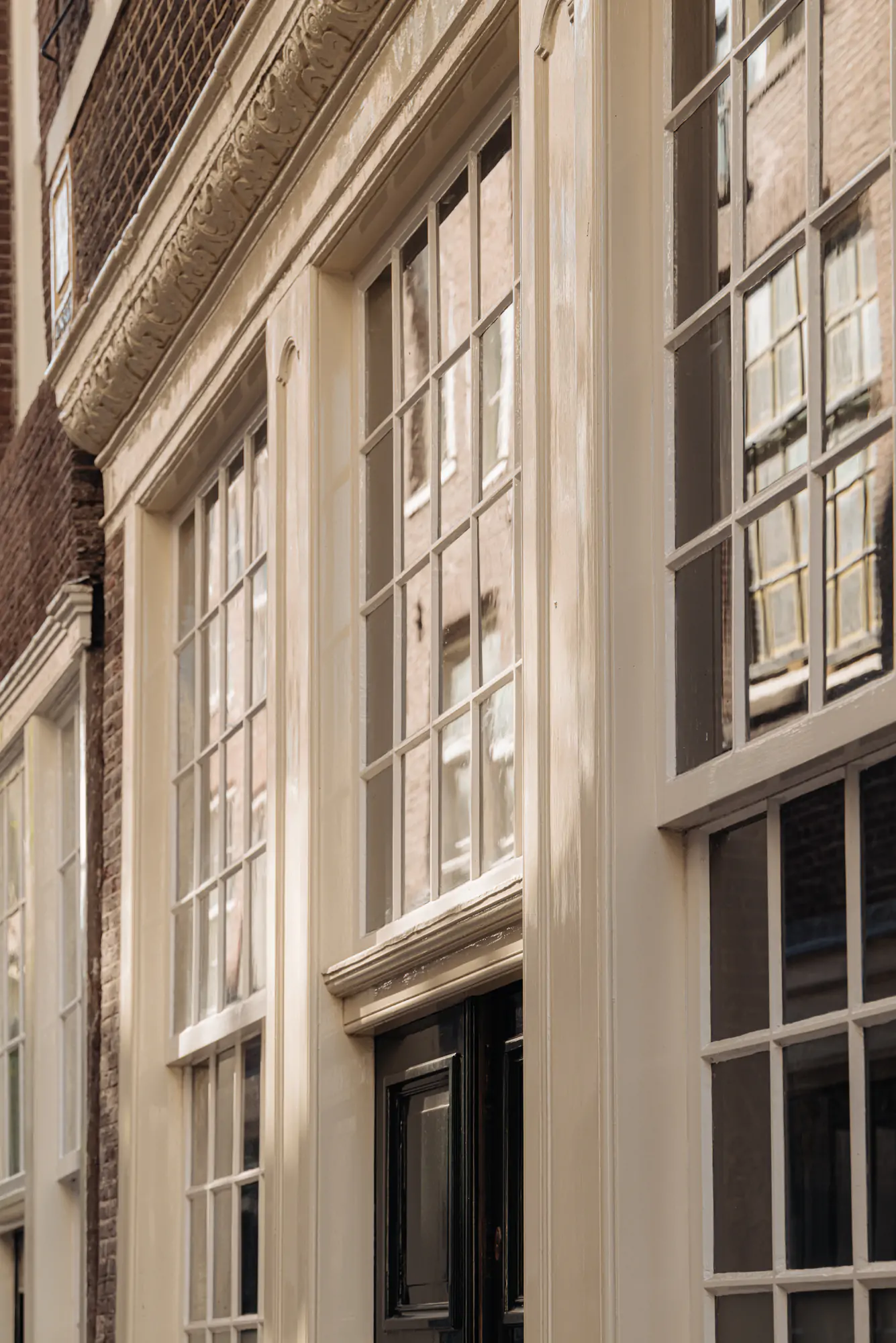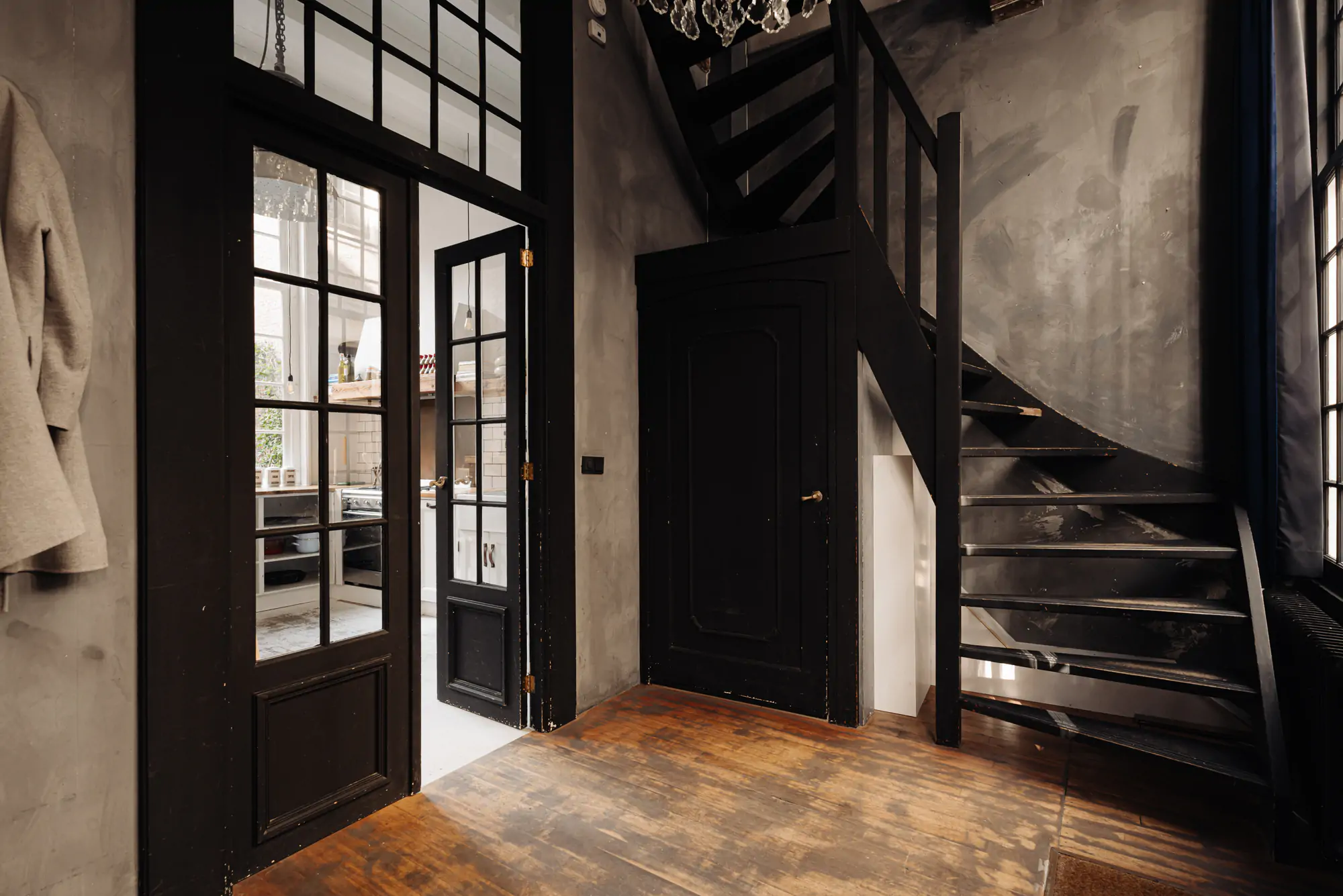De woning heeft een fraai gedetailleerde voordeur die toegang geeft tot een ruime hal. De hal heeft een hoog plafond met balken, wat meteen een historische sfeer oproept. Vanuit de hal leiden openslaande deuren naar de achtergelegen woonkeuken, in de hal bevindt zich ook de trap naar de bovengelegen verdiepingen. De woonkeuken baadt in een oase van licht dankzij de grote en hoge ramen aan de zuidzijde, met uitzicht op de tuin.