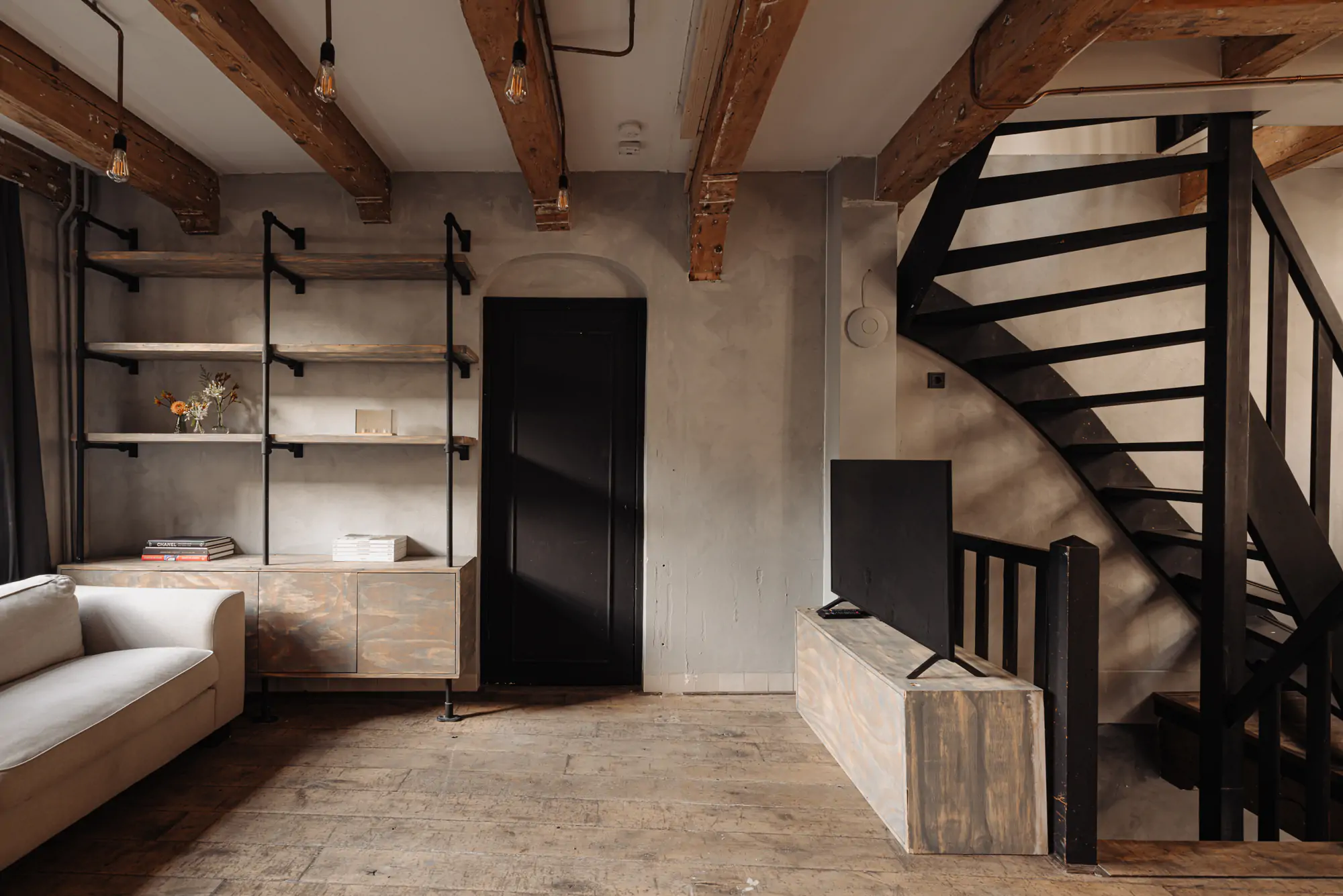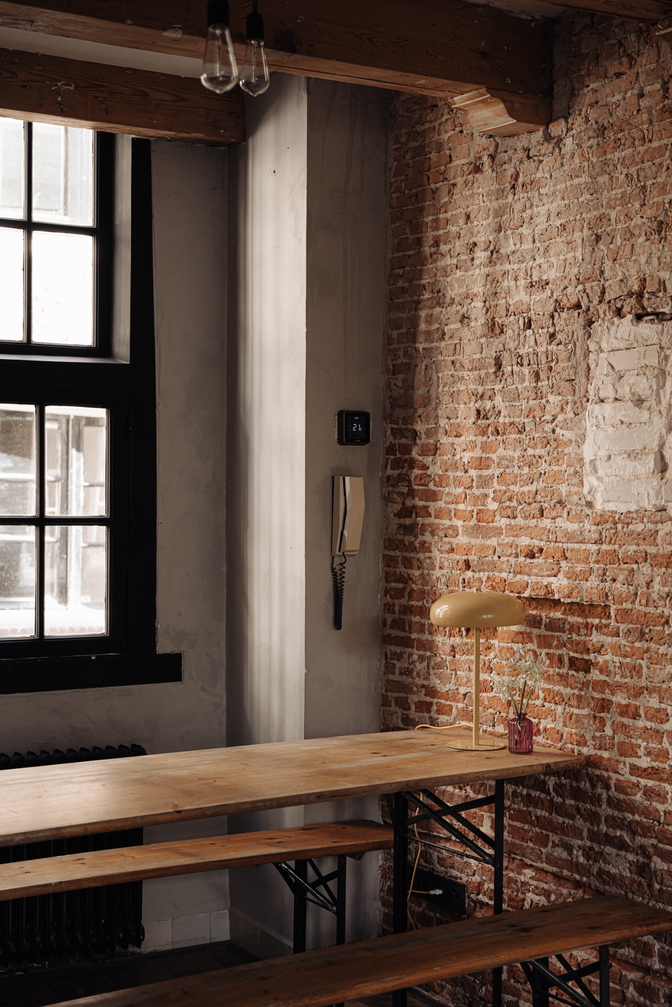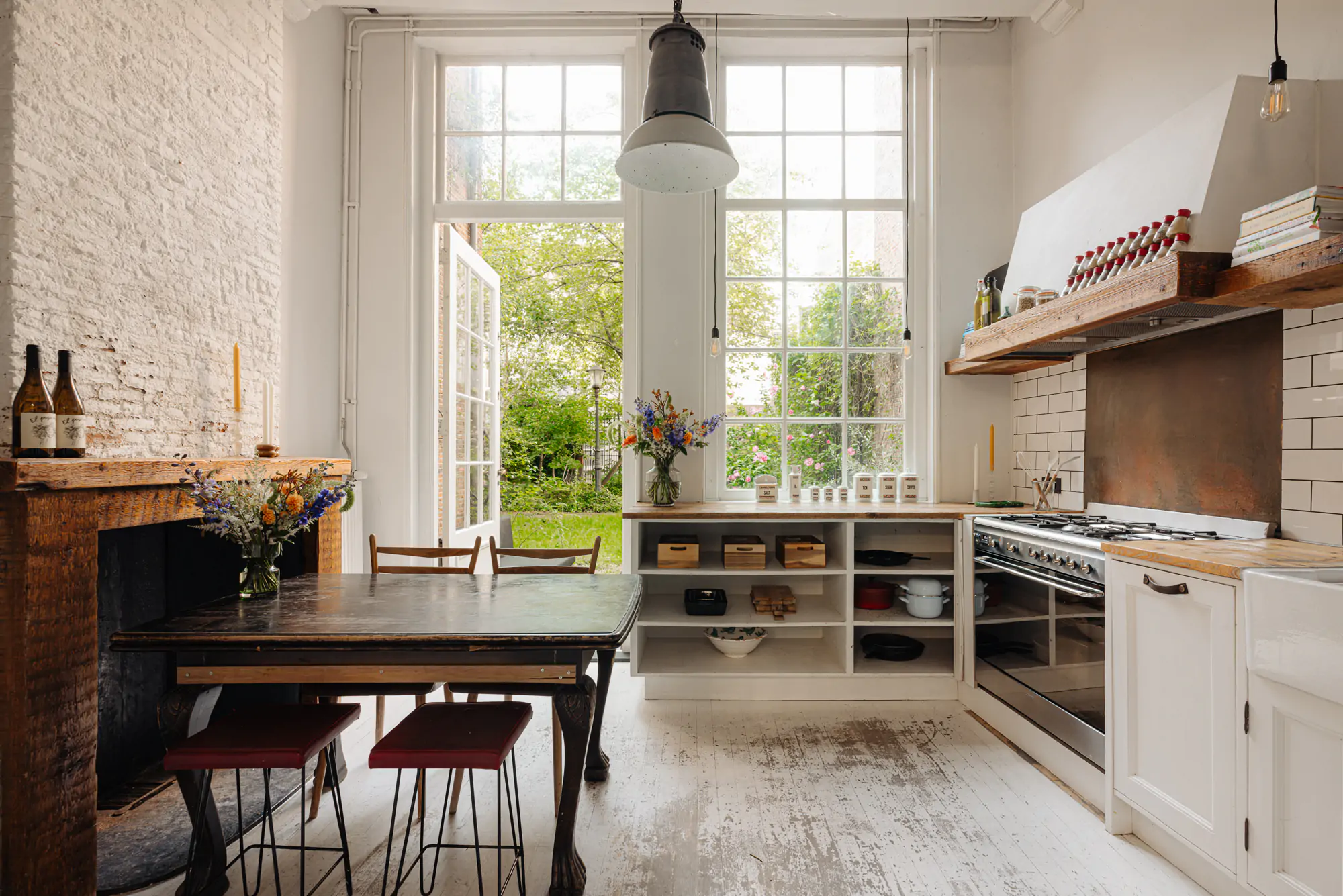 De prachtige vloerdelen en het balkenplafond op de eerste verdieping dragen bij aan de sfeer van vroeger. De verlichting is creatief aangebracht met behulp van koperen buizen. Nissen en metselwerk bevestigen bovendien het rijke historische karakter.
