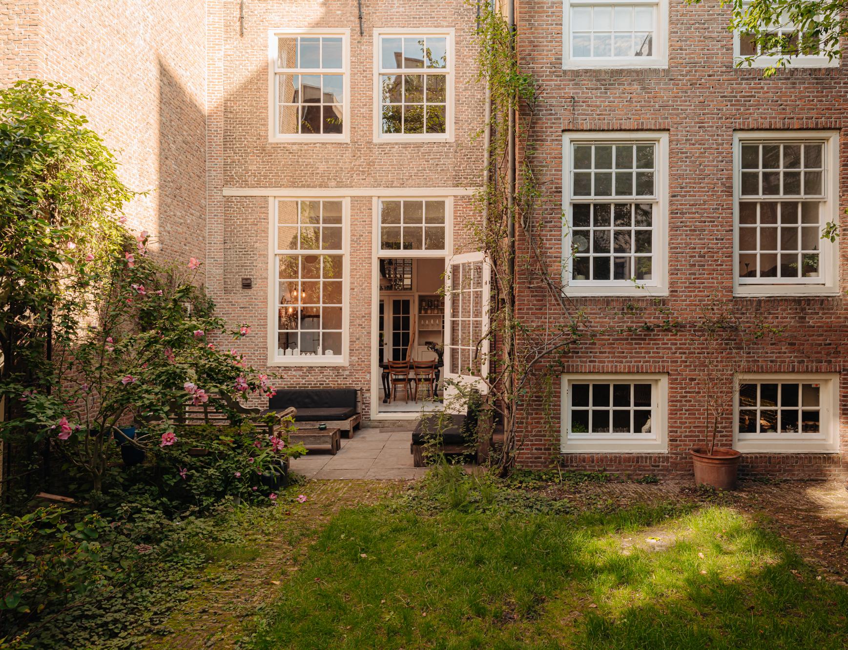 Deze tuin wordt gedeeld met de buren en vormt een gemeenschappelijke hofjestuin. De tuin is georiënteerd op het zuiden en omgeven door groen, waardoor deze een oase in de stad biedt. Voor fietsen is er een achterom via de Suikerbakkerssteeg die afgesloten is voor publiek met een grote open schuur annex fietsenhok.