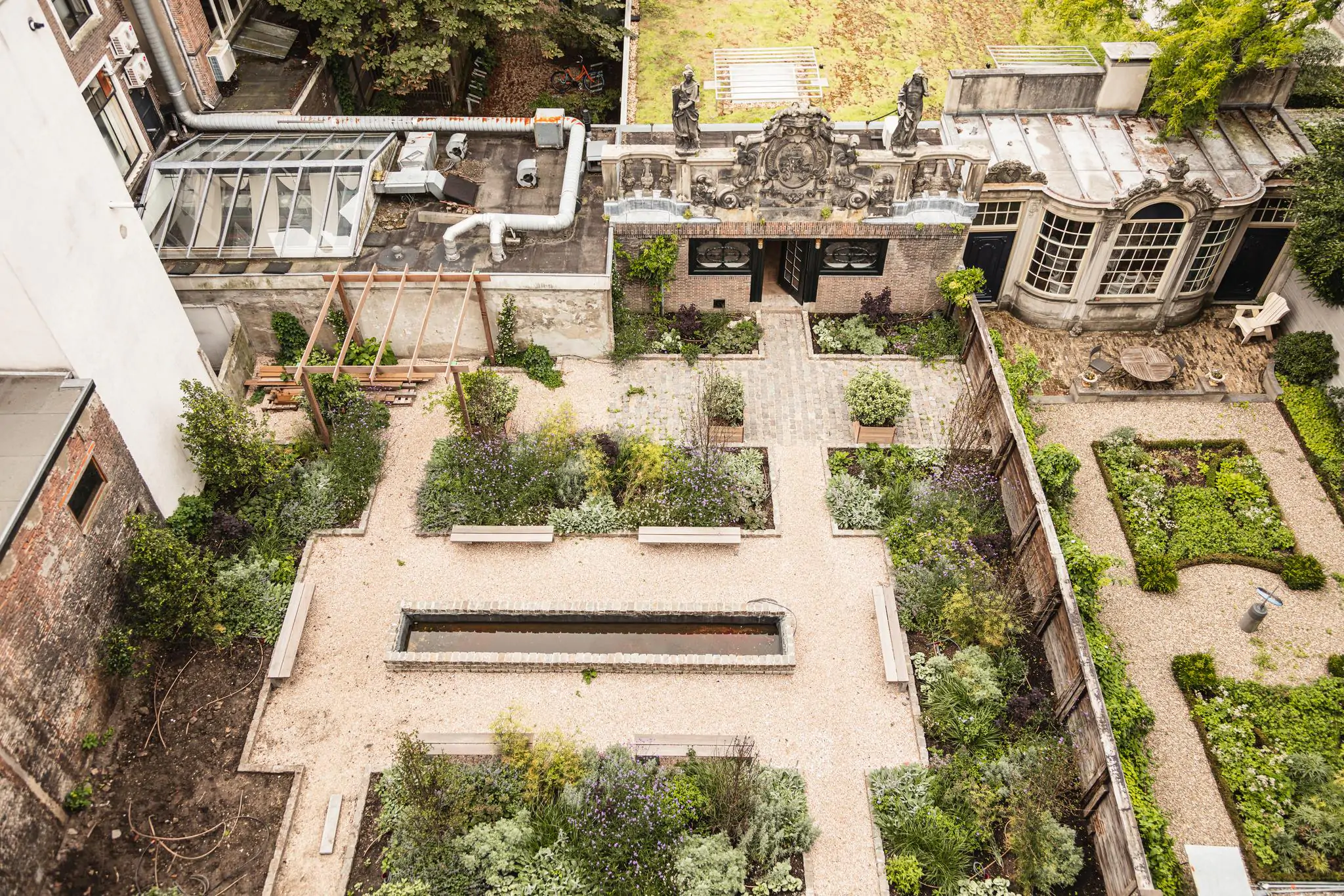 Achter het monumentale pand van Herengracht 286 bevindt zich een prachtige zeer ruime tuin, compleet met een sfeervol tuinhuis en een elegante waterfontein. Deze tuin, op het westen, biedt een oase van rust en schoonheid te midden van de drukte van de stad. Bovendien is er een goed uitgeruste fitnessruimte inclusief douchefaciliteiten aanwezig.