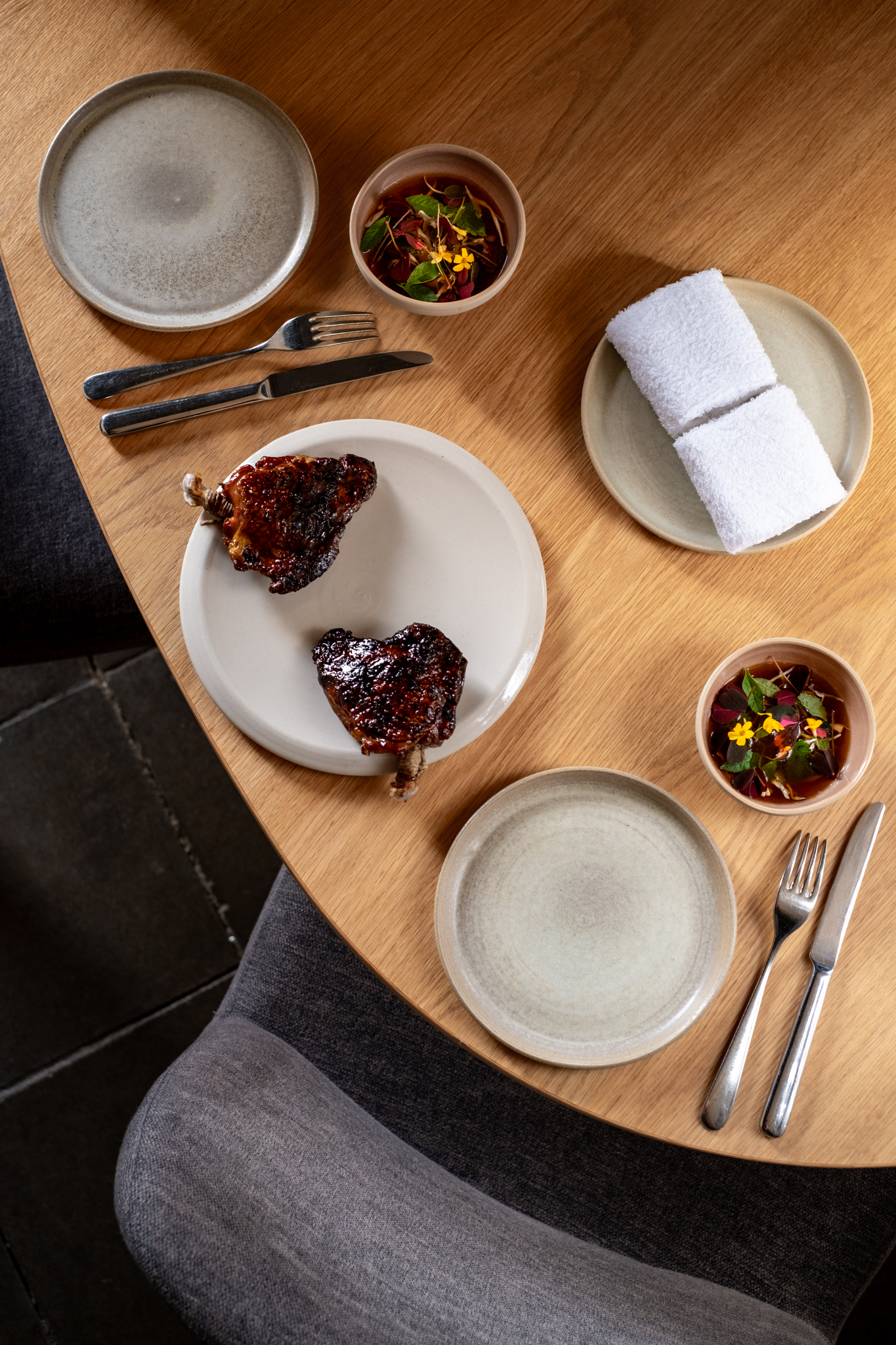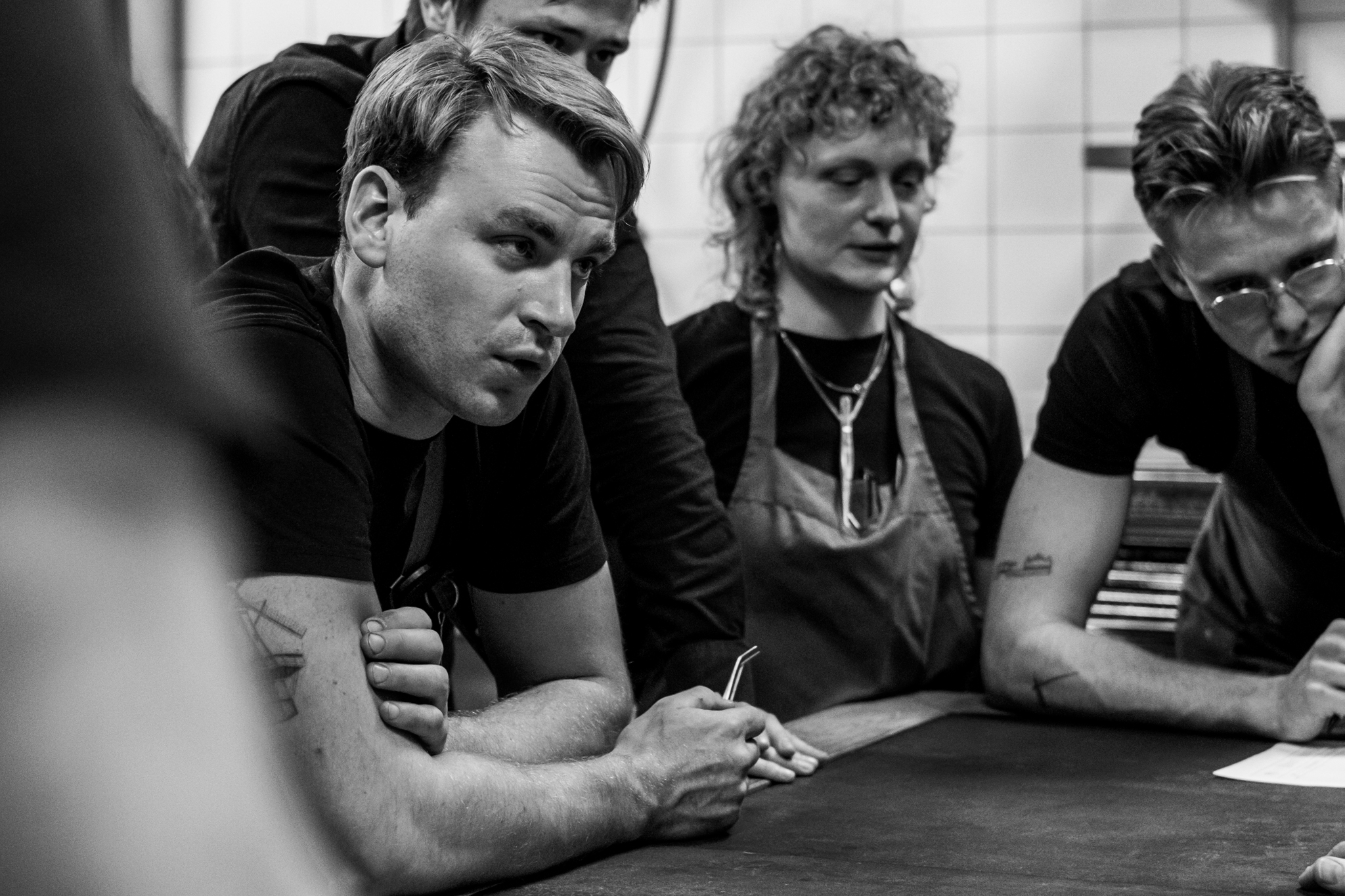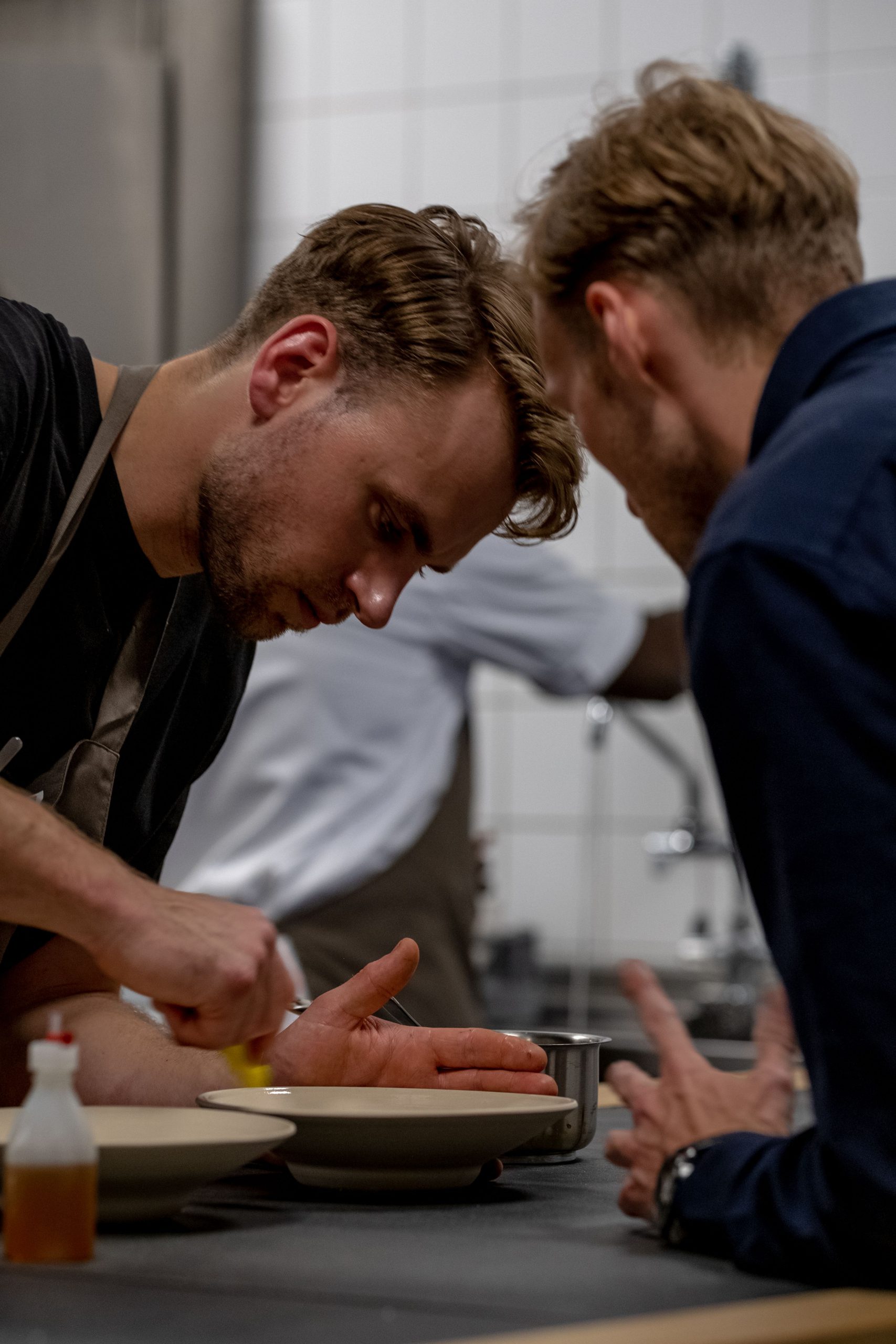 ‘We willen er zelf liever geen label op plakken. Het zou ons naar ons gevoel te veel beperken. Groenten spelen een belangrijke rol in onze gerechten, proteïnen komen op de tweede plaats. De bereiding op de barbecue is heel belangrijk. Bij ieder menu komen wel 3 of 4 gerechten van de grill. Het geeft smaak en het is een fijne manier van koken. Alles wat van de grill komt geeft een fijn verzadigend gevoel. Dat is ook comfort. Verder umami en fermentatie. We hebben een eigen fermentatie kamer en maken zelf onze miso’s, garum en koji. Dat zorgt voor de smaak en diepte in onze gerechten. Zo heb je ook niet al teveel ingrediënten nodig voor een gerecht. Een spitskool van de barbecue met een mooie lak is al voldoende. Frisheid en verteerbaarheid is ook heel belangrijk in onze keuken. Na een menu moet je nog ruimte hebben voor de friandises. Het is misschien wat vroeg, maar ik denk dat we wel al een paar signature dishes hebben. Tarbot van de grill met saus van zijn eigen gerookte graten. Asperge carbonanara, een pasta van witte asperges in een gepekelde eierdooiersaus. De financiers gaan we ook niet meer wegdoen’.