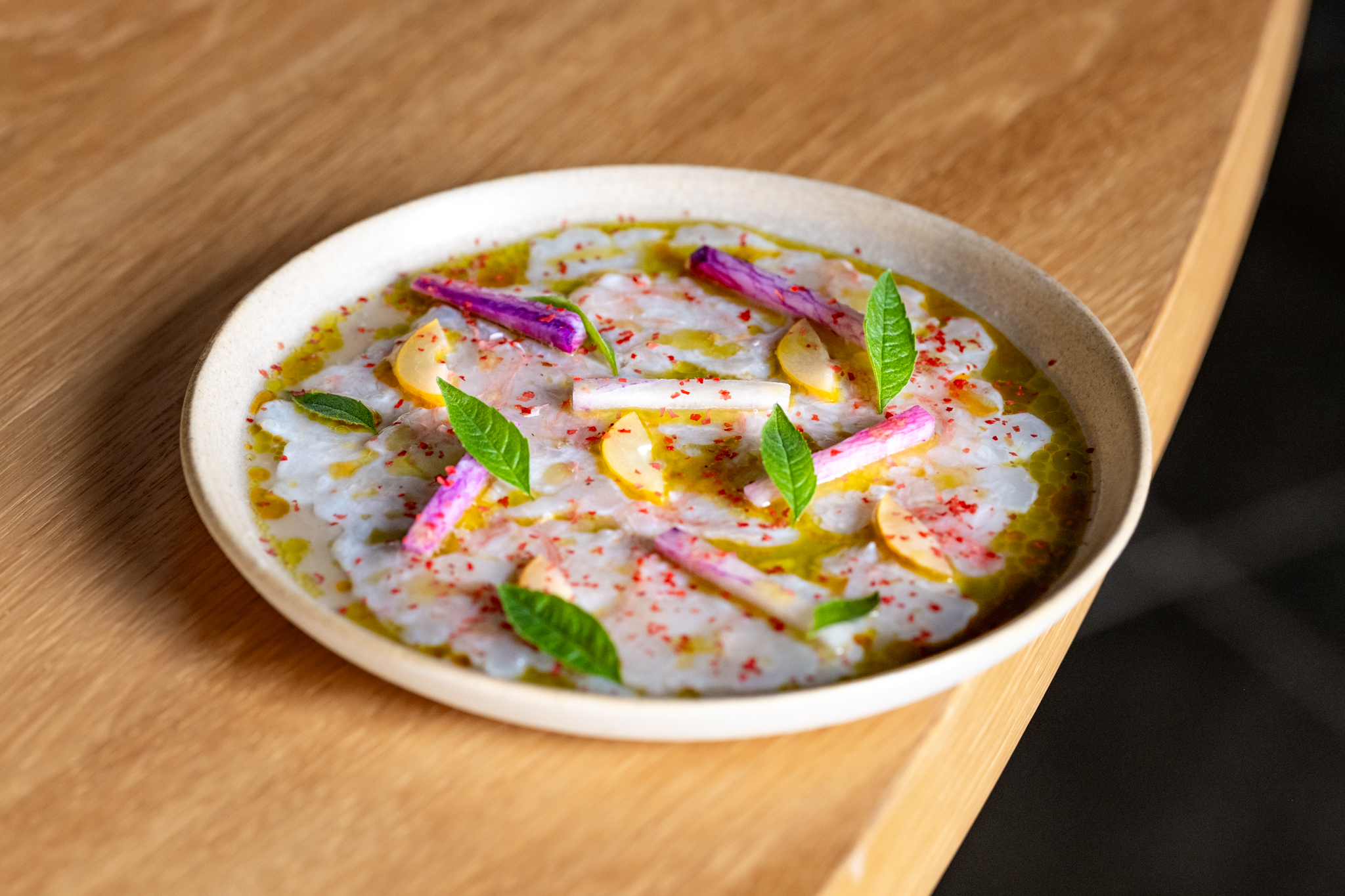 ‘De samenstelling van de wijnkaart en de pairing doen we met elkaar. We doen alleen Europese wijnen. Er is hier zoveel moois beschikbaar dat wij het niet nodig vinden om de wijnen uit bijvoorbeeld Zuid-Afrika te halen. Het is een mix tussen klassiek en modern. 50% klassiek, 30% soft natuur en 20% funky wijnen. We willen gewoon de wijnen op de kaart hebben staan die we zelf ook drinken. De paring weerspiegelt eigenlijk deze kaart. Verder vinden we het ook belangrijk dat de wijnkaart vanaf 40 euro begint. Ik denk daarbij altijd aan mijn ouders. Wat zouden zij voor een wijnen op de kaart willen zien’.