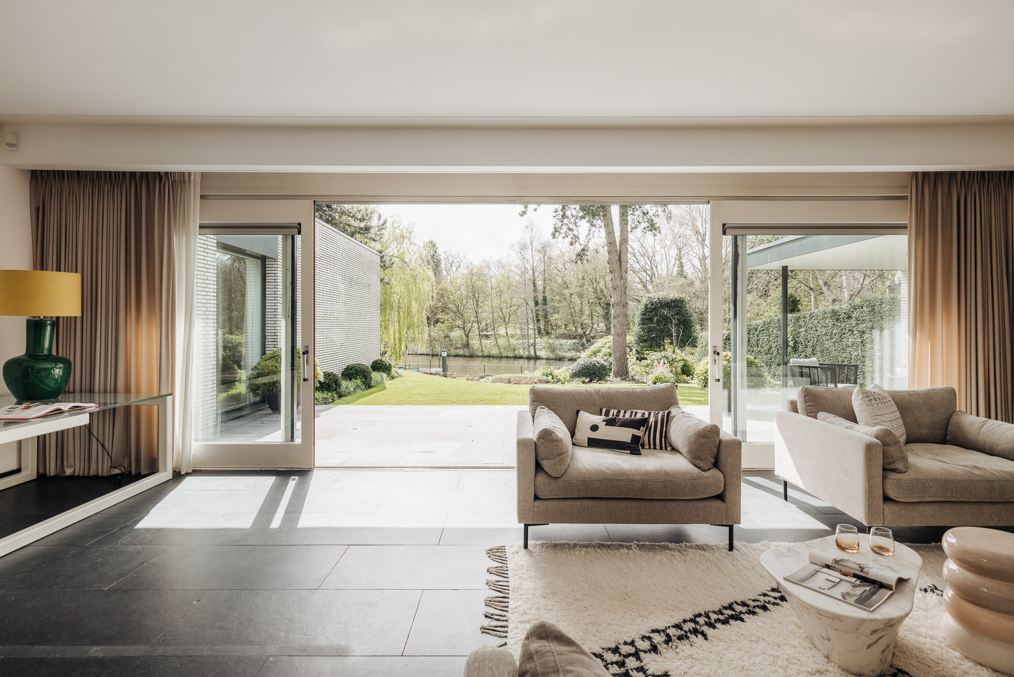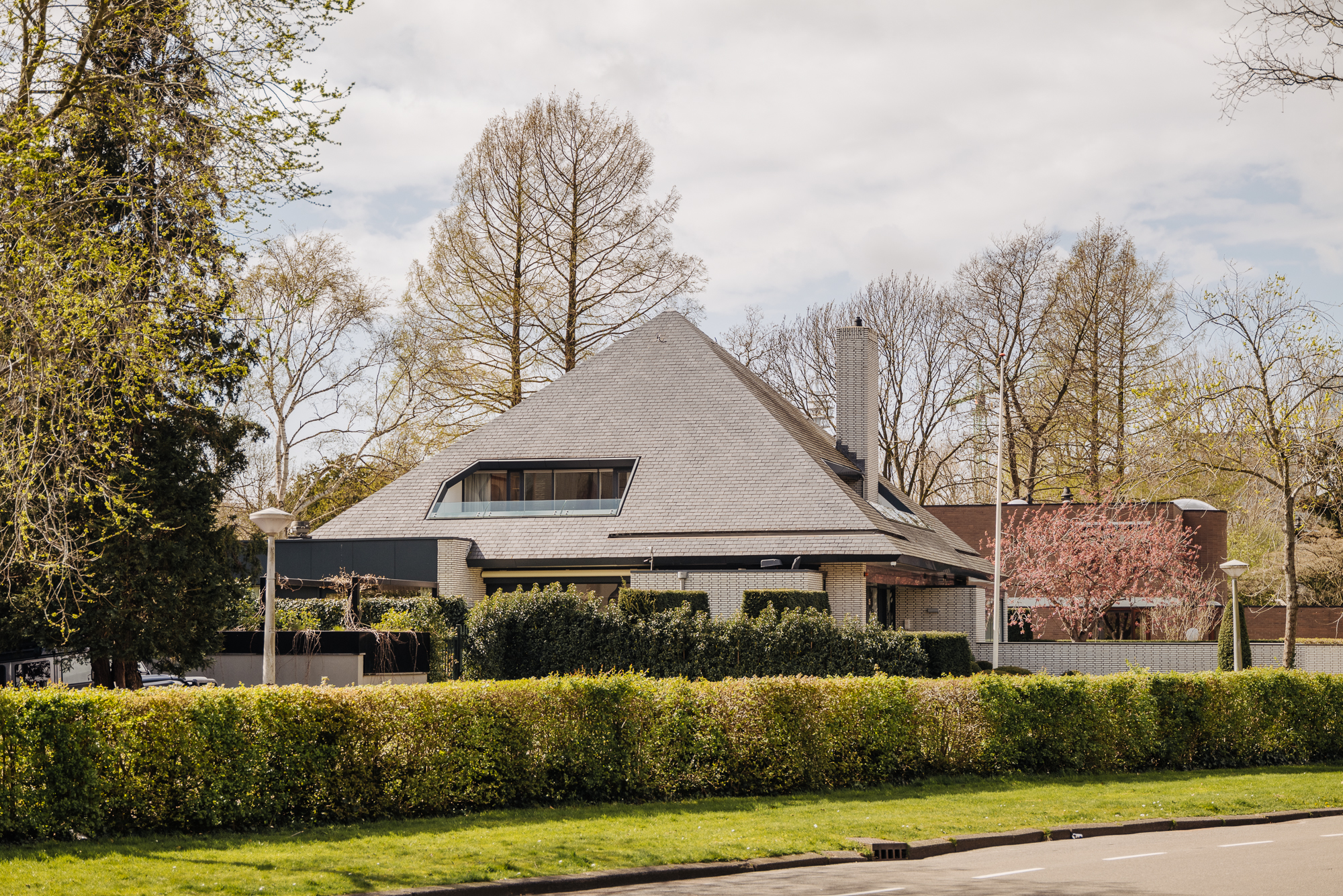 'Aan het water in het groen gelegen aan de rand van Amsterdam Zuid én de Zuidas. Vrij wonen in een villa met een eigentijdse uitstraling. Oorspronkelijk gebouwd in 1963 onder invloed van Amerikaanse architectuur, vergroot in de jaren tachtig is dit, met bijna 540 m² woonoppervlakte, parkeren en riante tuin aan het water.'