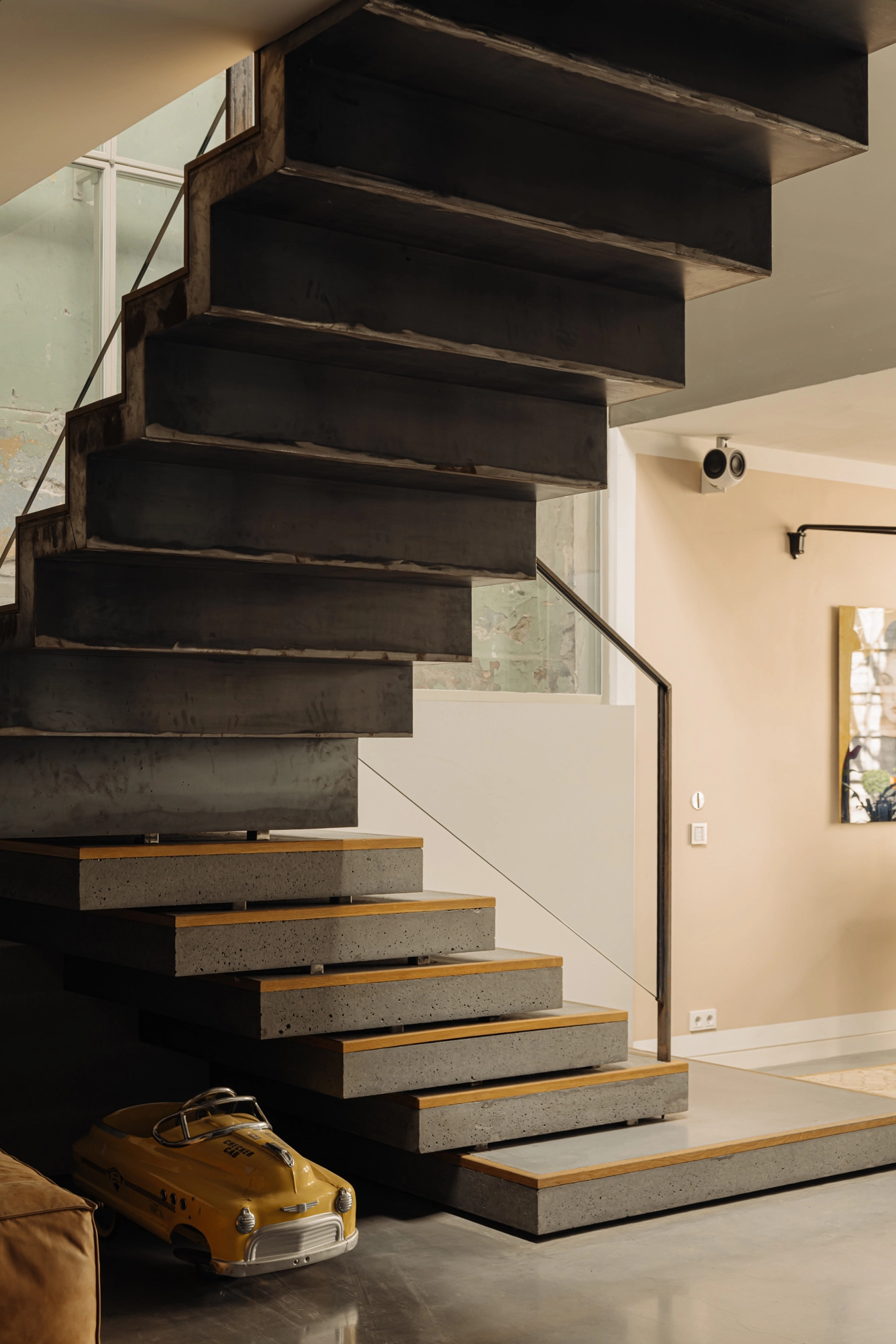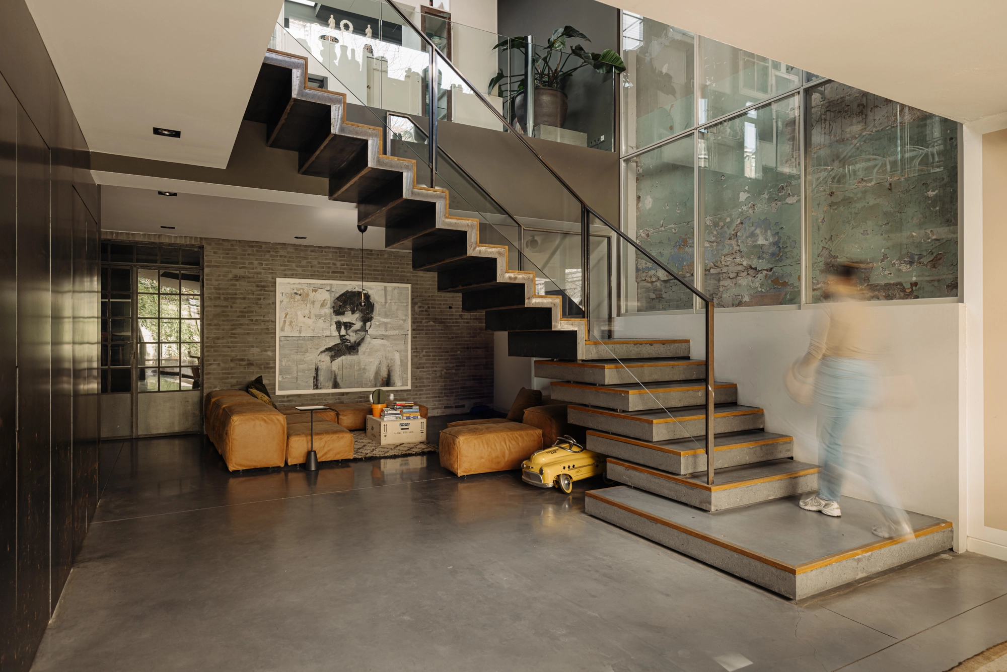 Het trappenhuis creëert met zijn vide een royale ruimtelijkheid en laat het licht vrij spel krijgen. De bouwmuur, als oorspronkelijk element van het pand, is als een sculpturaal object in het zicht gebracht en omlijst met een stalen frame voorzien van glas.
