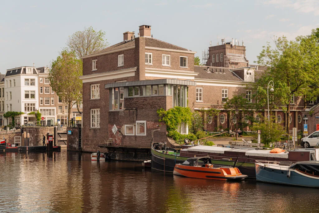 Voor ons is dit huis in alle opzichten bijzonder. De vorm, de ligging, het uitzicht—alles eraan is uniek. Er is geen tweede zoals dit in de stad. We wonen hier midden in Amsterdam, maar ervaren dagelijks de rust van een beschutte plek aan het water. Vanuit het huis kijken we uit over de Nieuwe Herengracht. ’s Ochtends horen we in de verte het zachte geritsel van Artis, terwijl de zon opkomt boven het langgerekte Entrepotdok. Het plein baadt dan in het ochtendlicht, en op de bankjes voor de deur zitten mensen te genieten van de eerste zonnestralen. In huis volgt het licht de stand van de zon: elk moment van de dag valt er ergens een andere gloed naar binnen. In de keuken dansen dan de reflecties van het water op het plafond—een spel van licht dat nooit verveelt. De kelder is een oase van rust, een plek om je even helemaal terug te trekken. Boven opent zich aan alle kanten het uitzicht—op het plein, het Entrepotdok en de gracht. Aan de voorzijde, bij het ronde raam, zitten we al vroeg in het voorjaar in de zon. De hele dag varen hier boten voorbij. Doordeweeks grote beroepsvaart, in het weekend een levendige stroom van plezierbootjes. We wonen in het centrum, maar zonder de drukte die daar vaak bij hoort. Geen toeristenmassa’s, geen eindeloze stroom rolkoffertjes. Wel de luxe van cafés, musea en restaurants op loopafstand, en tegelijk de vrijheid om de stad snel in en uit te rijden. Met de auto voor de deur, en het water letterlijk aan onze voeten. Artis voelt als onze achtertuin en vanaf de steiger stappen we zó in ons eigen bootje. Het Marineterrein ligt op steenworp afstand.