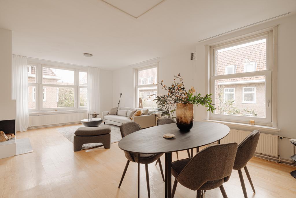 Het appartement is gelegen op de tweede etage en middels het verzorgde gemeenschappelijk trappenhuis te bereiken. De lichte woonkamer is gelegen op de hoek van zowel de Amazonenstraat als de Agememnonstraat, dit geeft een extra ruimtelijk gevoel. De dichte keuken is aan de achterzijde, de keuken is eenvoudig met diverse apparatuur. De ruimte is groot genoeg voor een klein ontbijtbarretje.