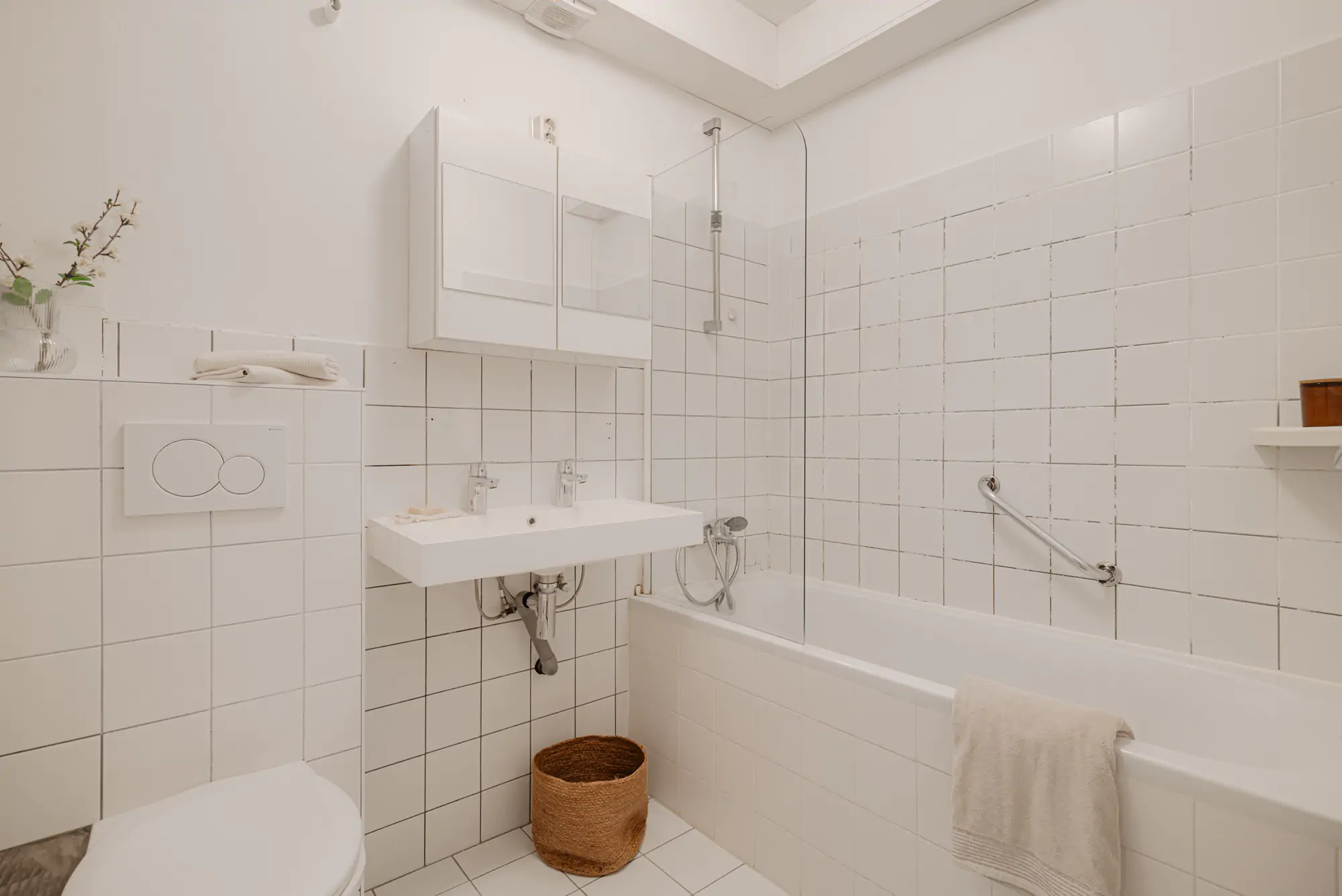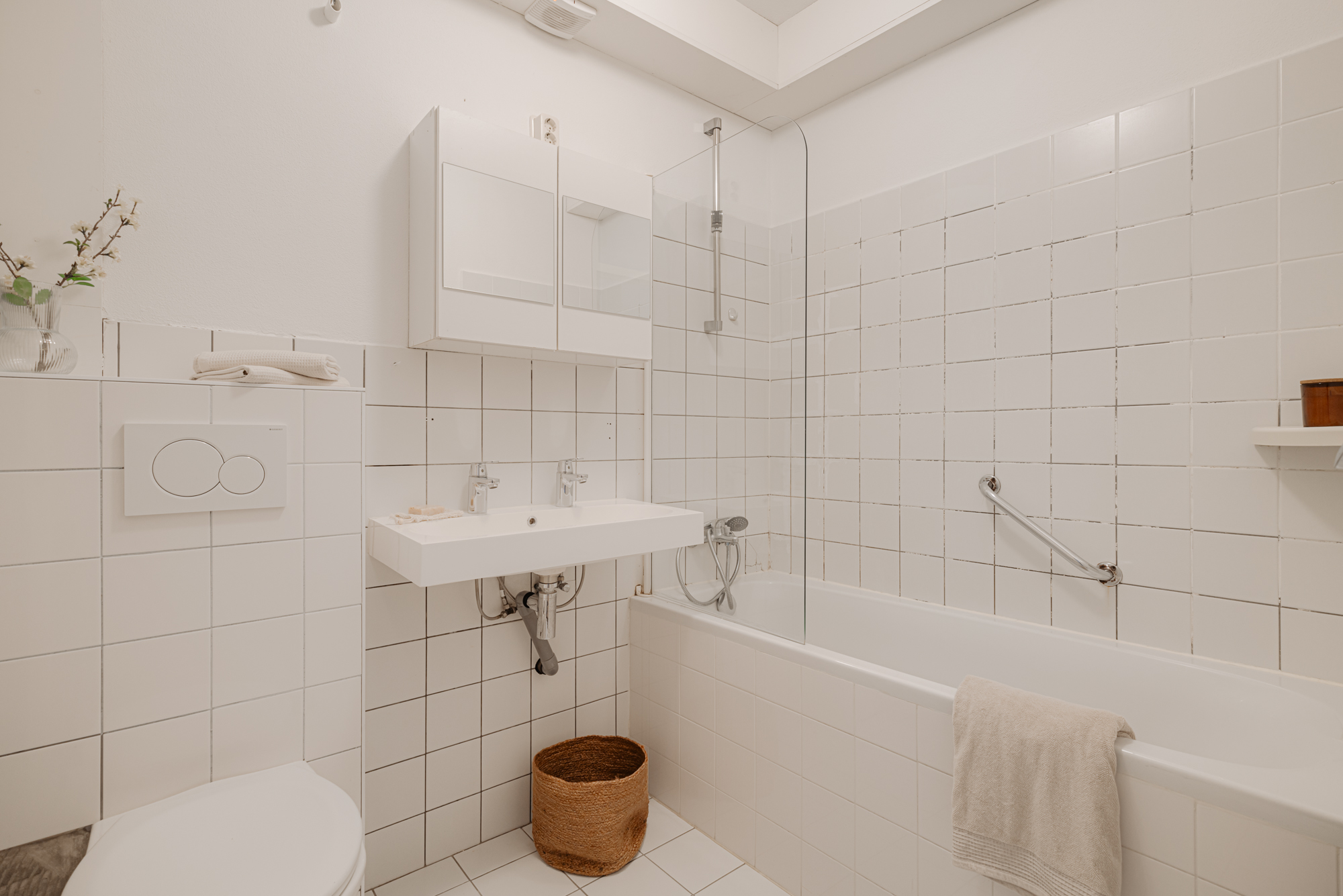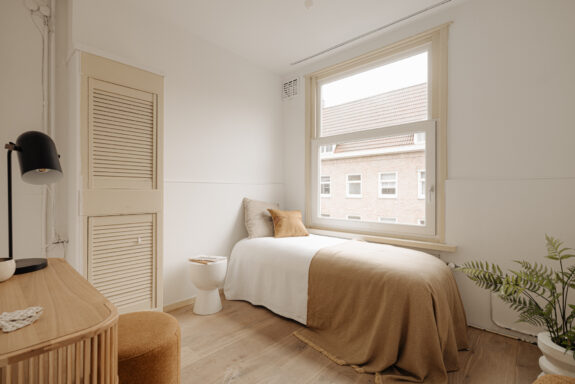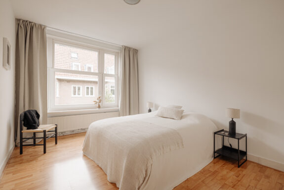 Er zijn twee goede slaapkamers, zowel aan de Agamemnonstraat als Amazonestraat. De badkamer is in een neutrale kleurstelling en heeft een bad/douche, wastafelmeubel en toilet.