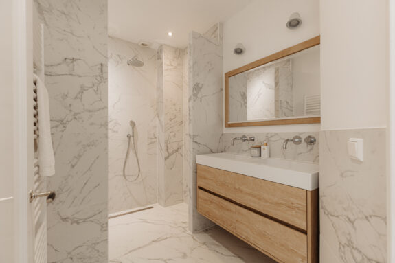 The modernized and inviting bathroom presents an elegant in-wall shower and a double sink, ensuring a serene and comfortable bathing experience.