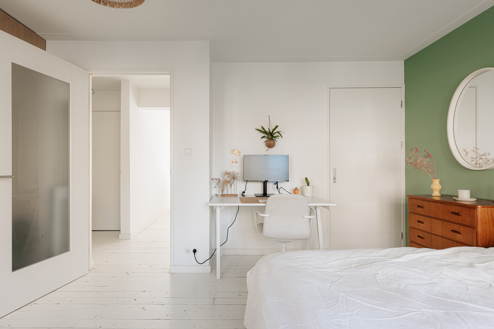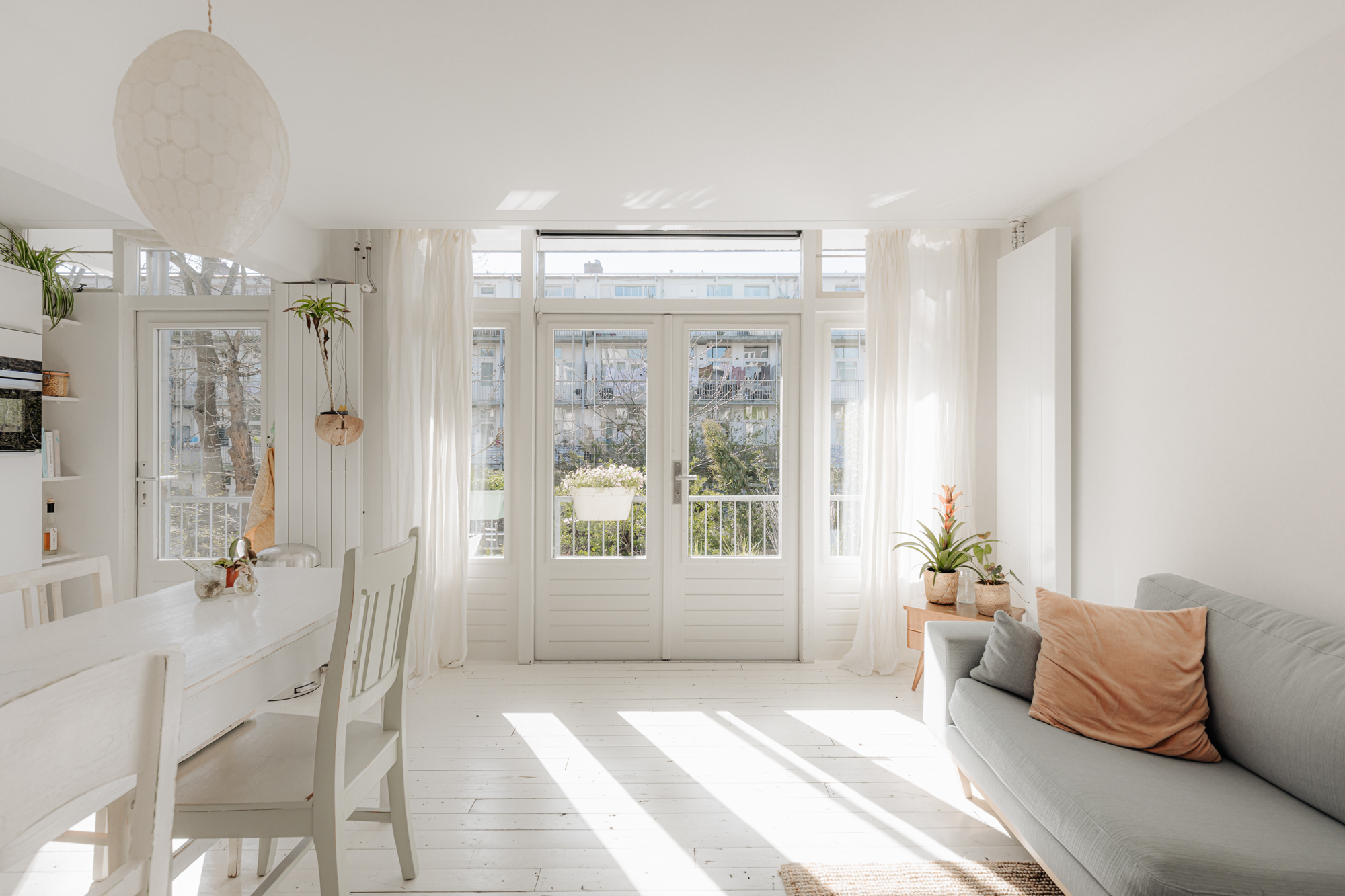 Mijn favoriete plekje in huis? Uh; van elk plekje kan ik genieten. Met uitzicht op buiten als ik op de bank een boek lees, aan de keukentafel met m’n laptop terwijl de zon naar binnen schijnt of op een zomeravond als mijn balkondeuren open staan en ik in mijn hangstoel op het balkon chill of met vrienden een borrel drink. Het is echt een stille oase in een drukke stad. De Jan van Galenstraat heeft de afgelopen jaren een enorme positieve ontwikkeling gemaakt en dat geldt eigenlijk voor de gehele wijk. Koffietentjes, sport en yoga plekjes, het opgeknapte park om de hoek en met uitvalswegen richting Haarlem/Zandvoort dichtbij en met de Jordaan op nog geen 5 minuten afstand kan je alle kanten op.
