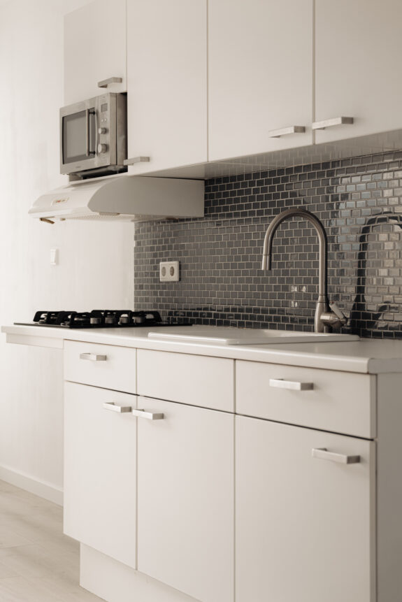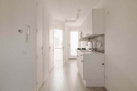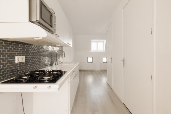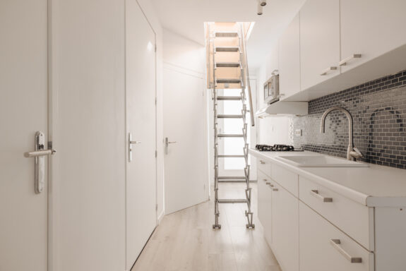 Access to the apartment is through the common entrance at the rear of the building, reached via an external staircase leading to the third floor. Once inside, you'll find a spacious hallway connecting to the bathroom, a storage/technical room, and a separate toilet. The living room with an open kitchen is situated at the front of the building, while the bedroom is peacefully located at the rear. The kitchen features built-in appliances, including a gas stove, microwave, and extractor hood. The bathroom, elegantly tiled in gray and white, is equipped with a shower enclosed in a glass cabin, a sink, and a toilet. For outdoor relaxation, a loft ladder near the front door provides access to the rooftop terrace, offering ample sun exposure and picturesque views of the surrounding buildings, as well as the iconic Westertoren. The apartment features neat laminate flooring throughout.
