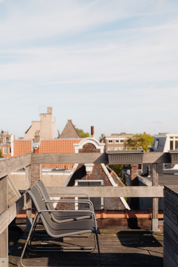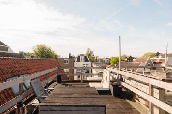 Situated on the third floor of a modern building constructed in 2009, this well-maintained studio apartment offers a living room with an open kitchen, a cozy separate bedroom, and a bathroom complete with a shower and toilet. Accessible via a loft ladder, you'll find a spacious rooftop terrace measuring approximately 20 m², where you can bask in sunshine all day. Located just around the corner from the apartment is Rozengracht, boasting a diverse array of shops for your daily needs. Within walking distance, you'll discover charming spots for coffee or drinks, including NU koffie & delicatessen, La Trattoria Di Donna Sofia, and Restaurant La Oliva Pintxos Y Vinos.