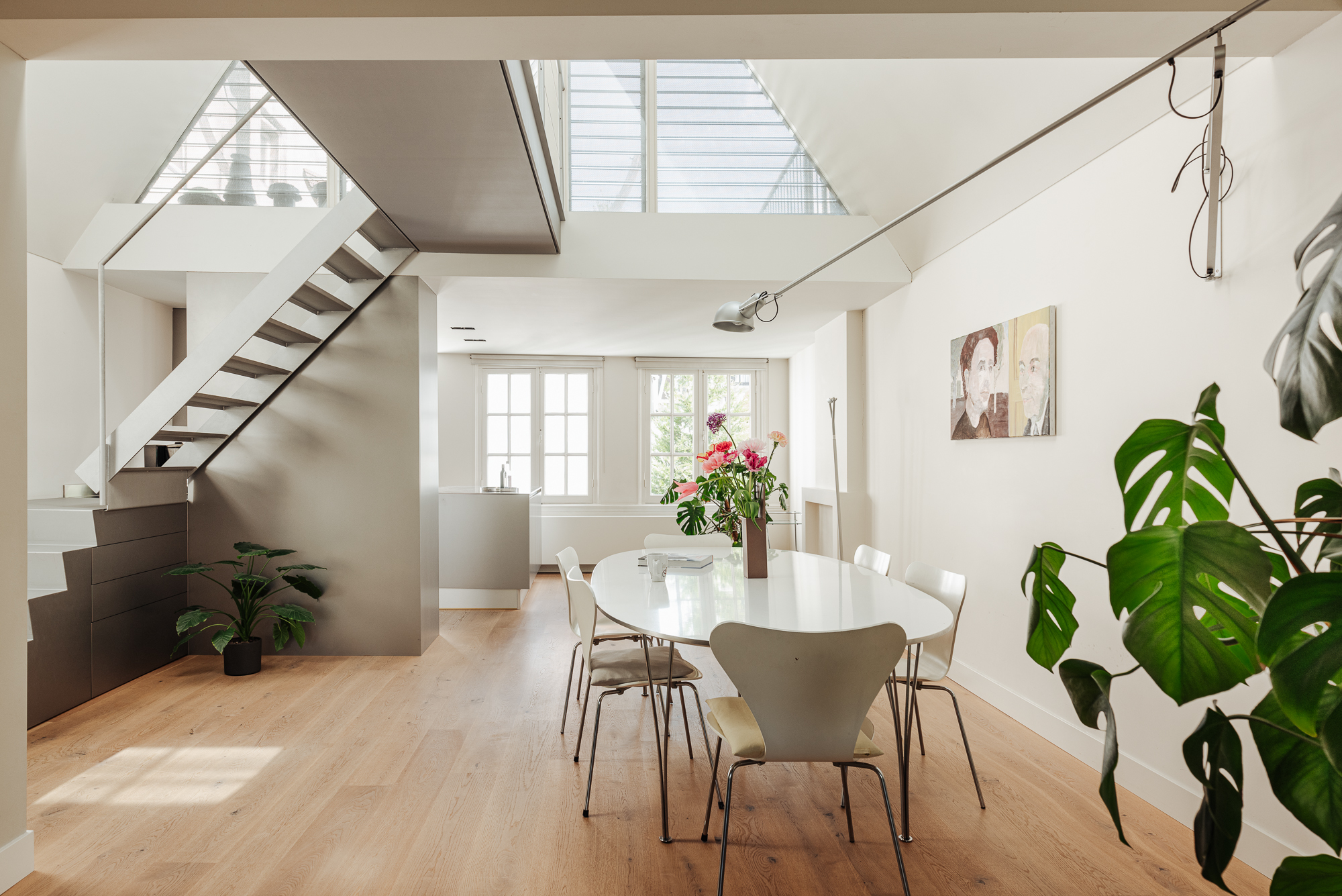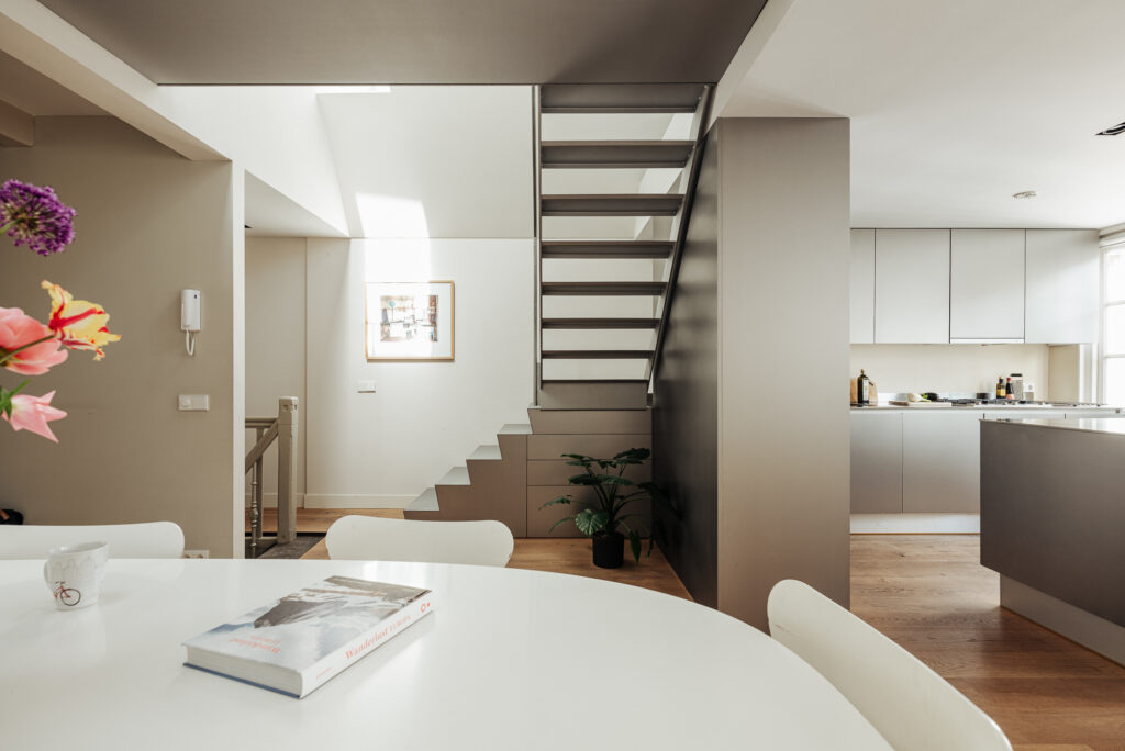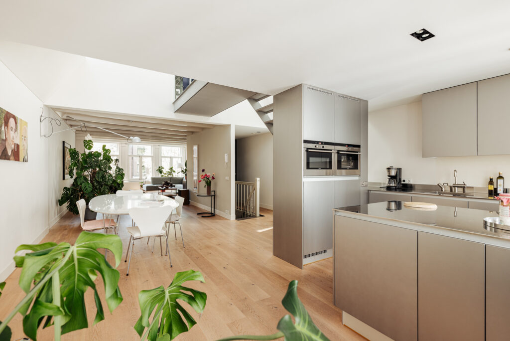 Moderne verbouwde etage, met een entree vanaf de eerste verdieping, die open en licht is met eveneens drie ramen aan de gracht. Aan de grachtzijde is een ruime zithoek gesitueerd. In het centrale gedeelte met een vide is ruimte voor een grote eettafel. Door deze fraaie vide is er extra licht en hoogte. Aan de achterzijde bevindt zich de moderne keuken met een eilandopstelling. De keuken is voorzien van diverse inbouwapparatuur. Over deze gehele verdieping ligt een fraaie eikenplanken vloer. Dankzij het licht, de verrassende vide en de maatvoeringen is het een hele prettige ruimte om in te verblijven.