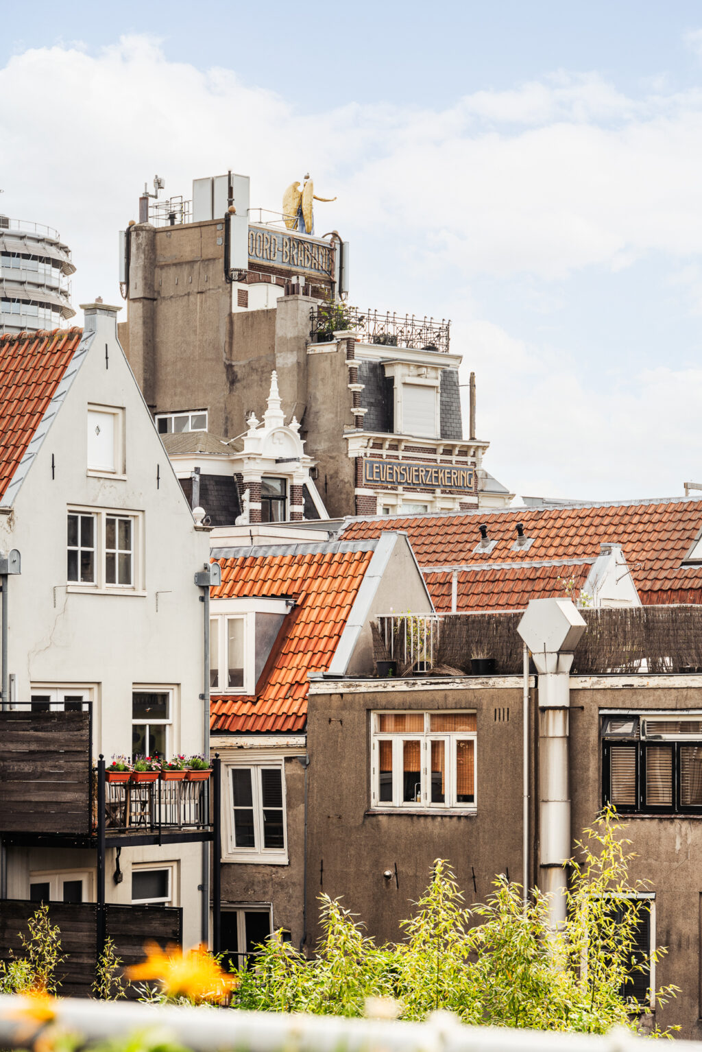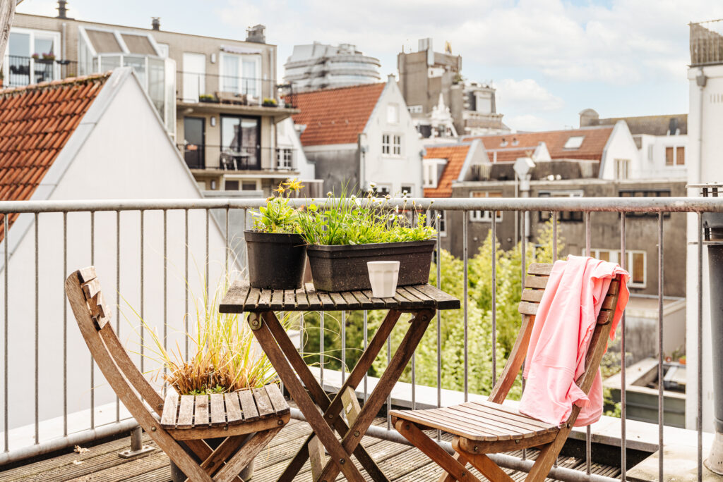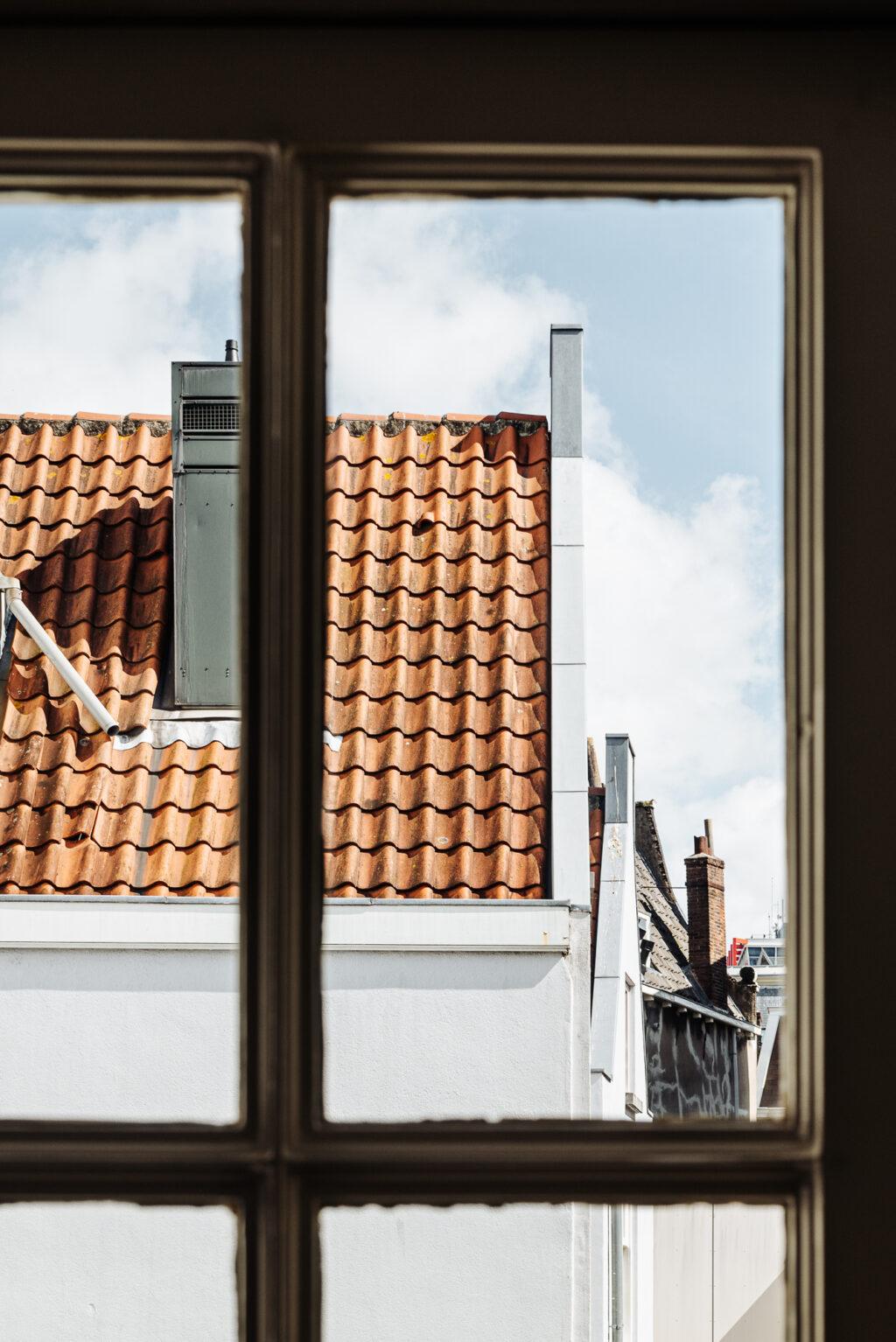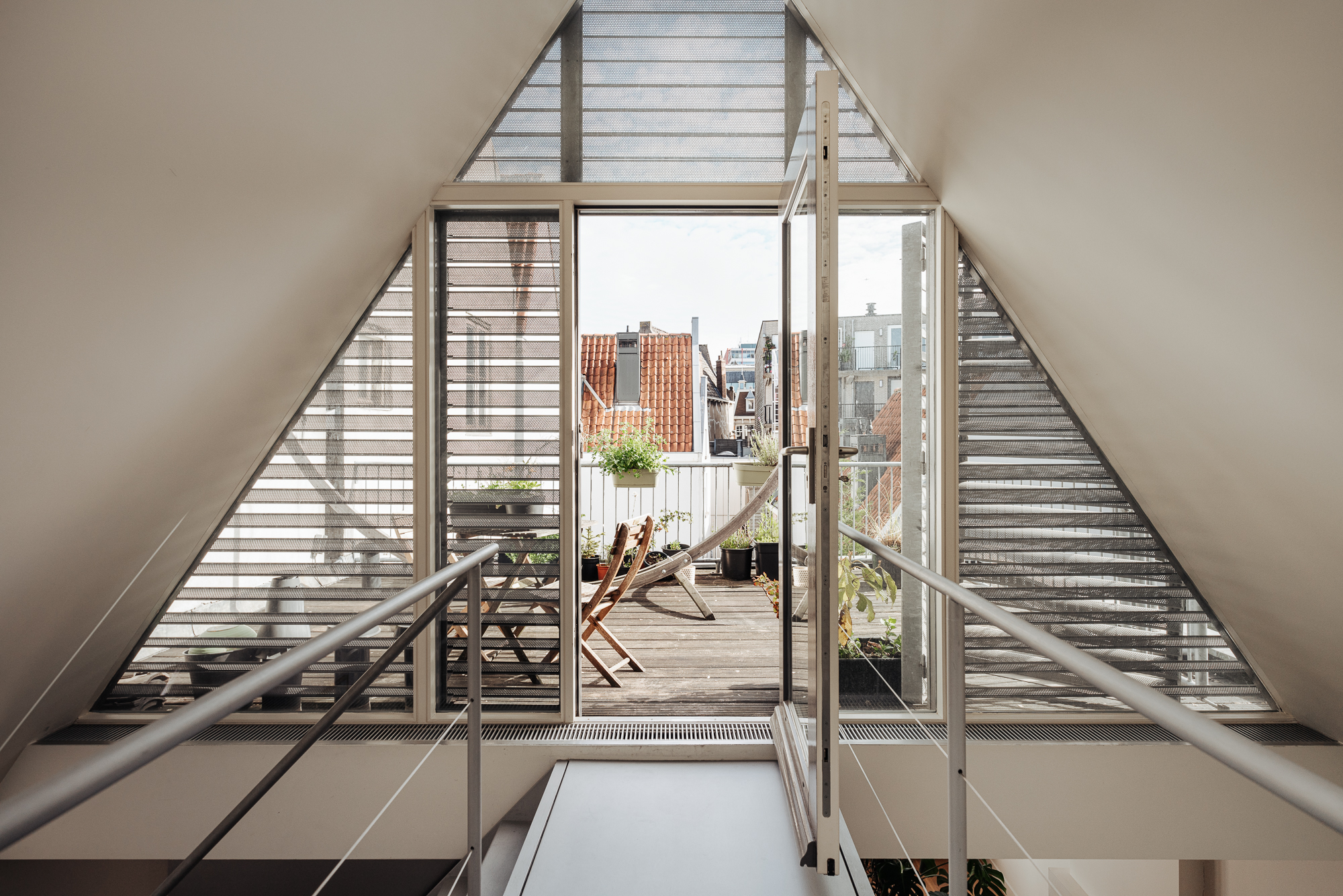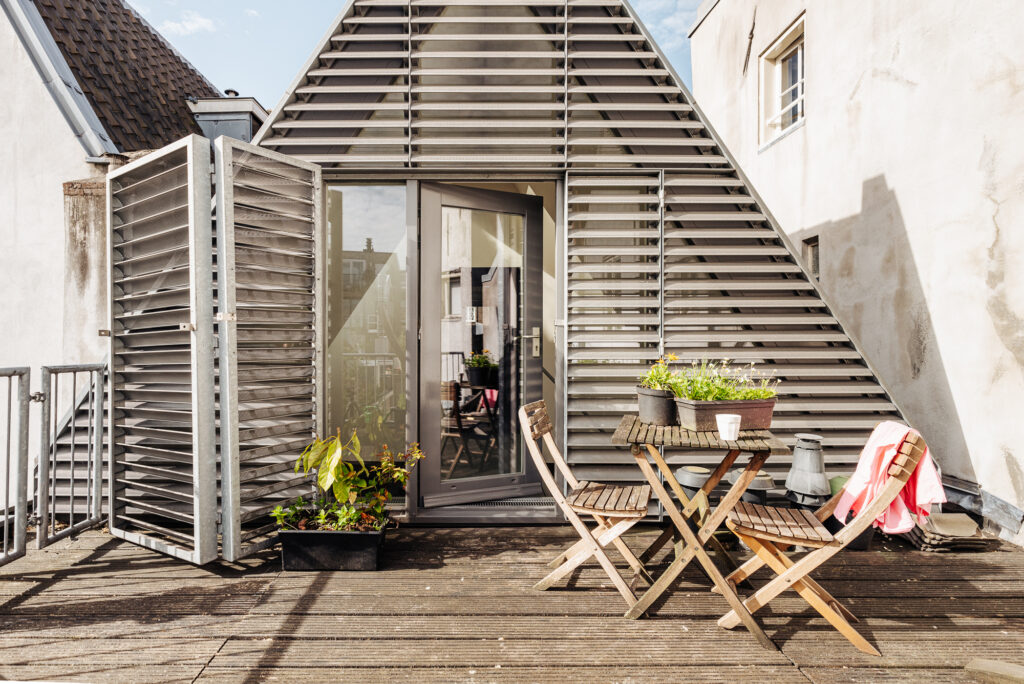 Het dakterras aan de achterzijde is ruim van opzet en biedt ruimte aan een zithoek en een eettafel. Vanaf het dakterras is er een leuk uitzicht over de daken van de omliggende panden en is er gedurende de dag volop zon. Bijzonder te noemen is de lamellenconstructie aan de buitenzijde van de glaspartij van het huis. Deze lamellen zorgen voor een gefilterd licht binnen, maar geven ook een bijzonder fraai aanzicht vanaf het dakterras richting het appartement.