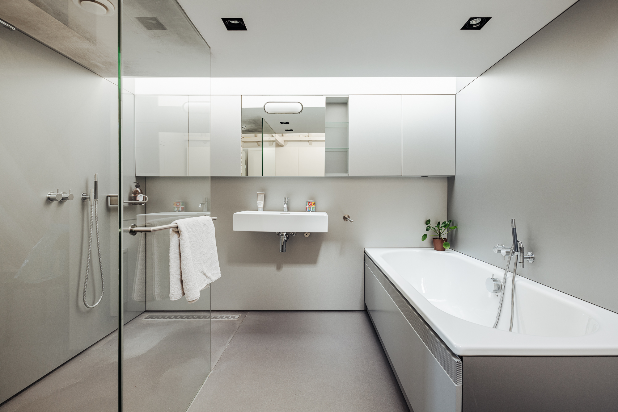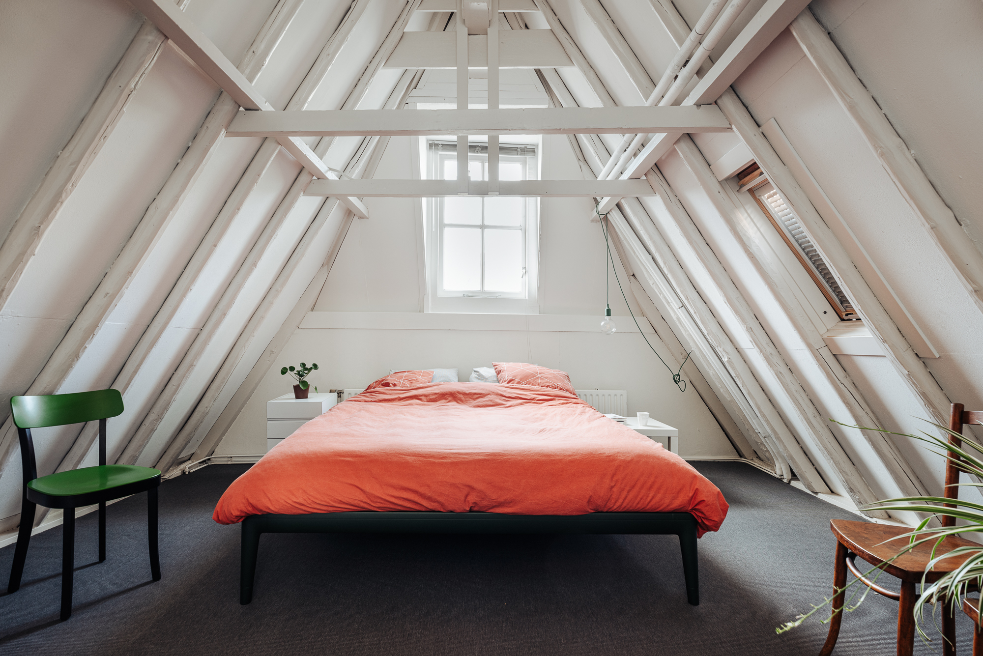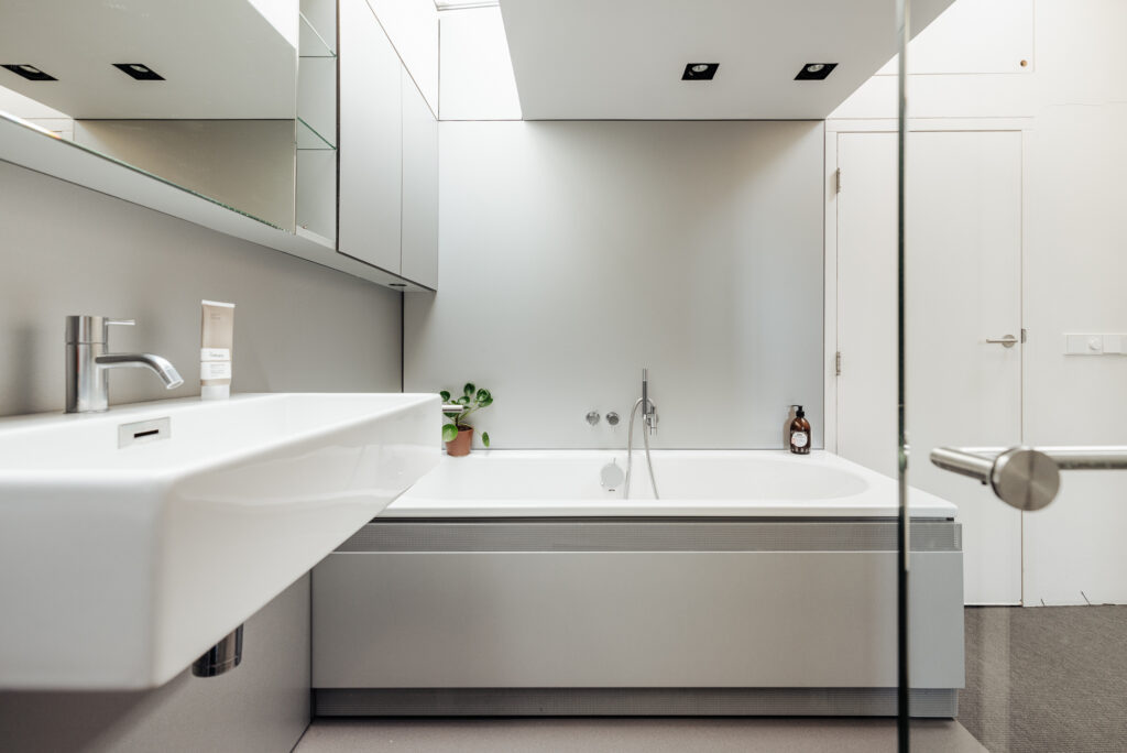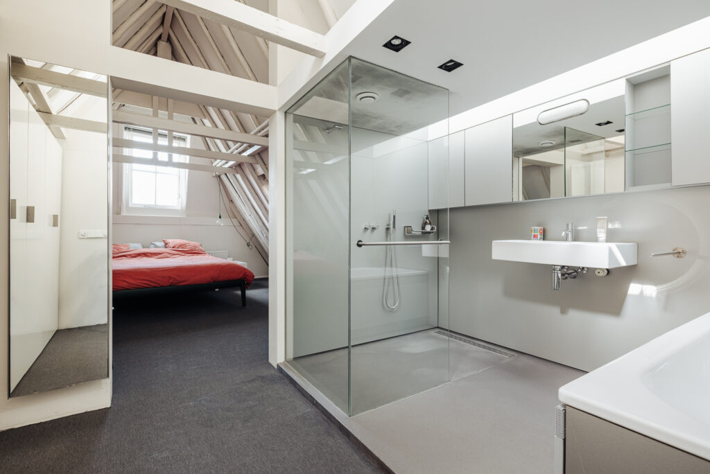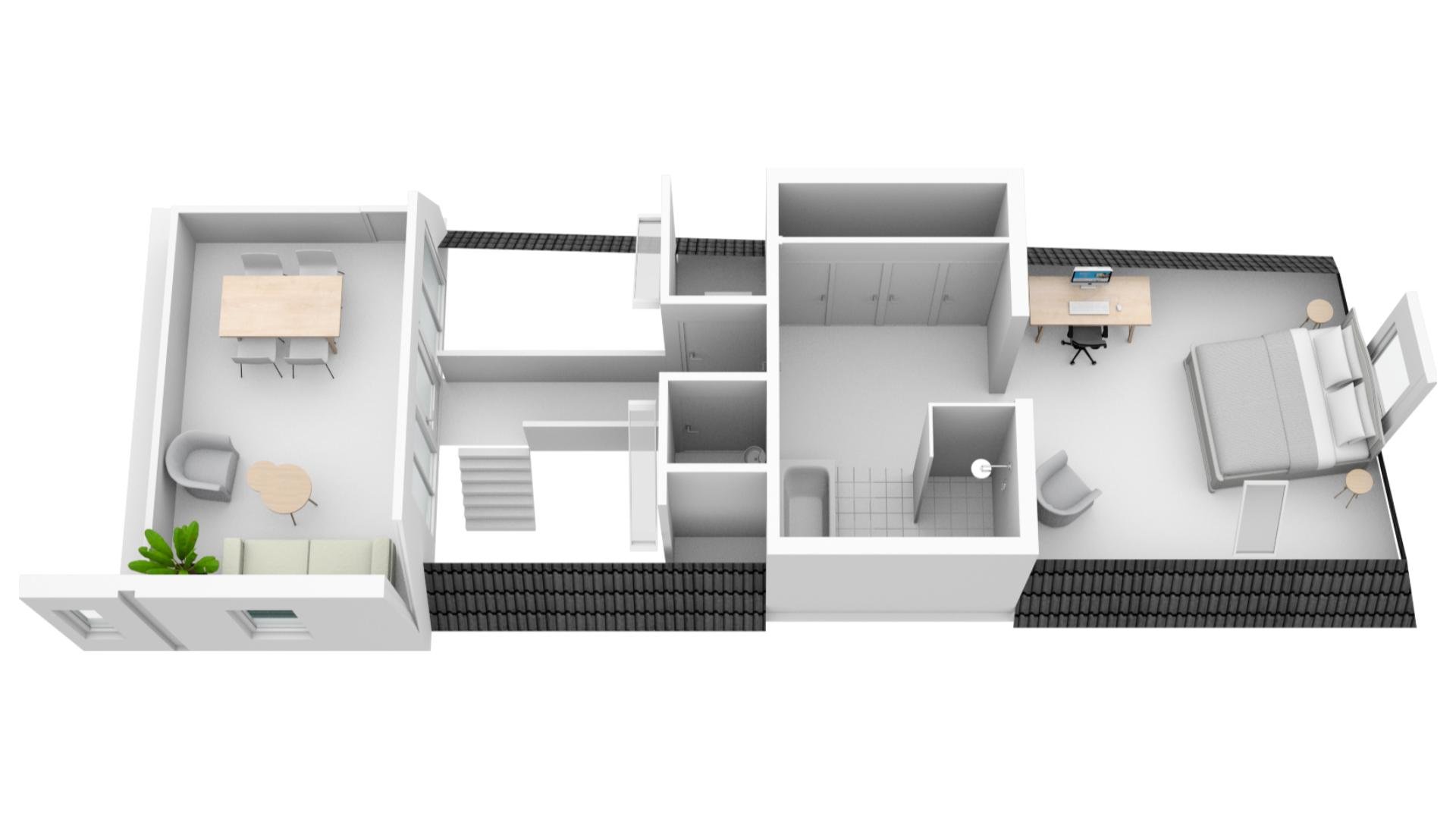 Via de fraai ontworpen open trap naar een loopbrug zijn de slaapverdieping en het dakterras toegankelijk. Hier is aan de voorzijde een ruime slaapkamer met een openkapconstructie. Dit geeft een ruimtelijk effect en een geborgen gevoel. In het midden is een moderne badkamer aan de ene kant en een grote ingebouwde kastenwand aan de andere zijde. De badkamer is voorzien van een ligbad, inloopdouche, wastafel en een ingebouwde spiegelkast en is dankzij een groot daklicht ruimtelijke en licht. Tevens is er een separaat toilet met fontein en een vaste kast met aansluiting voor wasmachine / droger. Vanaf de loopbrug is ook het dakterras toegankelijk.