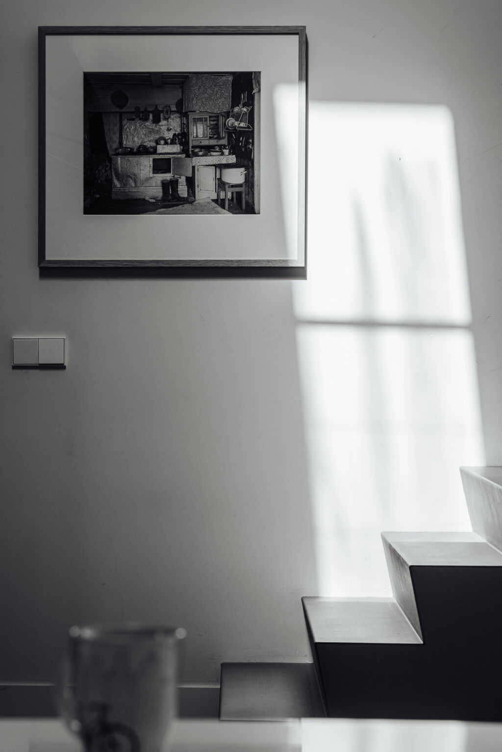 Een met hout uitgevoerde indeling met deuren, glas en glas en lood. Typerend voor die tijd qua smaak en mode.