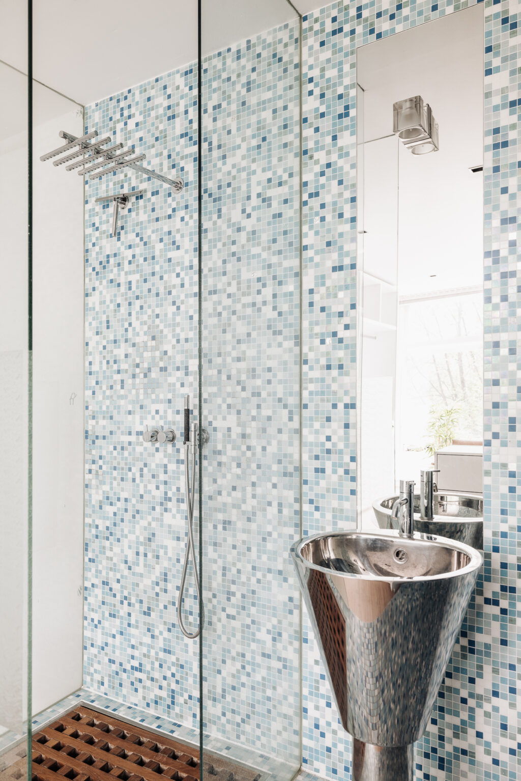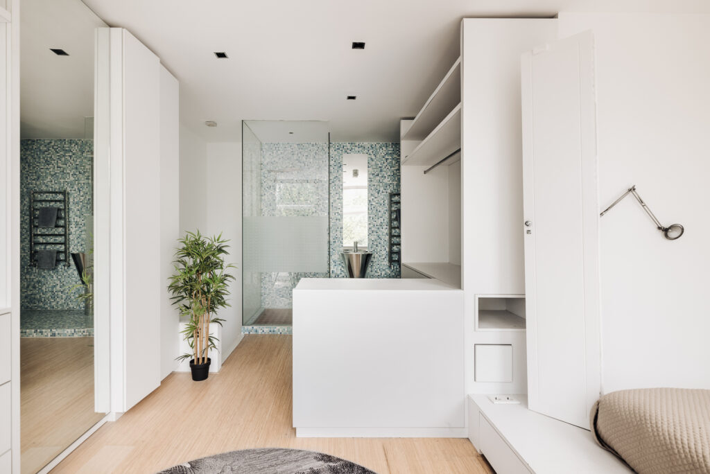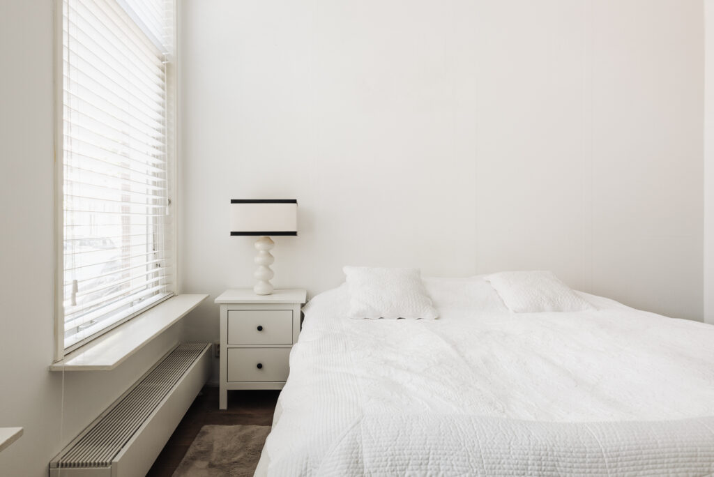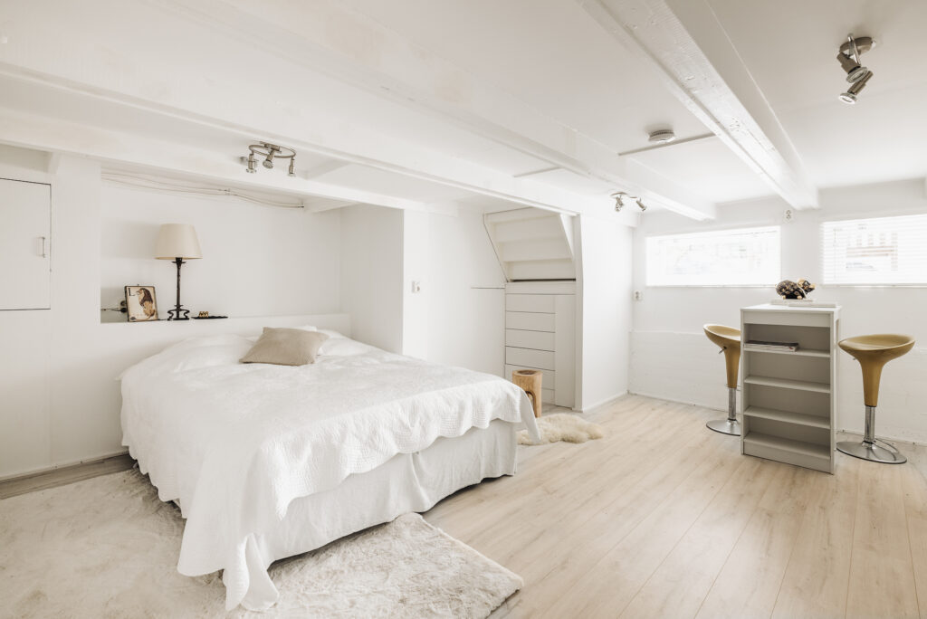 Interne trap naar de slaapverdieping. Er is een fraai ingebouwd bed en maatwerk kasten. De badkamer is voorzien van een inloopdouche, wastafel en toilet.