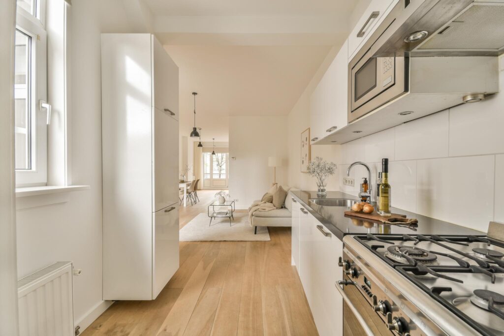 De bergruimte bevindt zich in een vaste wandkast in de keuken. De keuken kijkt uit op de binnenplaats en is voorzien van diverse inbouwapparatuur.