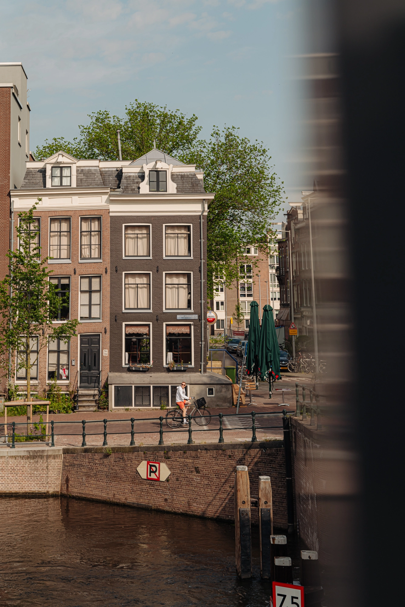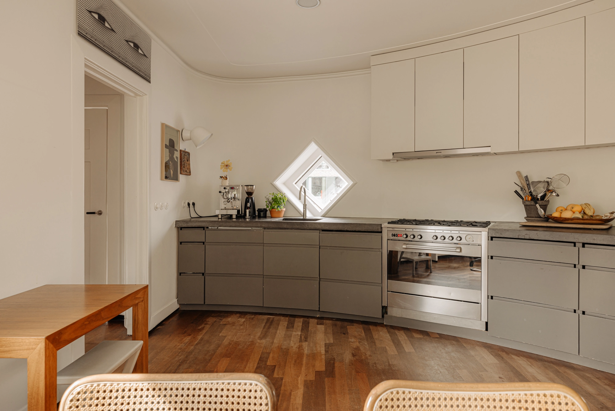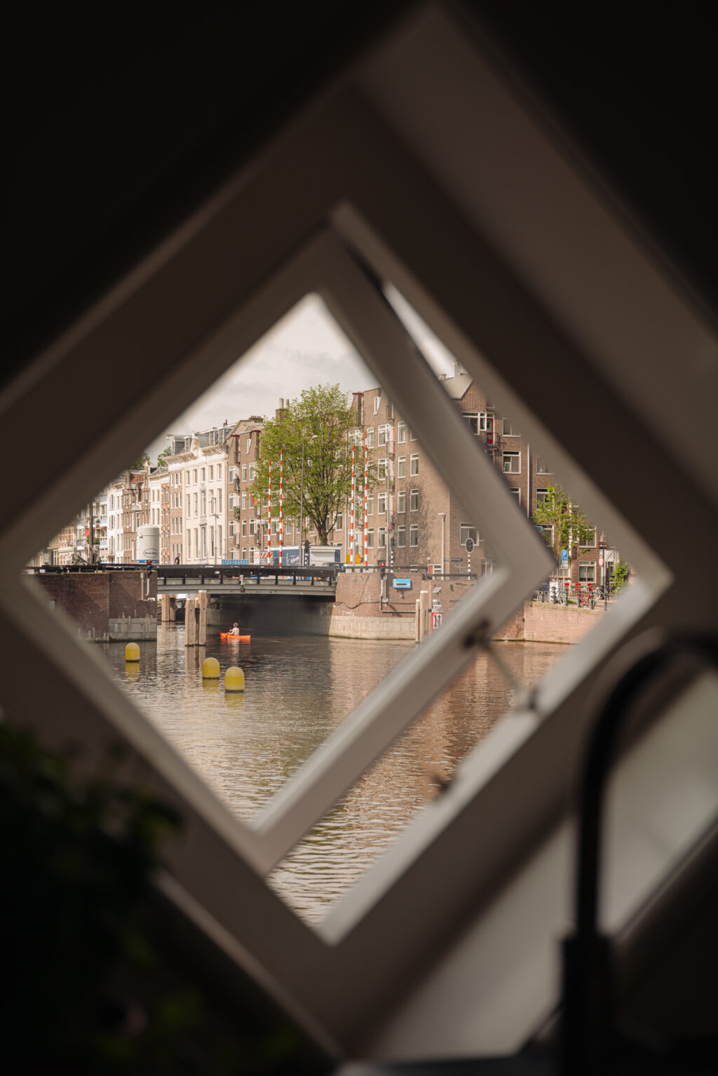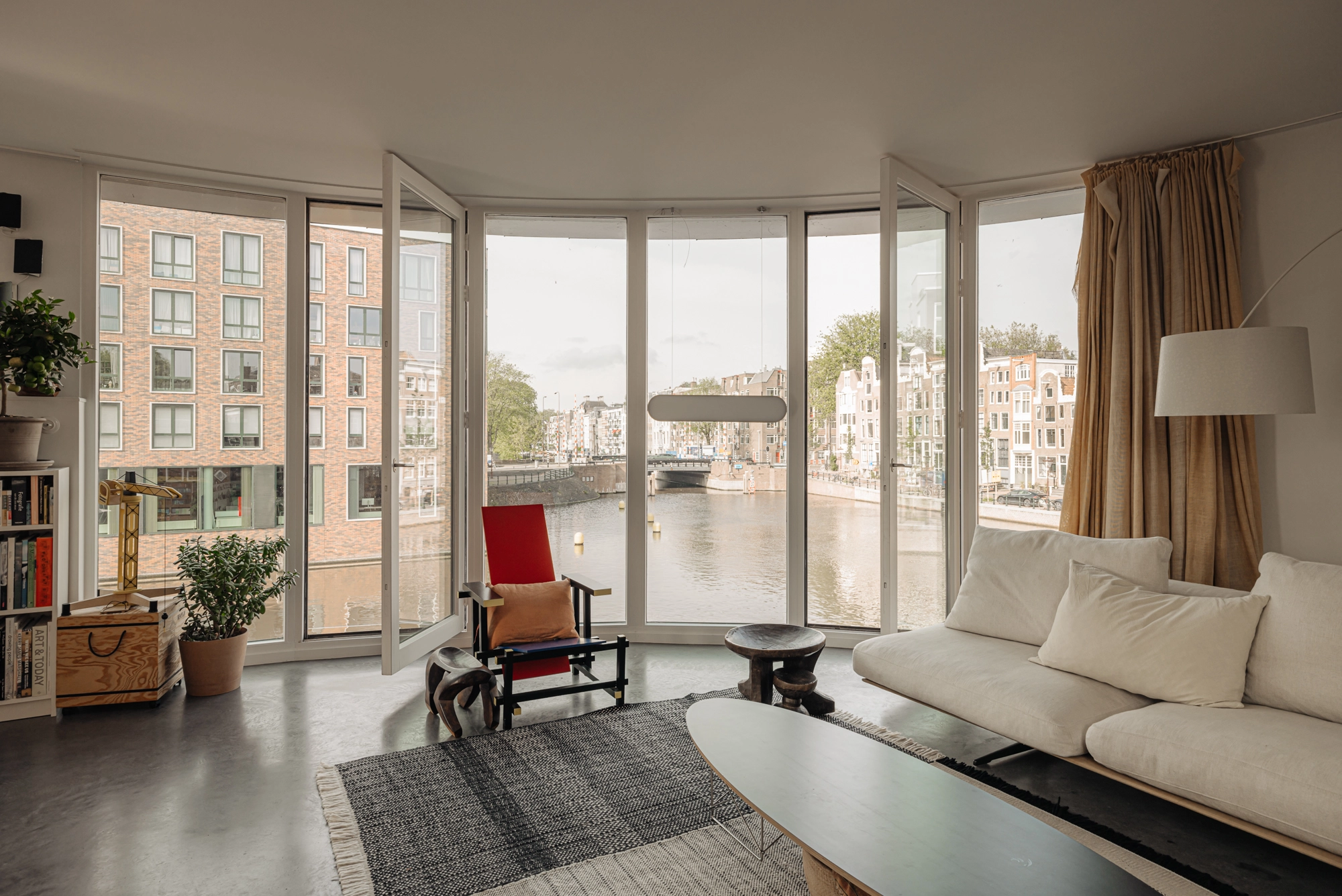 De kelder is een oase van rust, een plek om je even helemaal terug te trekken. Boven opent zich aan alle kanten het uitzicht—op het plein, het Entrepotdok en de gracht. Aan de voorzijde, bij het ronde raam, zitten we al vroeg in het voorjaar in de zon. De hele dag varen hier boten voorbij. Doordeweeks grote beroepsvaart, in het weekend een levendige stroom van plezierbootjes.