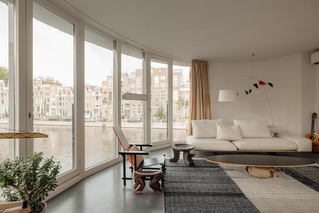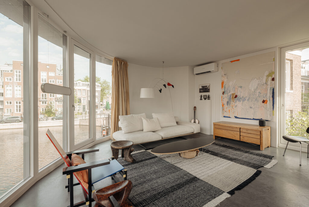 A bamboo staircase leads to the first floor, where the spacious living room features floor-to-ceiling glass façades framing spectacular views over the Entrepotdok and Nieuwe Herengracht. The adjacent bedroom benefits from ample natural light and panoramic outlooks.