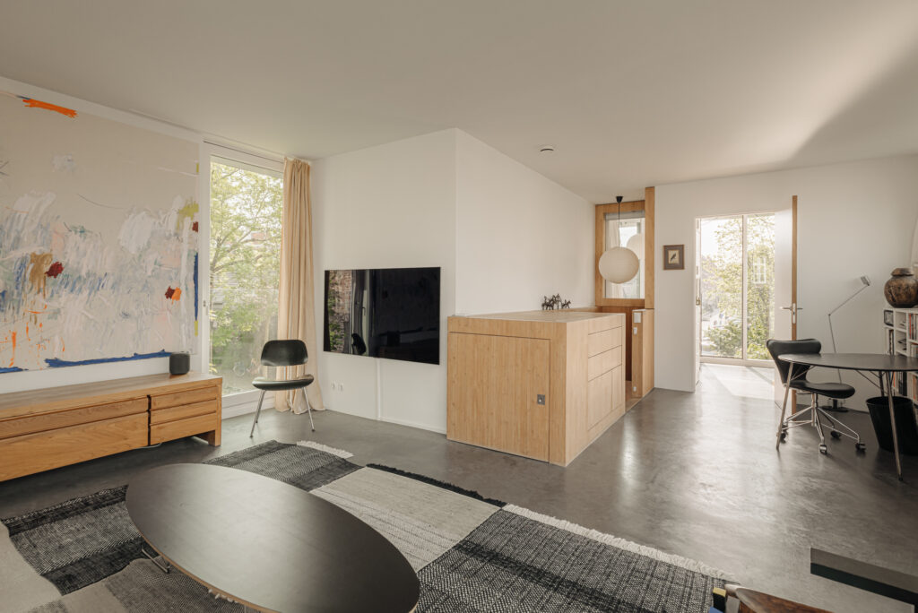 The kitchen itself is sleek and contemporary, outfitted with high-quality built-in appliances including a Quooker tap, a large oven with a six-burner gas stove, and a robust concrete countertop that adds a touch of industrial character. Across the hall, a tranquil study offers a balanced blend of functionality and serenity. A built-in bookcase and desk provide a practical workspace, while the water view creates a calm and inspiring setting. Throughout this level, a wooden floor enhances the overall sense of peace and cohesion. The bamboo staircase acts as an architectural focal point, leading to the first floor—a space that can only be described as remarkable. Expansive glass façades draw in the daylight and frame panoramic views over both the Entrepotdok and the Nieuwe Herengracht. The spacious living area, equipped with air conditioning, exudes tranquillity and openness, further accentuated by a polished cast floor that complements the modern ambiance. Adjacent lies a light-filled bedroom, wrapped in windows that offer sweeping views over the Entrepotdok. This room, too, would serve beautifully as a home office, merging comfort with visual serenity.