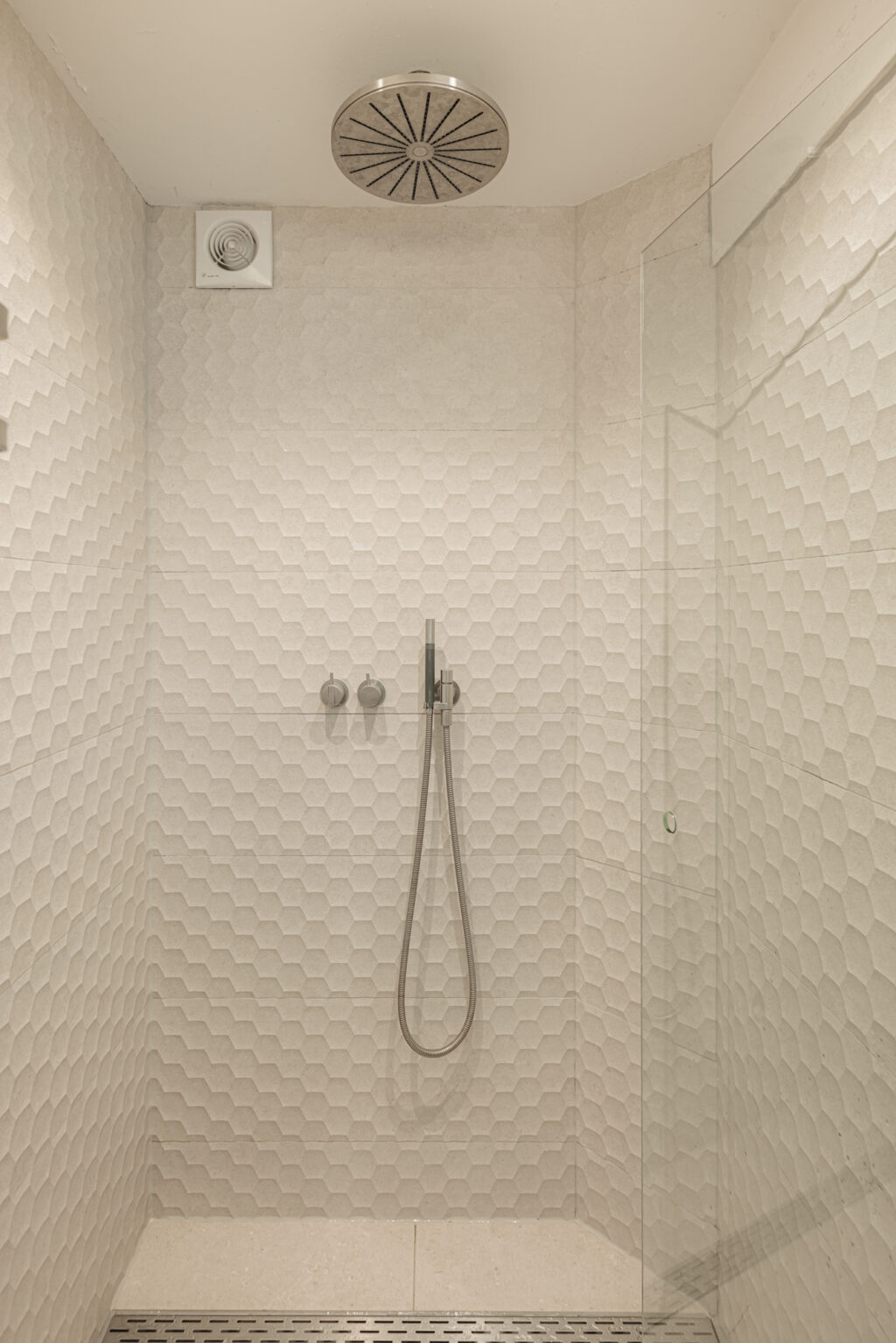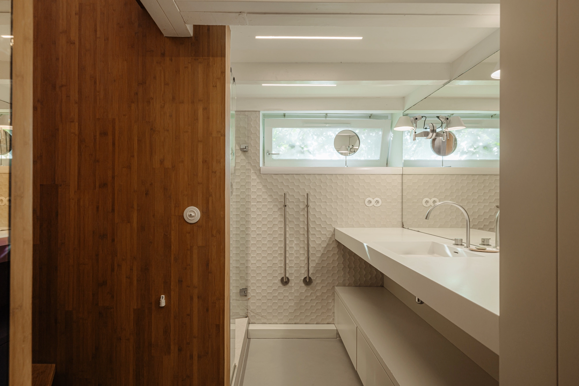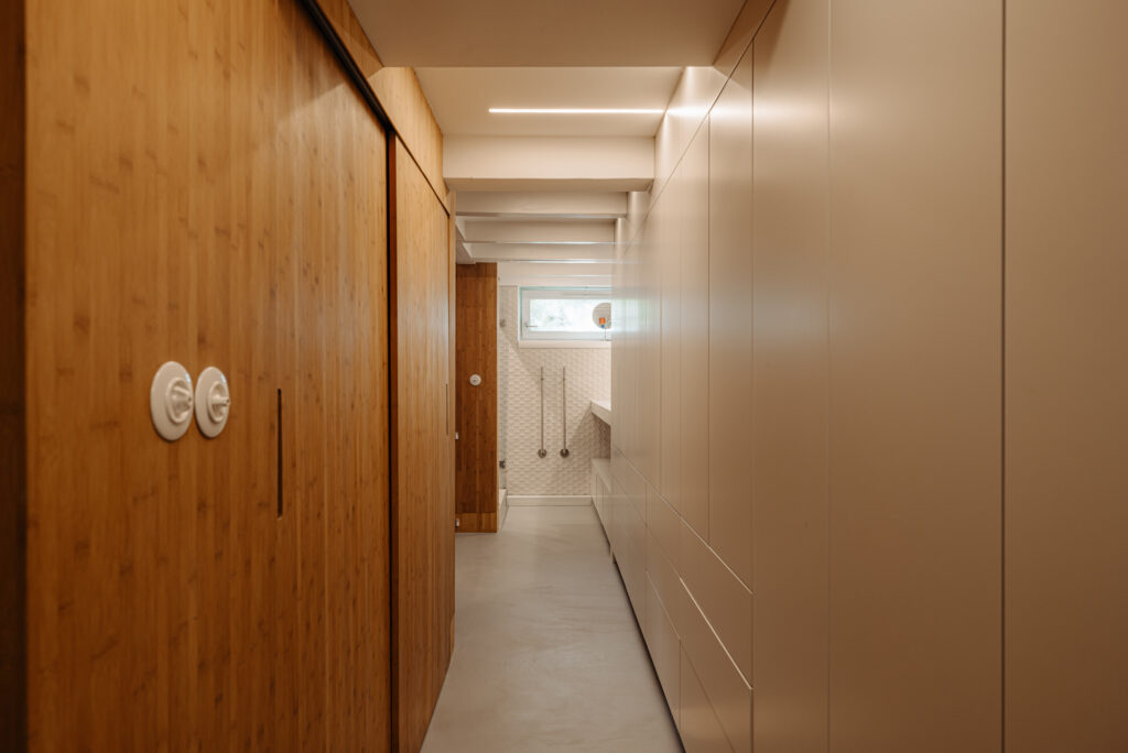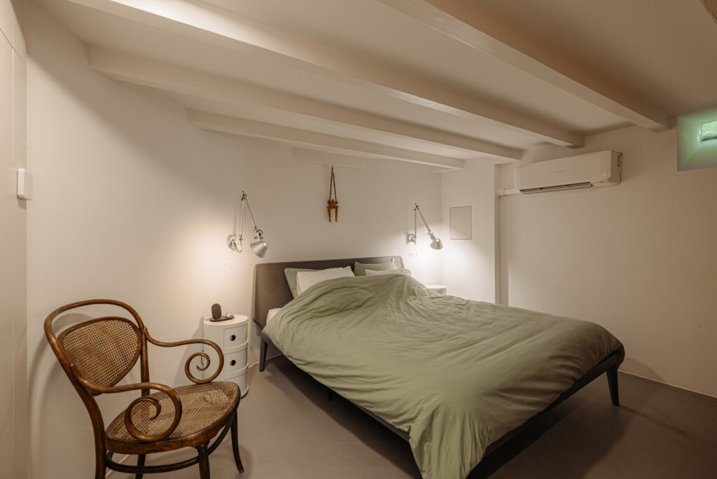 The lower level, partially below the waterline, houses the private sleeping quarters. Here, a beautifully finished bathroom features a walk-in shower, with a separate toilet across the hallway. The corridor includes built-in storage, with space for a washing machine. The large rear bedroom offers air conditioning and a made-to-measure bamboo wardrobe wall — a calming presence that enhances the sense of restfulness and order.
