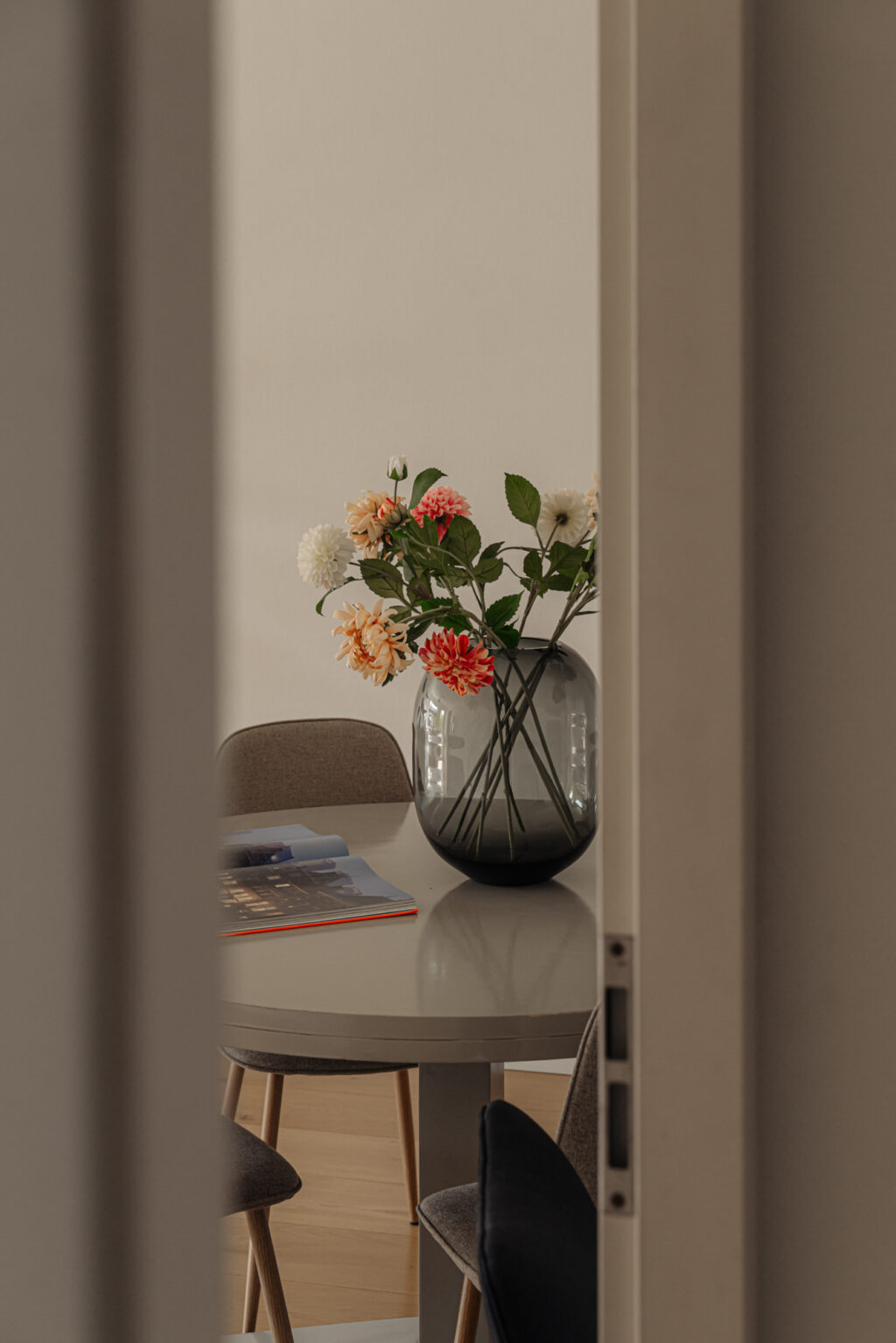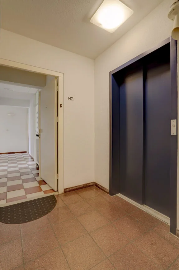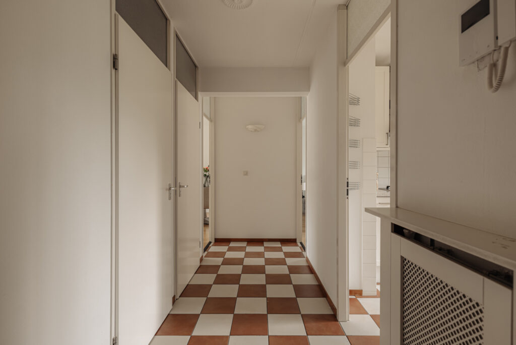 Het appartement is bereikbaar met zowel de trap als lift en de ruime hal geeft toegang tot de keuken, de hoofdslaapkamer, de badkamer, het toilet en de woonkamer.