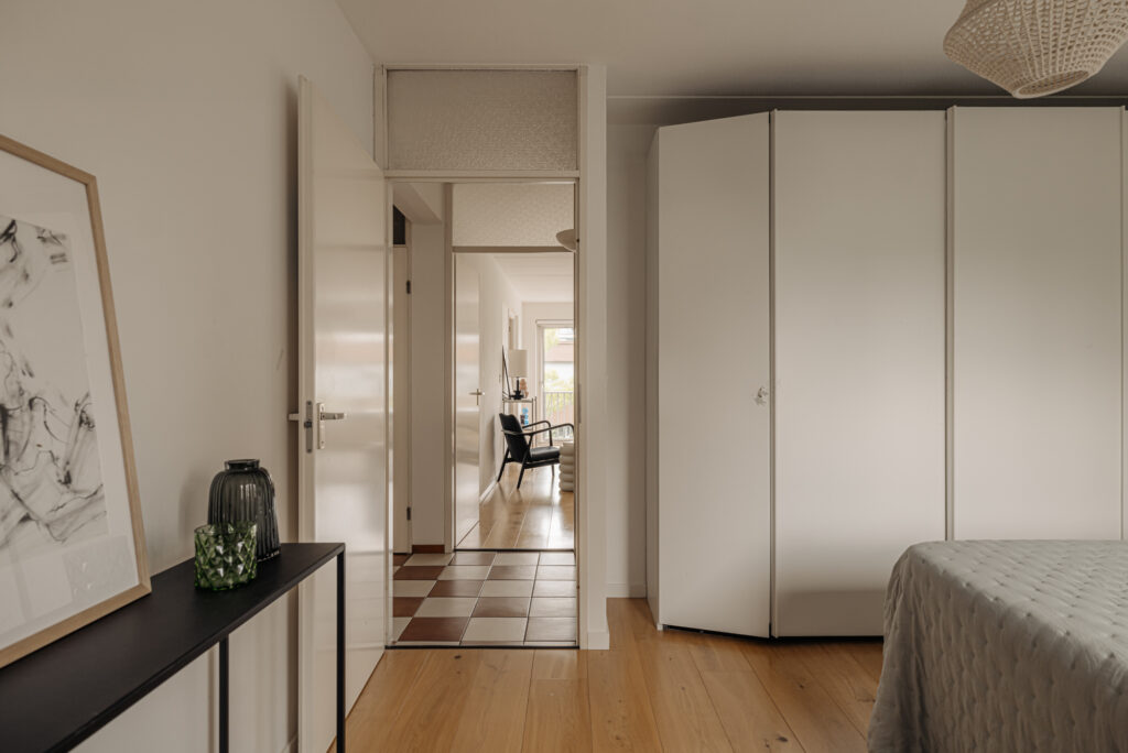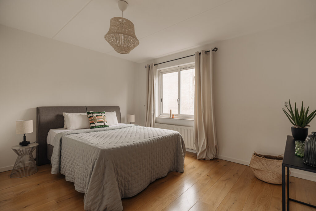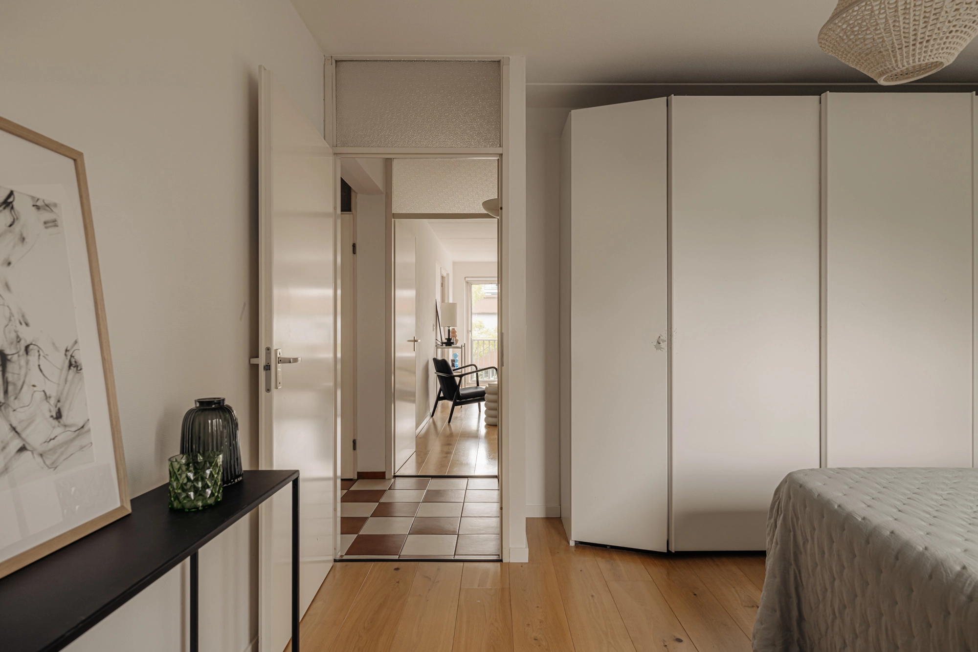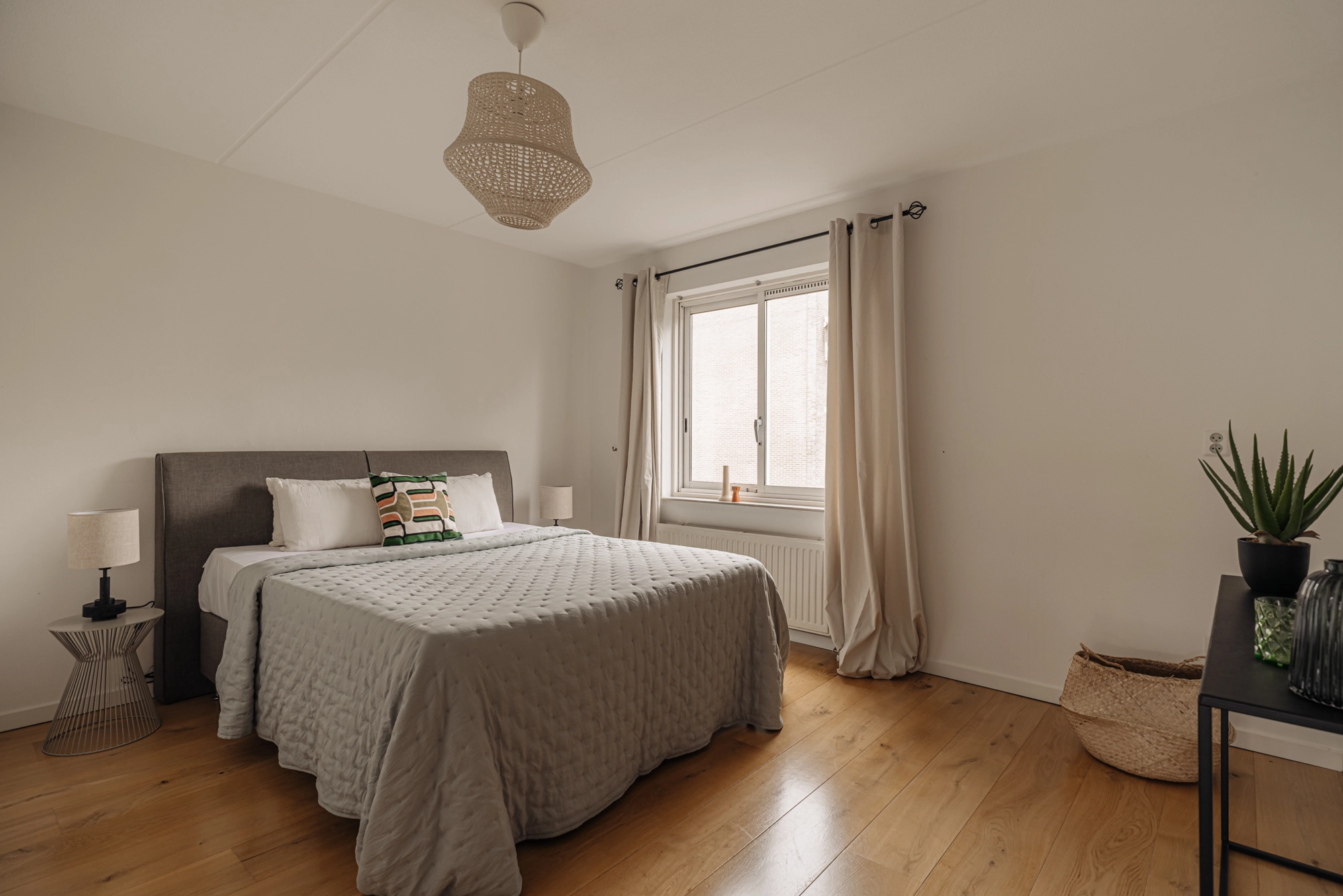 De hoofdslaapkamer is rustig gelegen aan de achterzijde van het appartement en is voorzien van een grote inbouwkast. Hier is een schuifraam dat uitkijkt op het plantsoen.