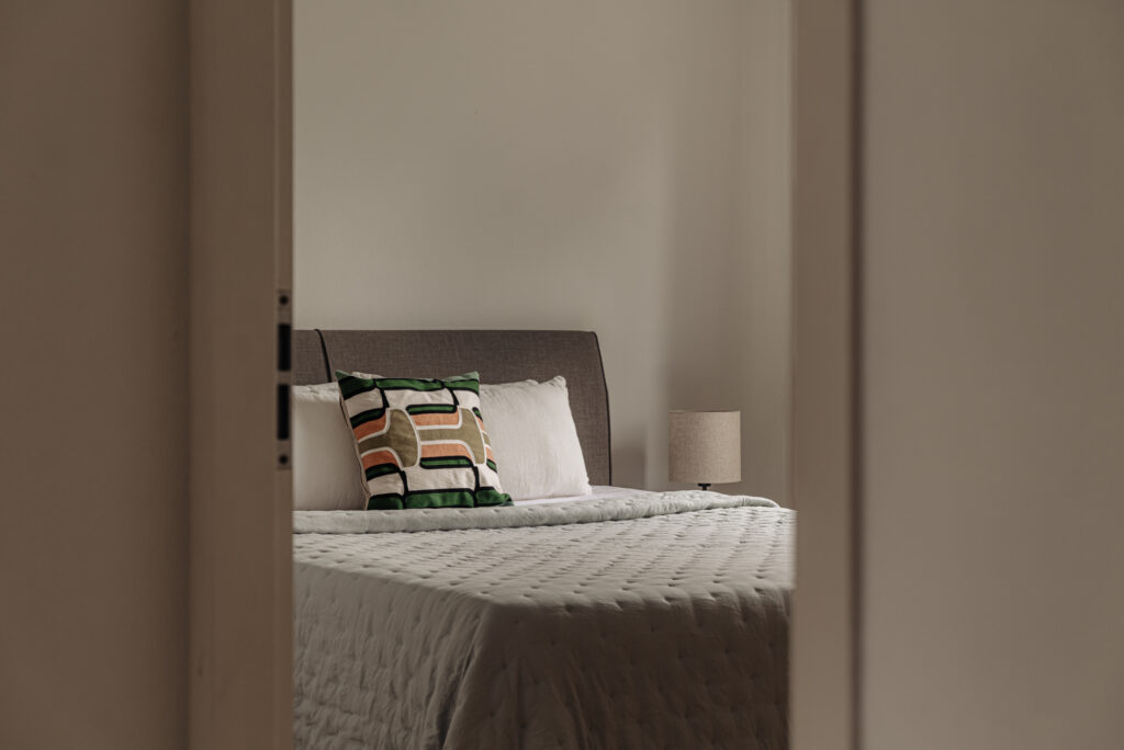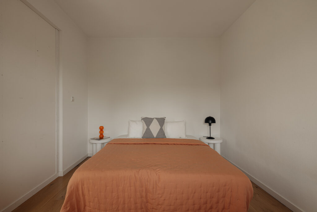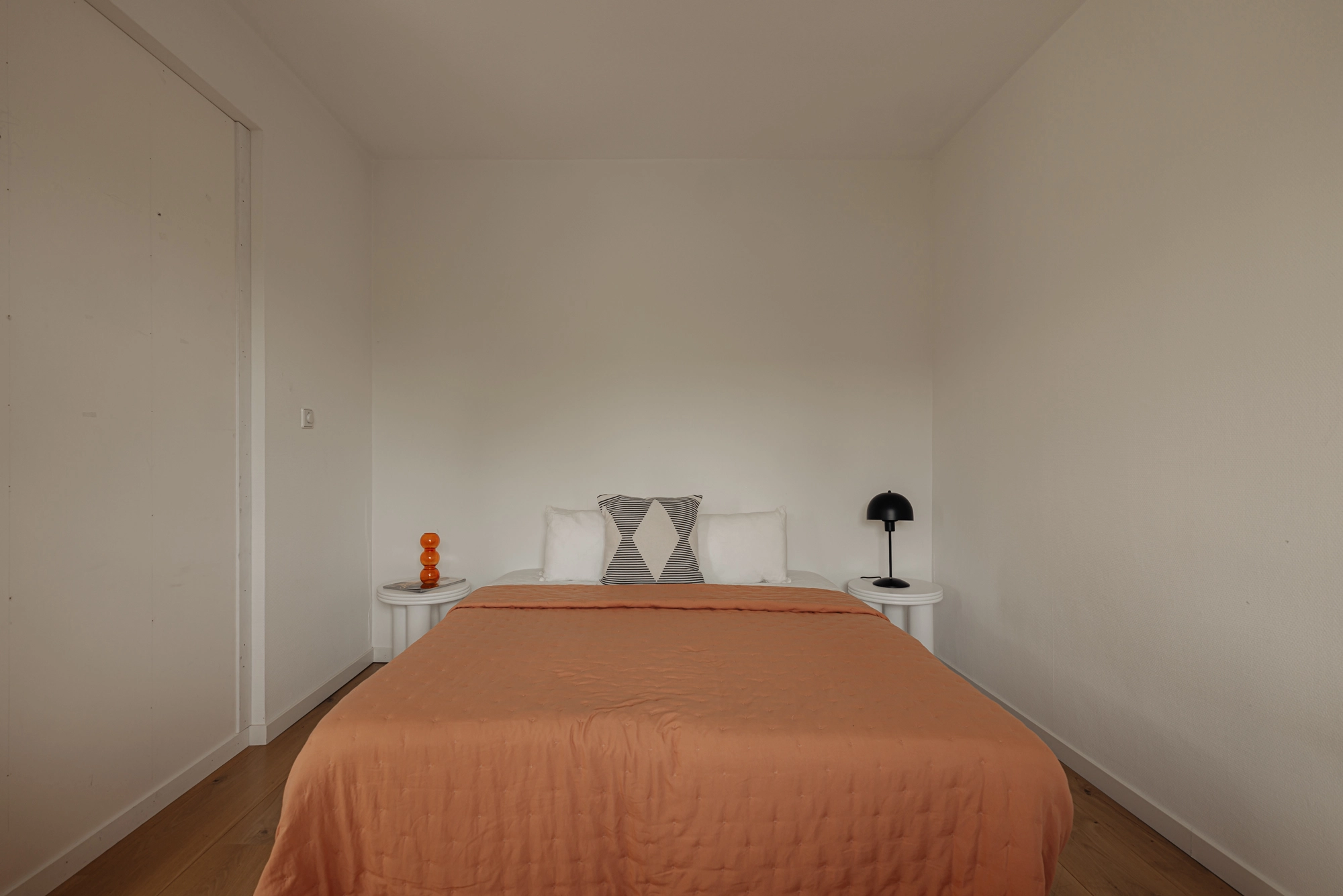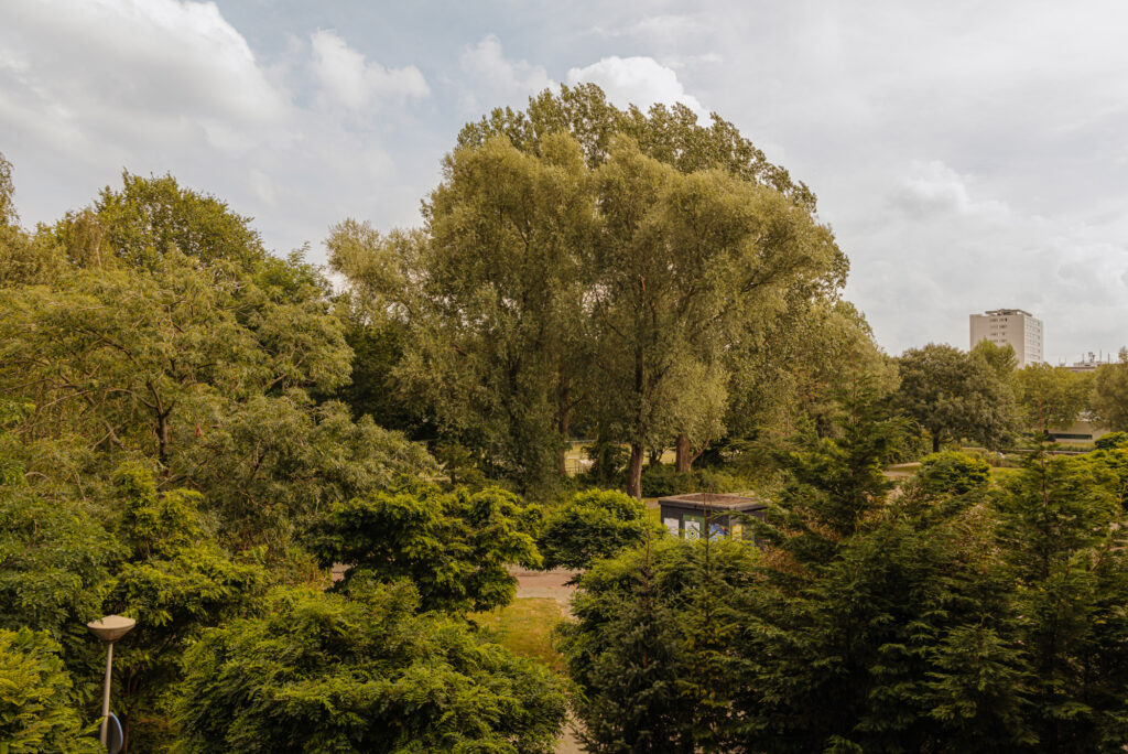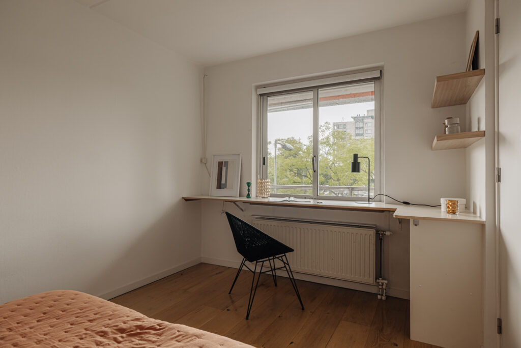 De hoofdslaapkamer is rustig gelegen aan de achterzijde van het appartement en is voorzien van een grote inbouwkast. Hier is een schuifraam dat uitkijkt op het plantsoen.