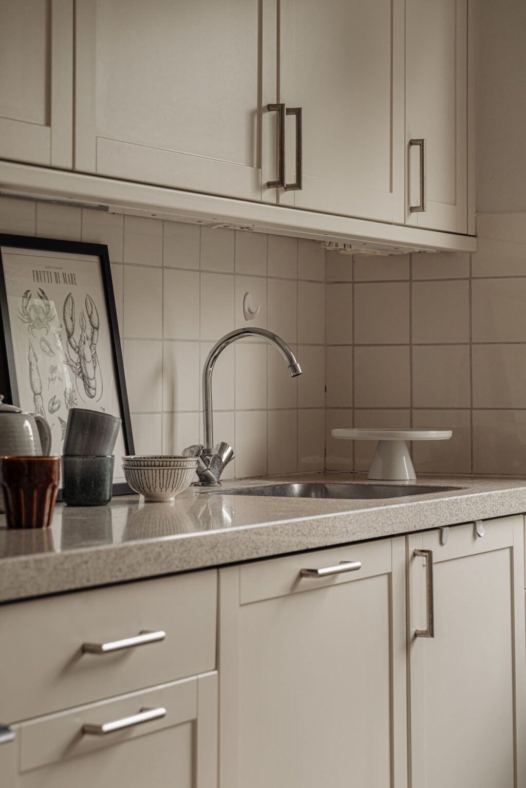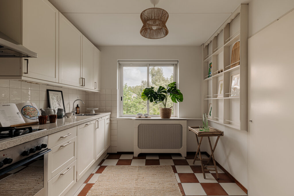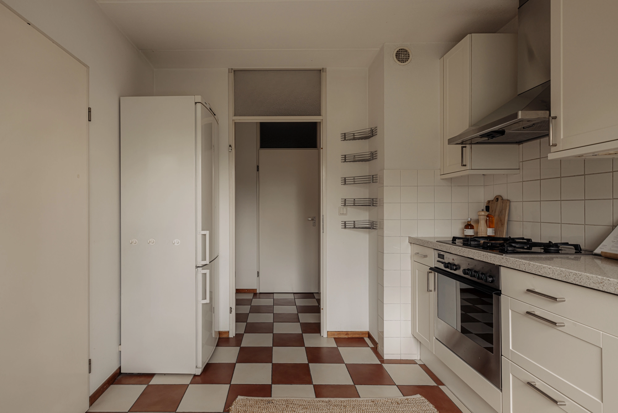 De keuken is gelegen aan de achterzijde van het appartement en heeft vrij uitzicht over het groene plantsoen. De keuken voorzien van een granieten werkblad en allerlei inbouwapparatuur zoals een vaatwasser, een oven en een 4-pits gasfornuis. De koel-/vriescombinatie staat separaat in de keuken. Achter de keuken bevindt zich een berging die voorzien is van een wasmachineaansluiting en CV-ketel. Hier is tevens ruimte genoeg voor het opbergen van proviand of huishoudelijke spullen.