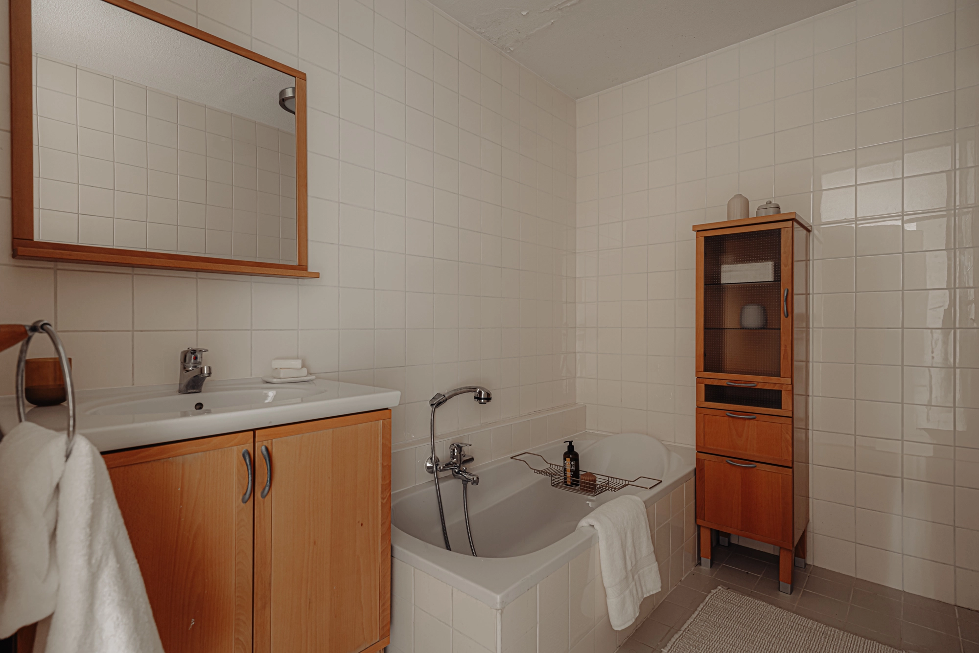 De centraal gelegen badkamer is voorzien van een ligbad, douche en wastafelmeubel. In de onderbouw bevindt zich een ruime berging van circa 4 m², geschikt voor fietsopslag.