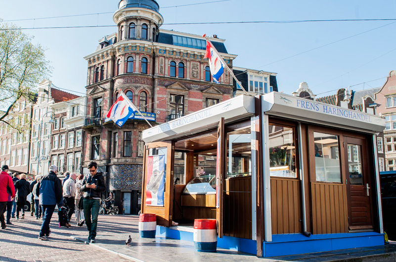 Frens Haringhandel is nog een van de weinige viskramen in Amsterdam waar je heerlijke verse haring en andere vis kan bestellen op de traditioneel Hollandse manier. Al sinds 1972 is de familie Frens actief in de haringindustrie, inmiddels wordt de kraam gerund door vrouw, zoon en vriend van Frens. De kraam staat op een vaste plek op Koningsplein en is iedere dag geopend voor een verse hap vis met zuurtjes en ui.