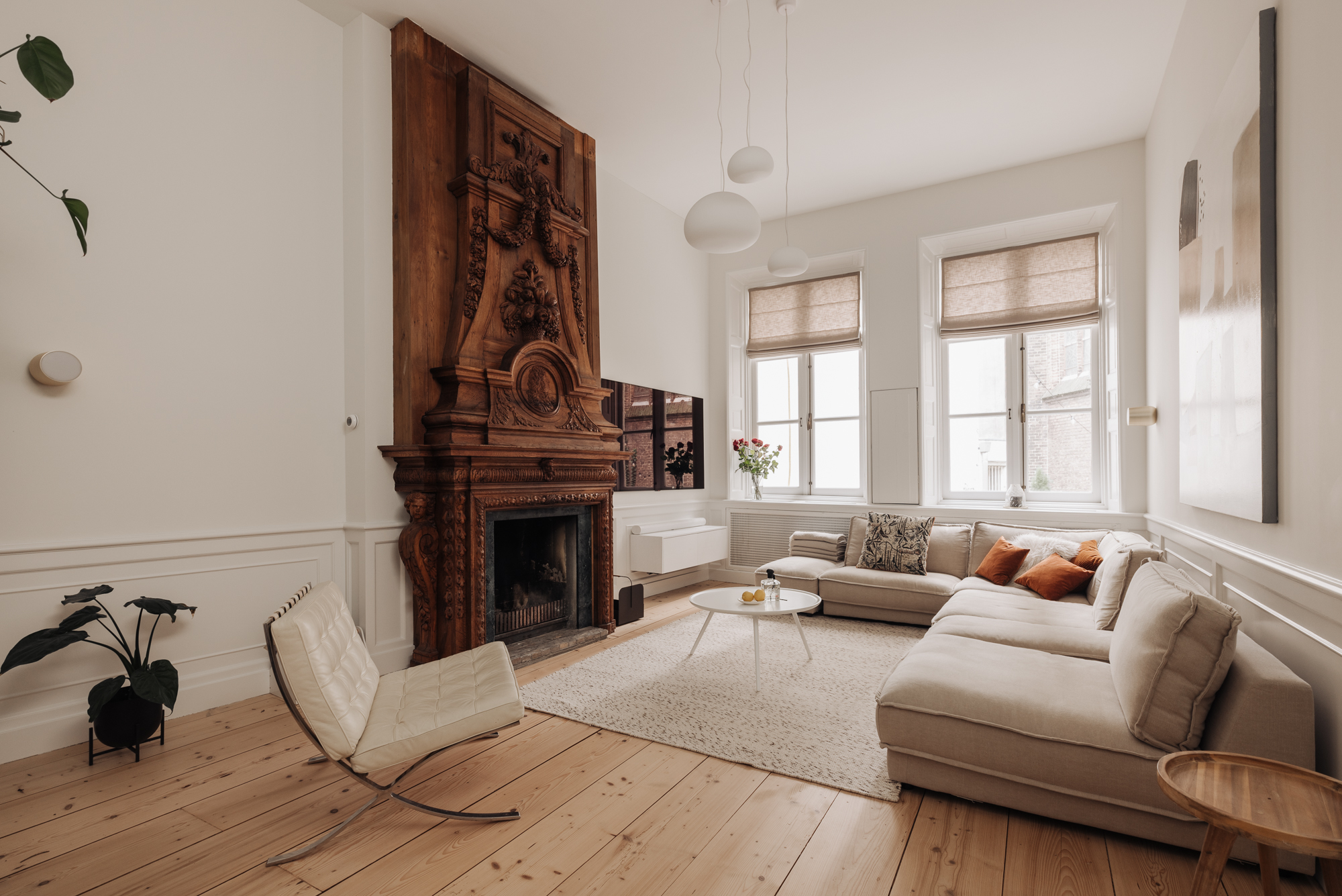 Upon entering through the landing with seating, the high ceilings and the marble floor immediately appeal to the imagination. On this floor is the dining room with en suite kitchen at the front and the living room at the rear. In the kitchen, modern and sleek materials have been used that exude a modest luxury. Here you can sit at a table with a view over the canal. The spacious living room with large carved wood fireplace and decorative ceiling gives a historic feel with a contemporary twist. This combination creates a high-quality sense of design.