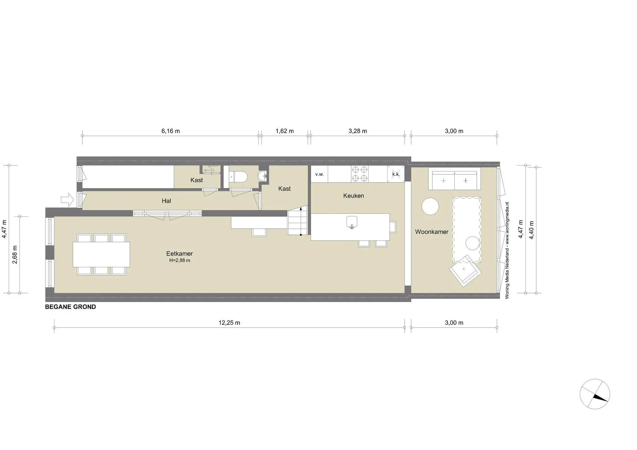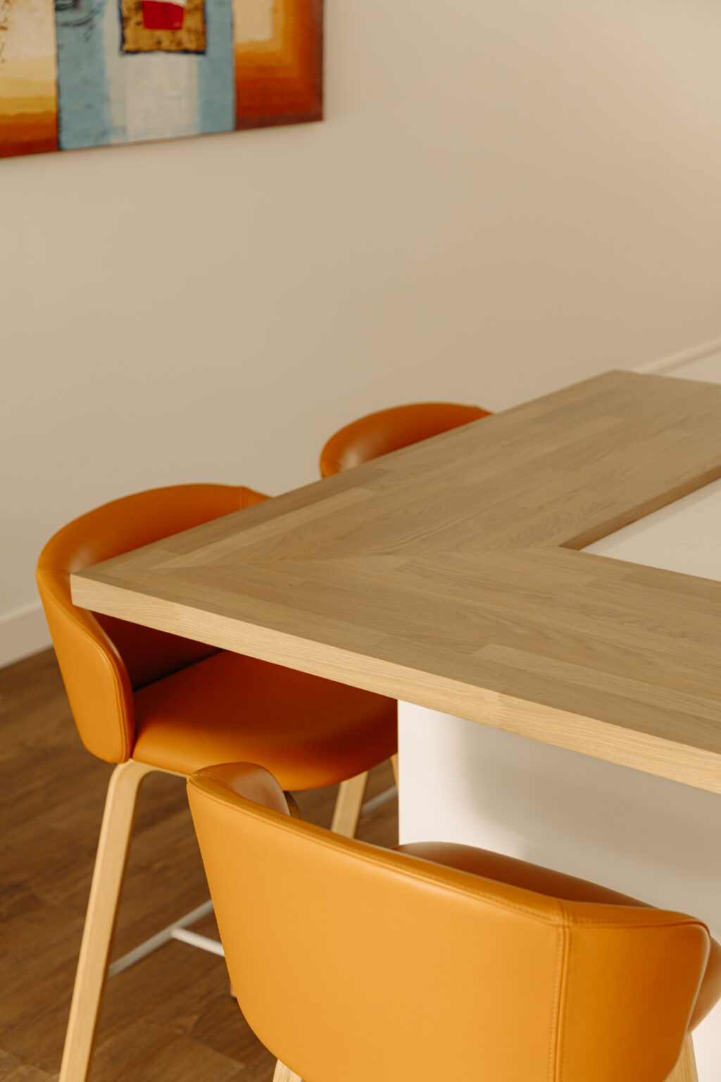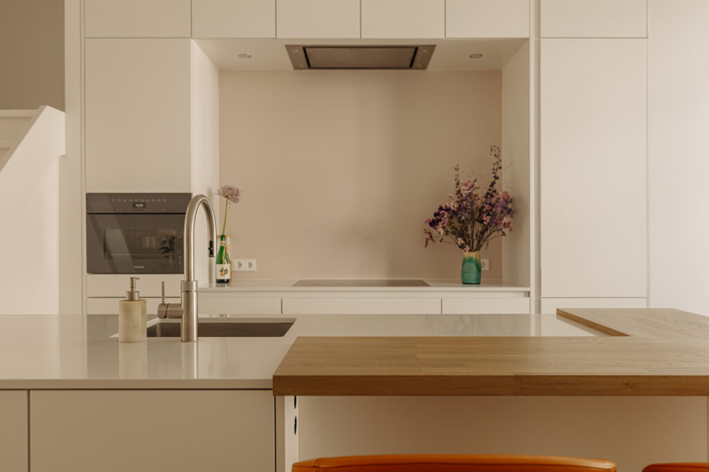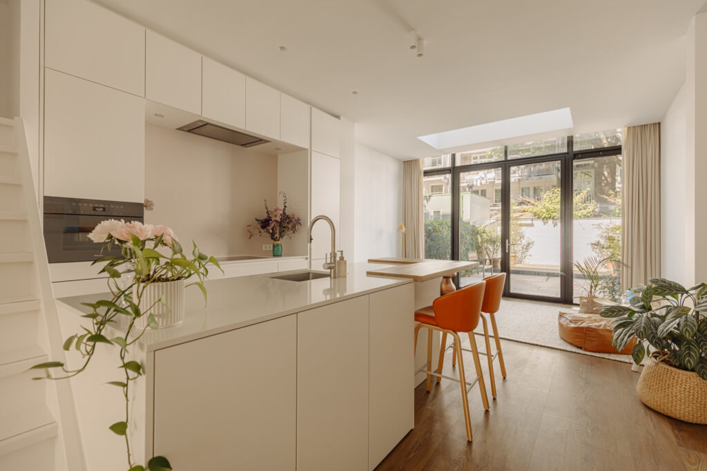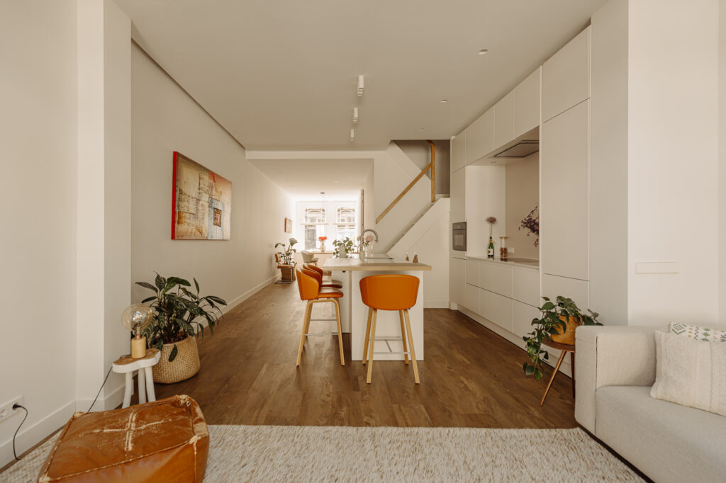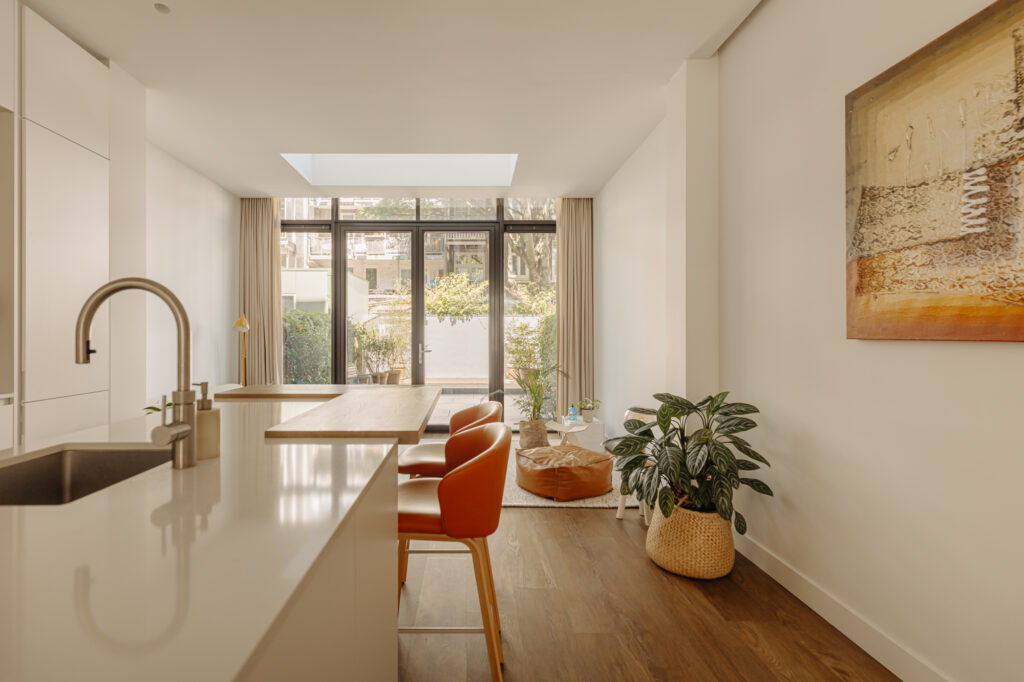 Upon entering, the ceiling height and spatiality immediately impress. A refined space where cooking and living blend into a balanced composition. The custom-designed kitchen is subtly integrated, with a central island serving as the connecting element. Natural light flows from front to back, highlighting the warm wooden flooring and clean wall finishes. Orange accents and carefully placed greenery add a touch of vibrancy to this harmonious setting. An elegant whole, designed for comfort and calm. The large glass doors provide access to the generous garden, where sunlight graces the space in the afternoon and evening. A separate guest lavatory is located in the hallway.