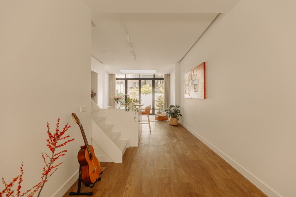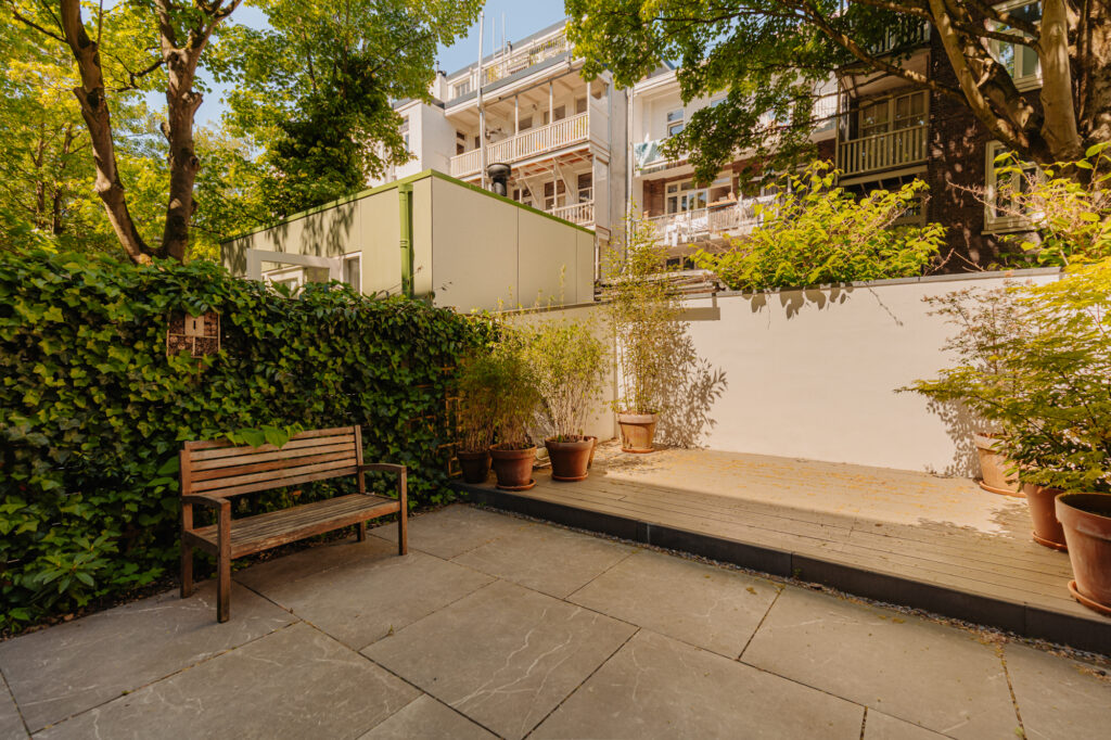 The northeast-facing garden enjoys afternoon and evening sun, offering tranquility and privacy. The terrace connects directly to the dining area, forming a natural extension of the interior. A serene green retreat.