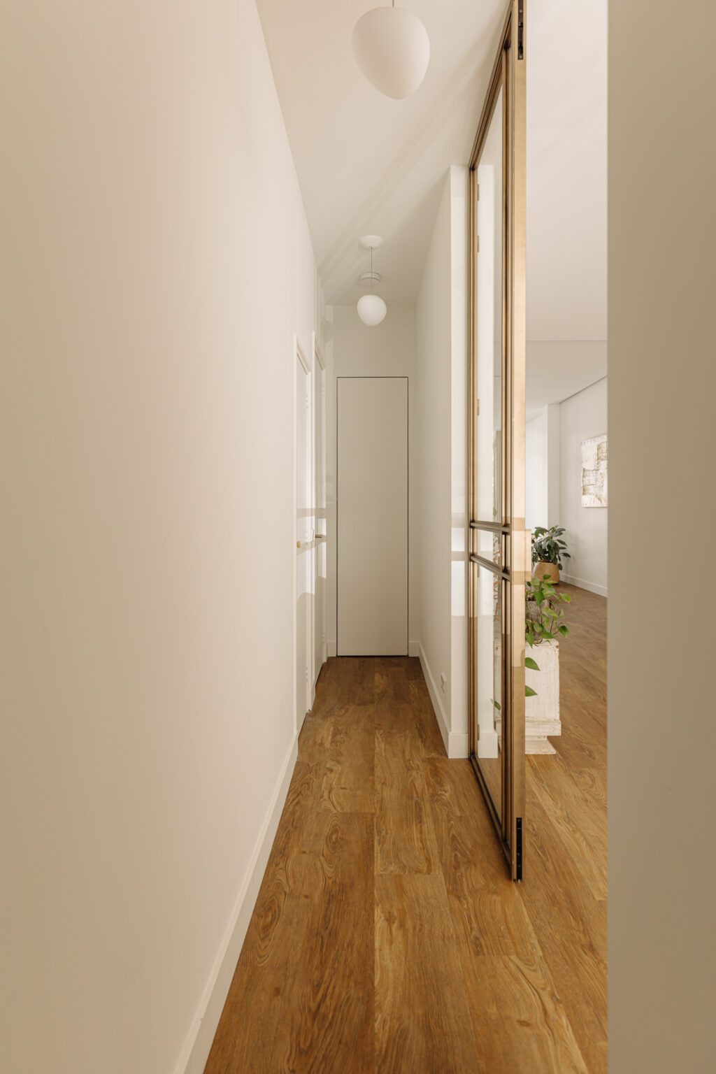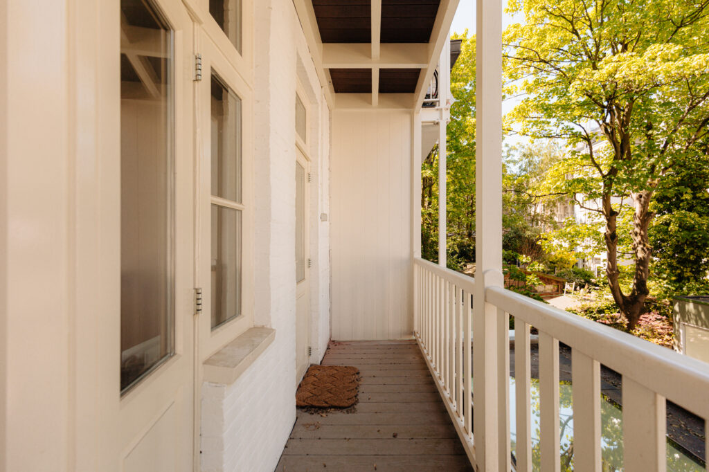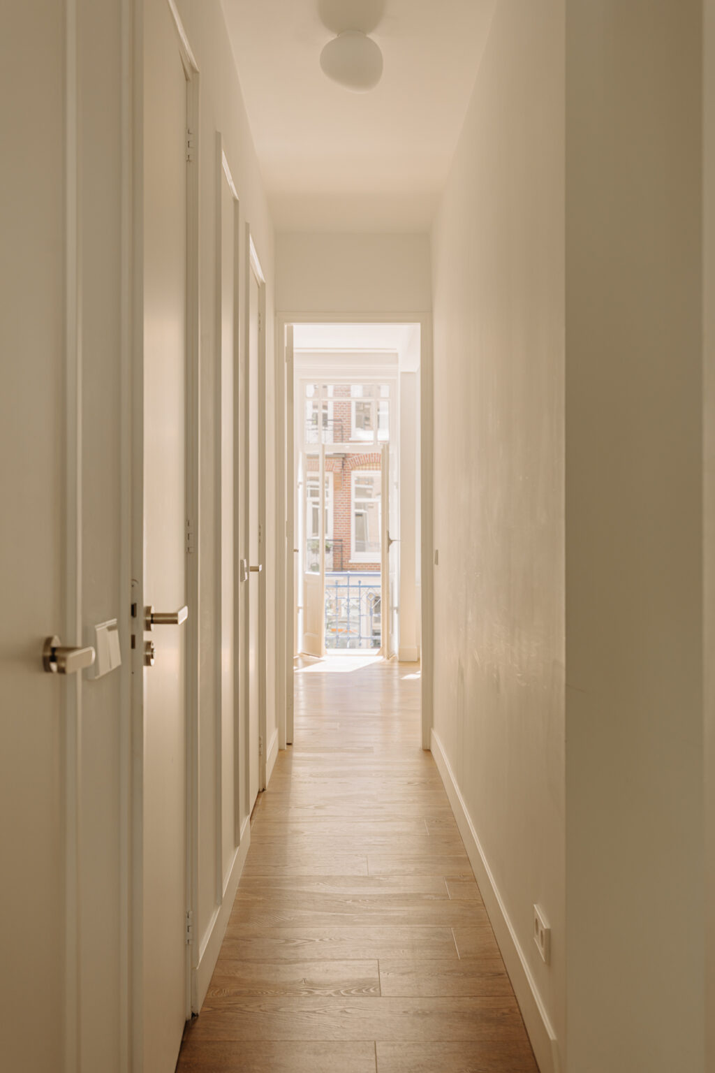 This sleeping floor comprises two bedrooms, a luxurious bathroom with a bathtub, walk-in shower, and washbasin, and a separate toilet in the hallway. At the front, a charming, spacious bedroom doubles as a home office, with French doors opening to a balcony overlooking the street. At the rear, the second bedroom features built-in wardrobes and direct access to a balcony facing the garden.