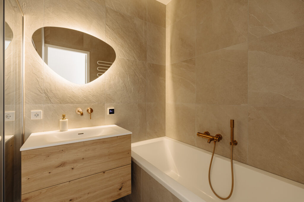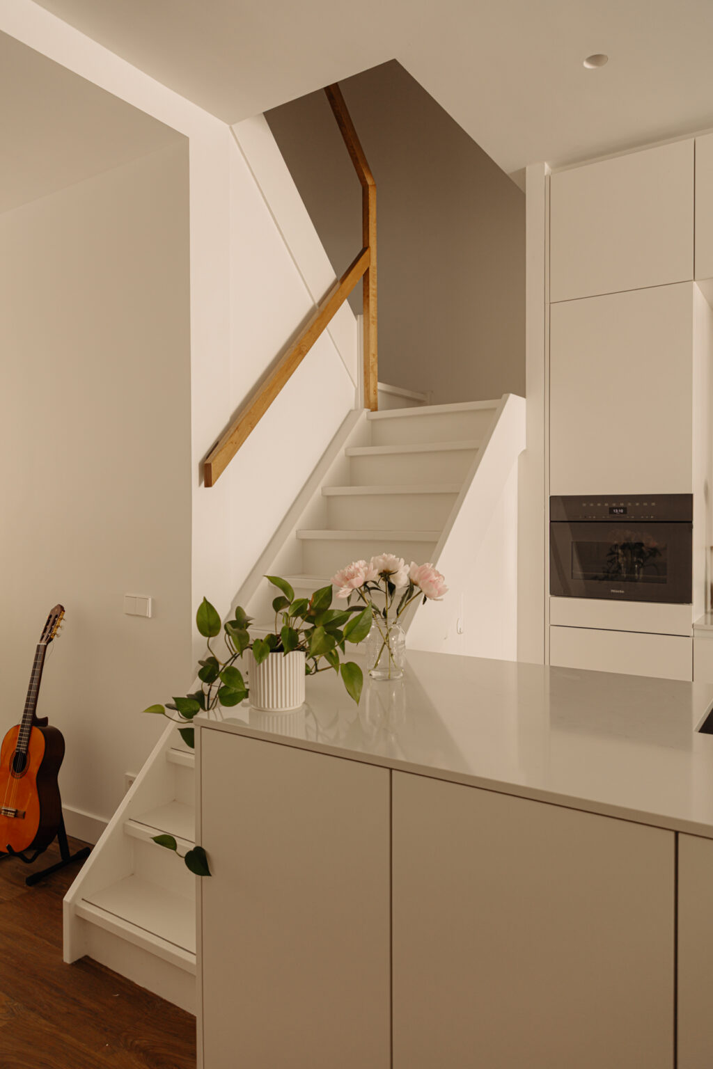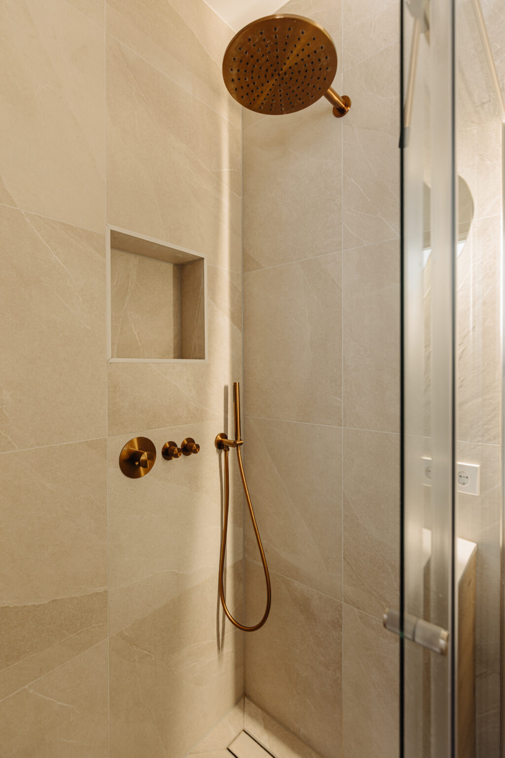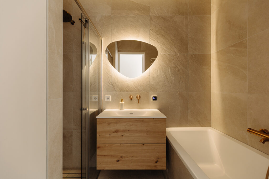 This sleeping floor comprises two bedrooms, a luxurious bathroom with a bathtub, walk-in shower, and washbasin, and a separate toilet in the hallway. At the front, a charming, spacious bedroom doubles as a home office, with French doors opening to a balcony overlooking the street. At the rear, the second bedroom features built-in wardrobes and direct access to a balcony facing the garden.