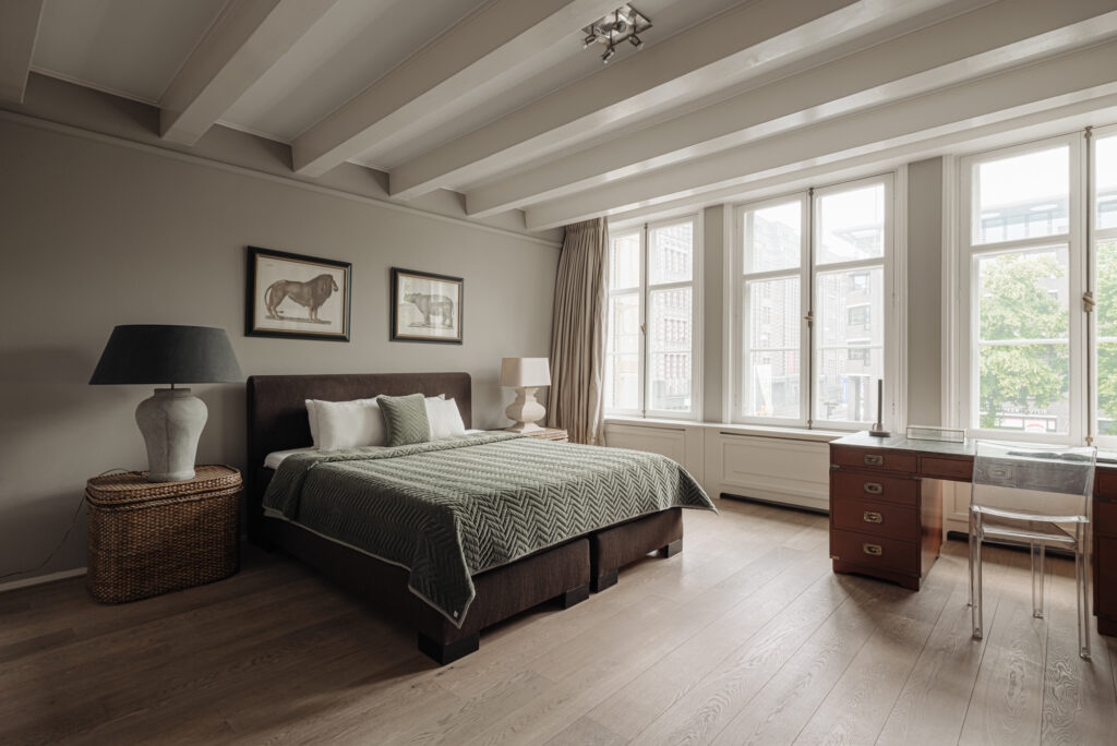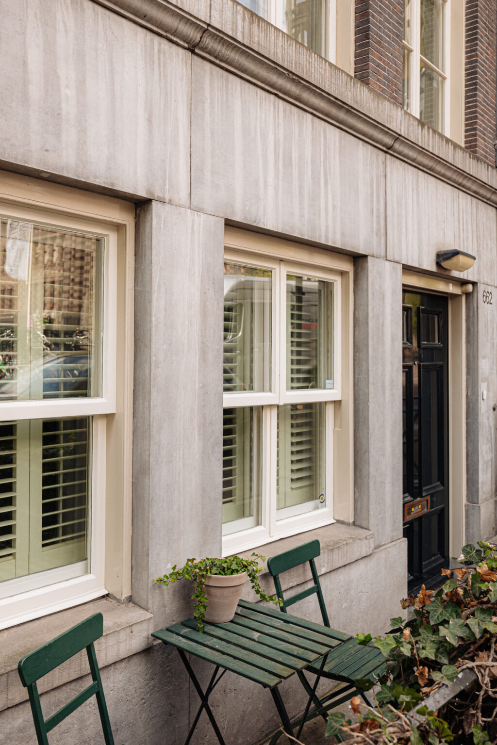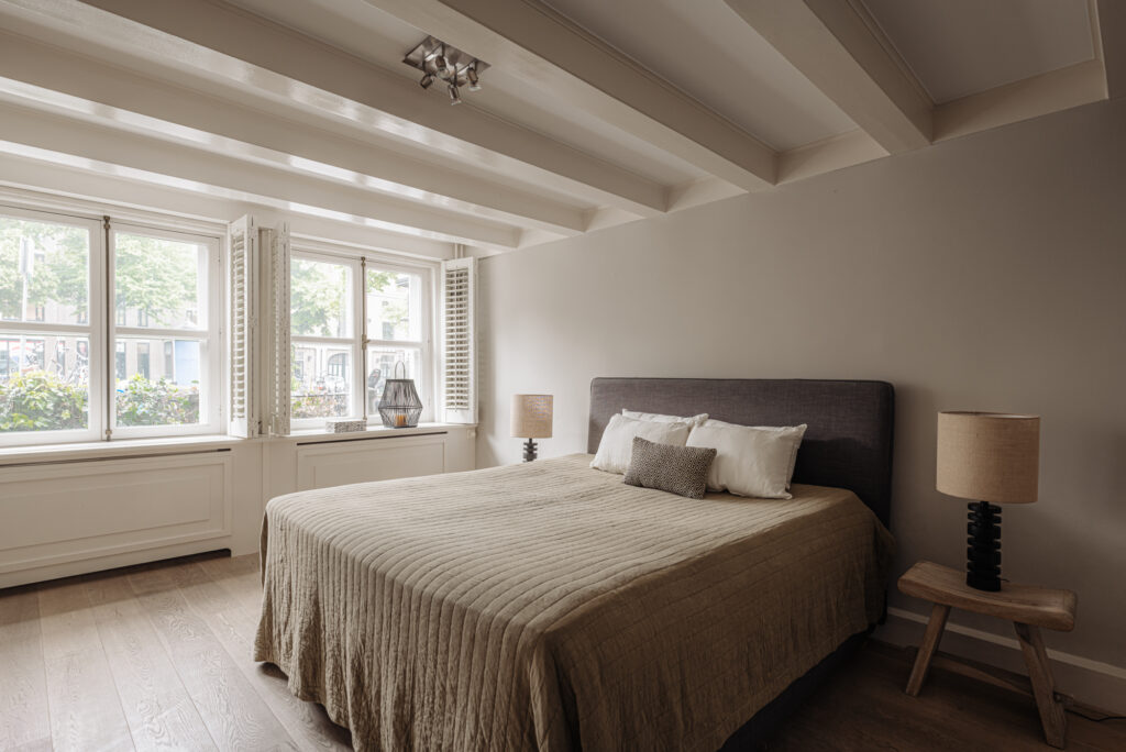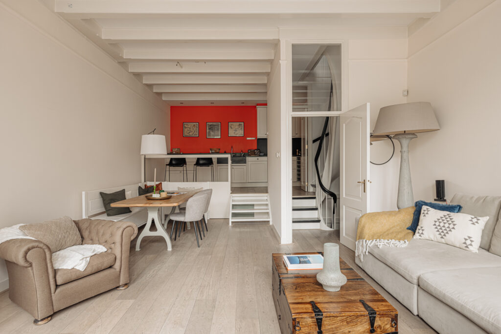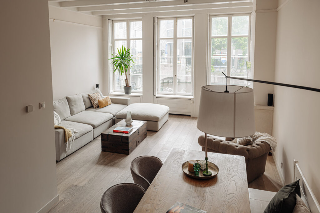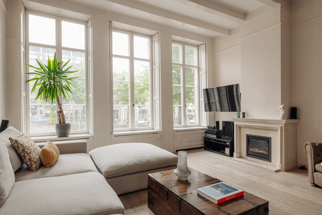 De lichte woonkamer, met een hoogte van 3,26 meter en een balkenplafond, versterkt de grandeur van het wonen aan de grachten. De kamer is drie ramen breed en heeft originele houten luiken die ’s avonds of in de zomer voor extra koelte gesloten kunnen worden. Een gashaard zorgt voor gezelligheid op een koude dag, perfect om naast te zitten en naar buiten te kijken.