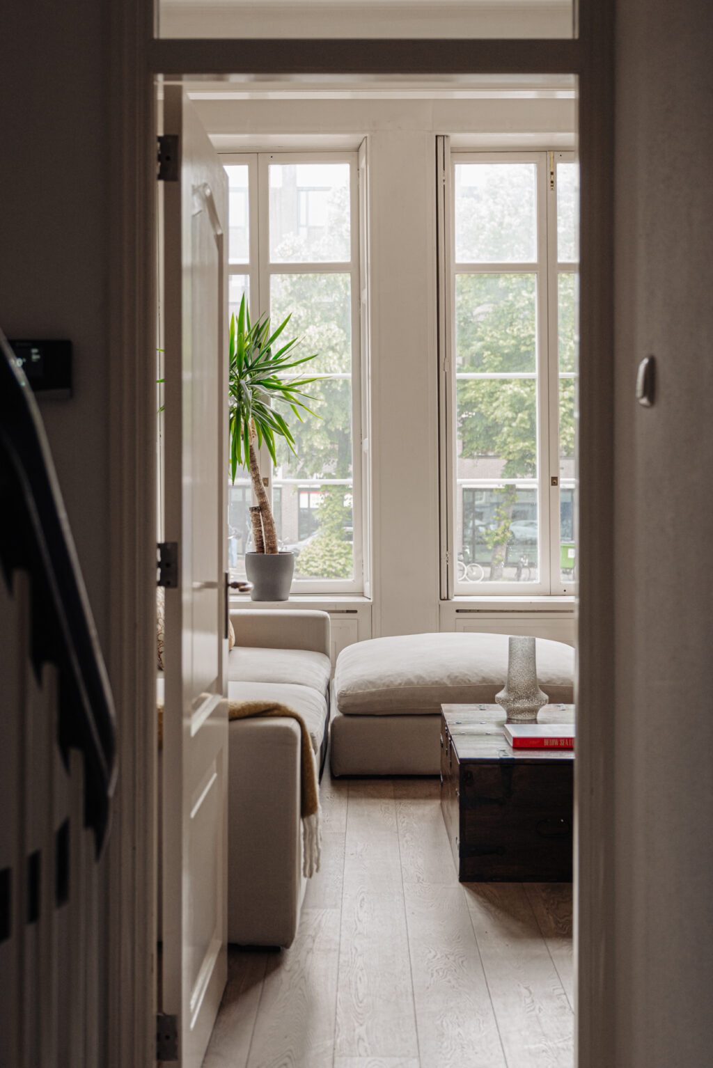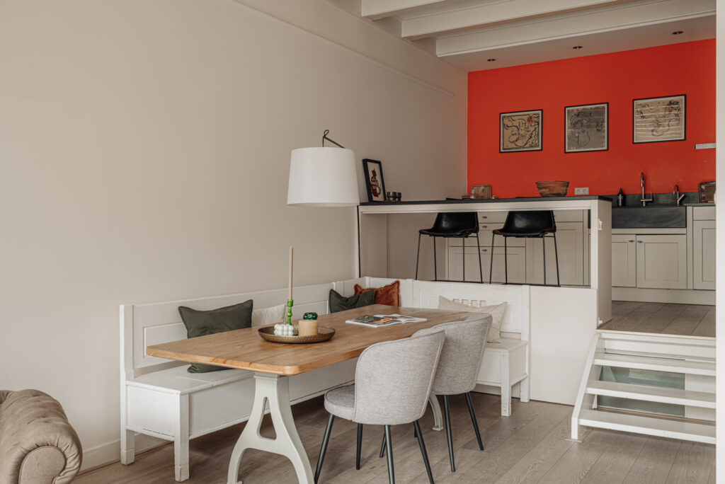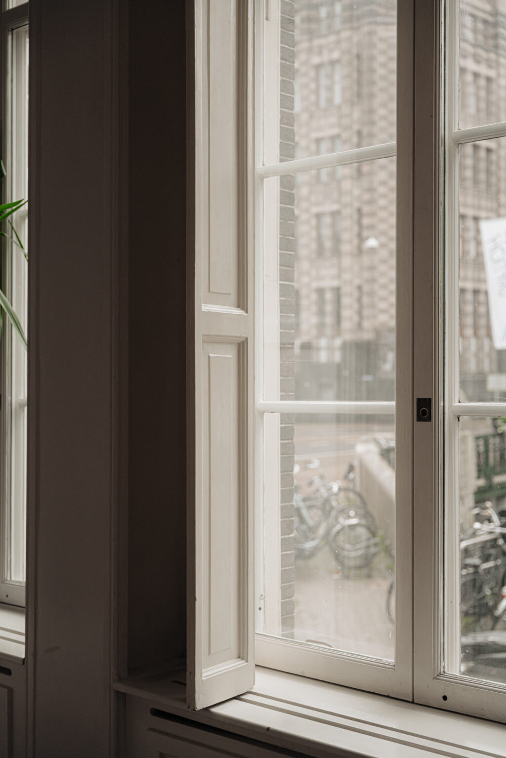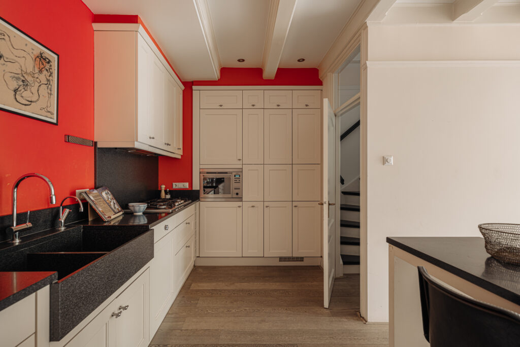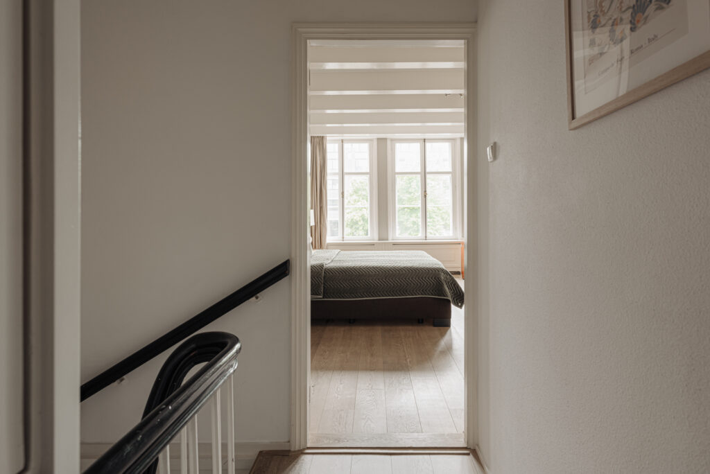 De lichte woonkamer, met een hoogte van 3,26 meter en een balkenplafond, versterkt de grandeur van het wonen aan de grachten. De kamer is drie ramen breed en heeft originele houten luiken die ’s avonds of in de zomer voor extra koelte gesloten kunnen worden. Een gashaard zorgt voor gezelligheid op een koude dag, perfect om naast te zitten en naar buiten te kijken.