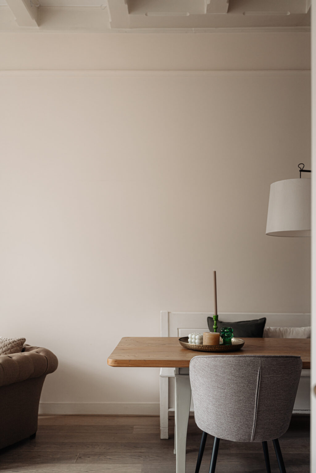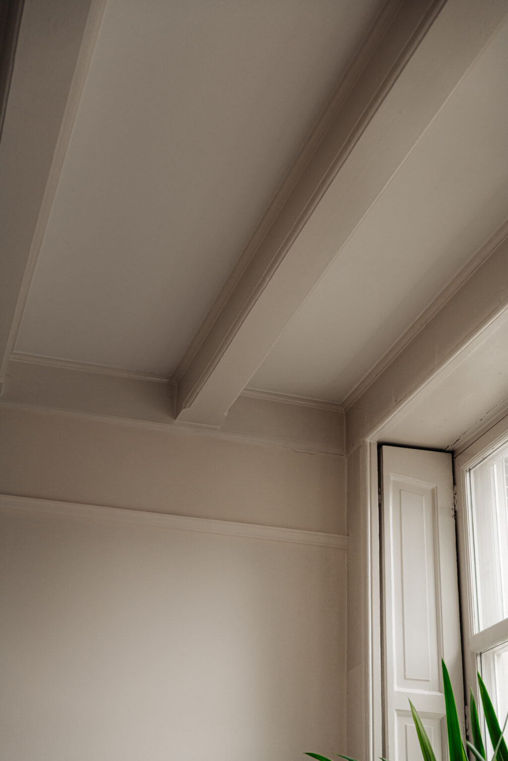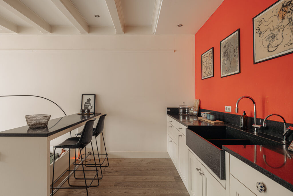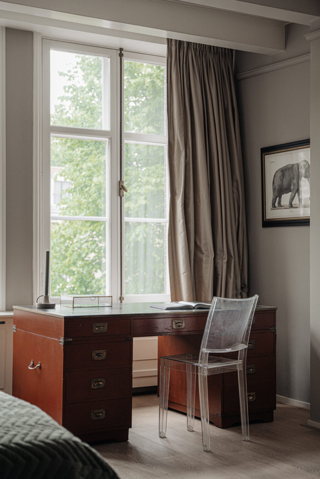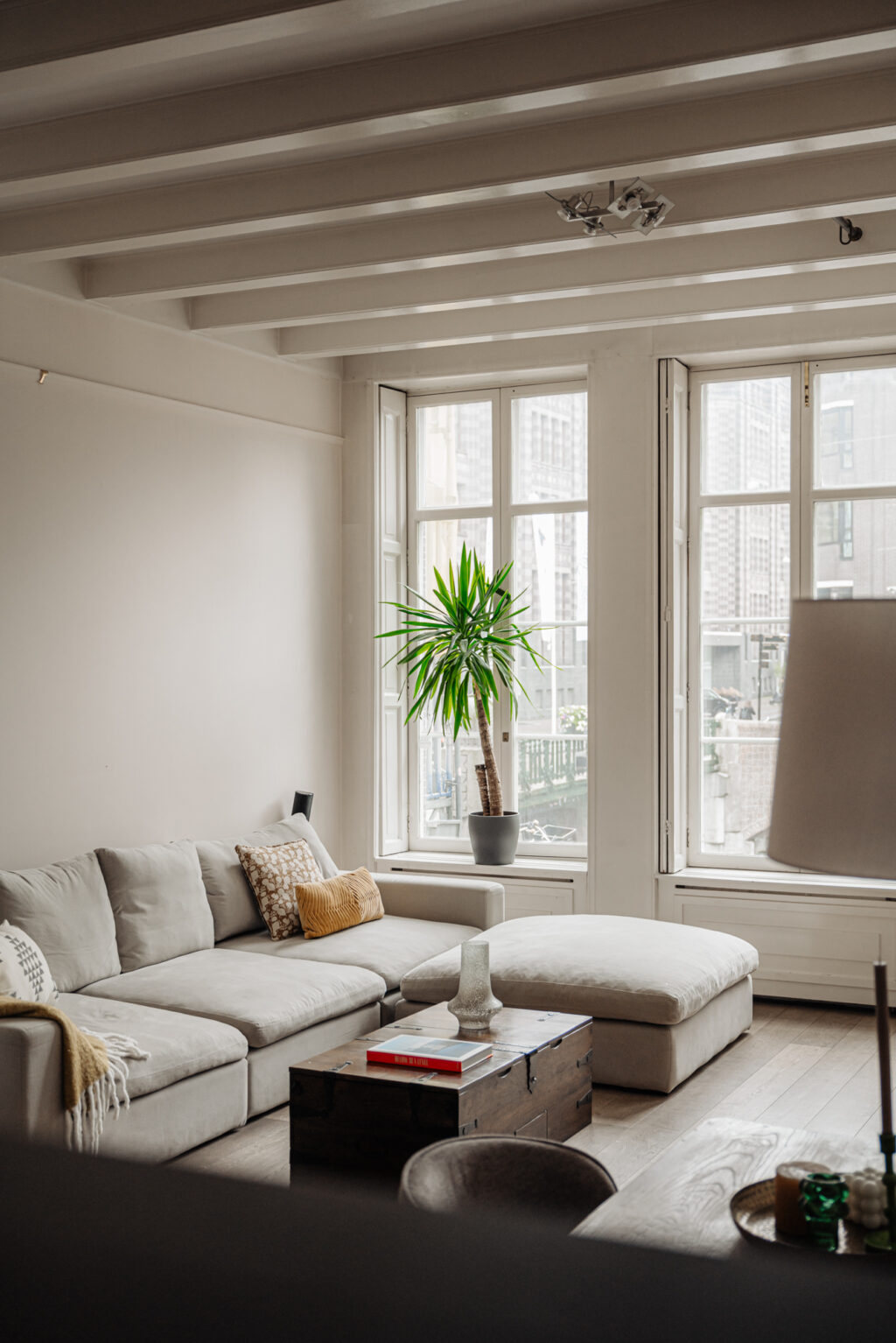 De lichte woonkamer, met een hoogte van 3,26 meter en een balkenplafond, versterkt de grandeur van het wonen aan de grachten. De kamer is drie ramen breed en heeft originele houten luiken die ’s avonds of in de zomer voor extra koelte gesloten kunnen worden. Een gashaard zorgt voor gezelligheid op een koude dag, perfect om naast te zitten en naar buiten te kijken.