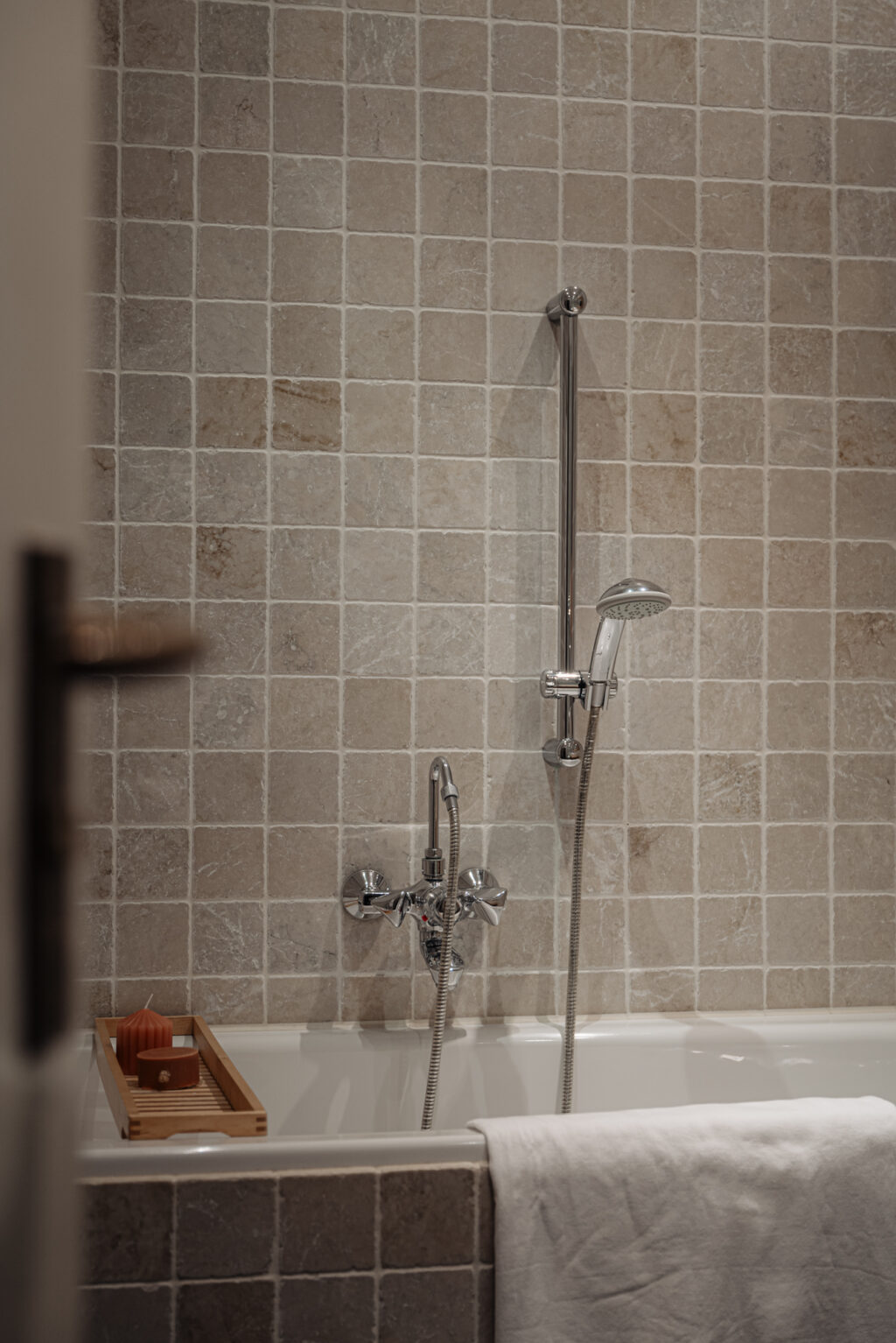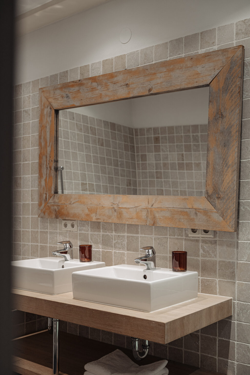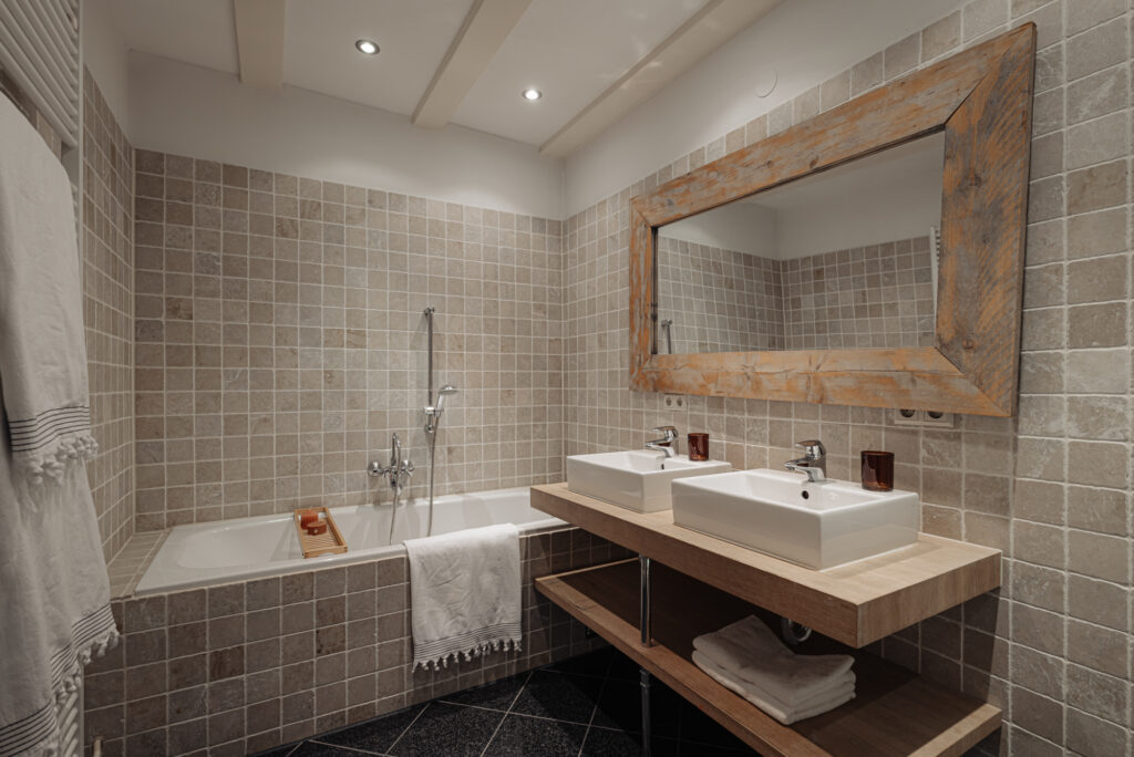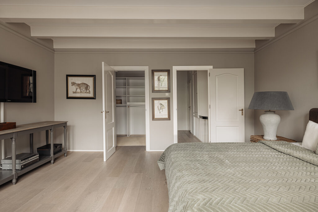 De tweede slaapkamer, een zeer royale kamer, ligt op de tweede verdieping en beschikt over een eigen walk-in closet. Op deze etage is er een tweede badkamer met een landelijke uitstraling, voorzien van beige wandtegels, natuurstenen vloertegels en houten accenten. De badkamer heeft een ligbad, douche en dubbel wastafelmeubel. Het tweede toilet is separaat.