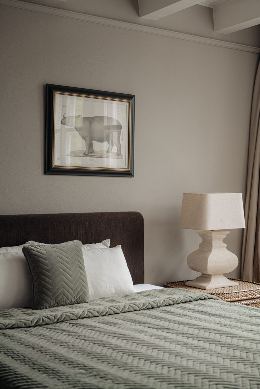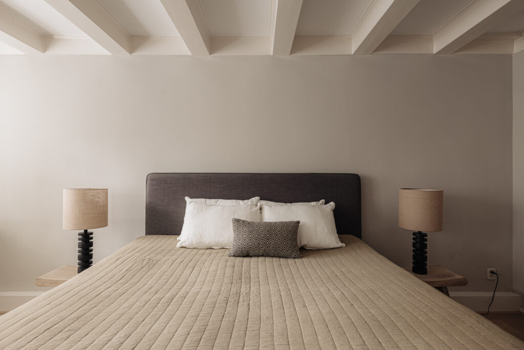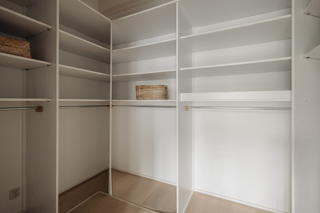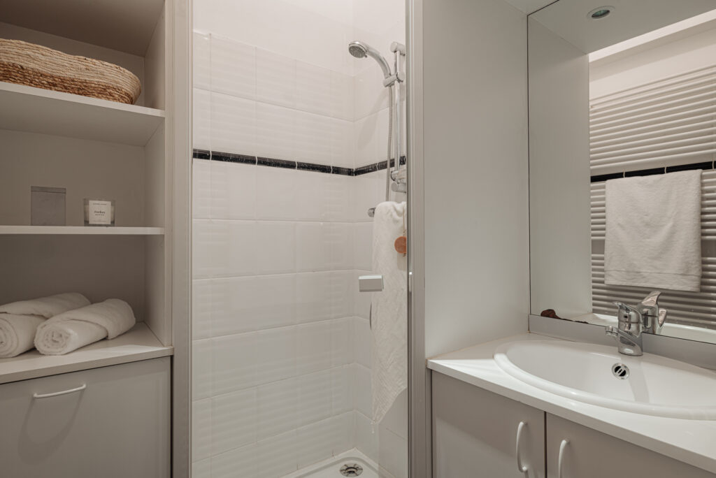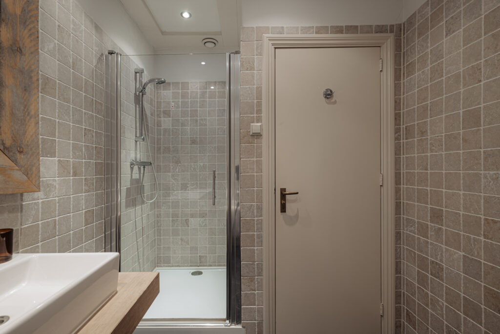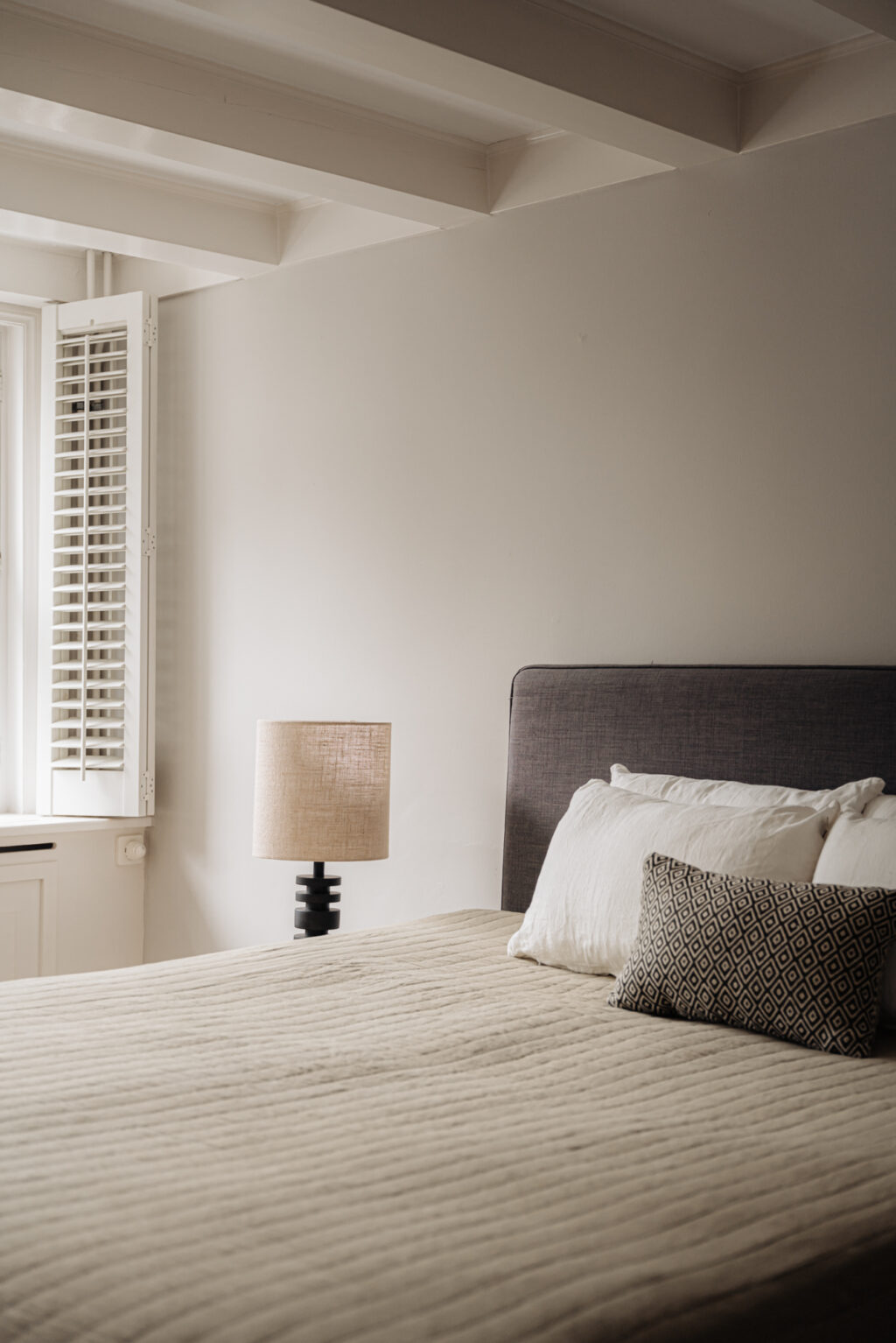 De eerste ruime slaapkamer bevindt zich op de parterre en heeft mooie houten shutters voor de ramen. Naast deze slaapkamer bevindt zich een walk-in closet en een badkamer. De nette doch eenvoudige badkamer heeft witte tegels met een zwarte bies en is voorzien van een douche en wastafelmeubel. Op deze etage bevindt zich ook het gastentoilet, evenals een ruimte voor de wasmachine en droger.