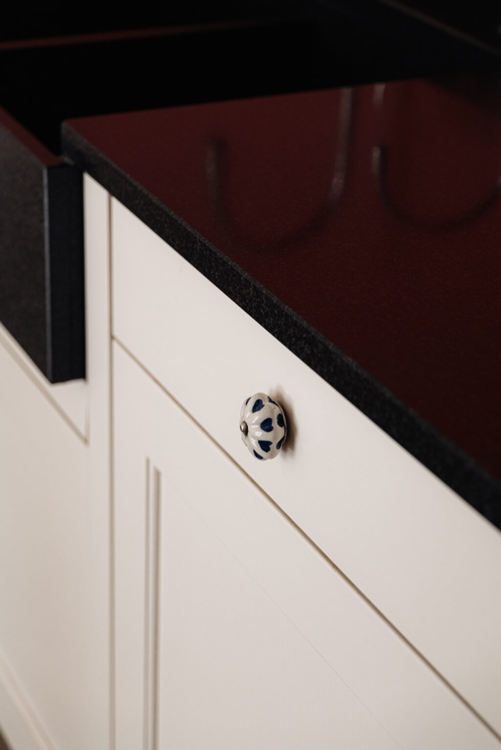 De verzorgde keuken ligt enkele treden hoger en heeft een klassieke uitstraling met een natuurstenen werkblad. Er is een gezellige bar gecreëerd, een ideale plek om te ontbijten of tijdens het koken een drankje te nuttigen. De keuken is uitgerust met een dubbele spoelbak, Quooker, vaatwasser, koelkast/vriezer, gasfornuis en combimagnetron. Er is meer dan voldoende bergruimte in de keuken.