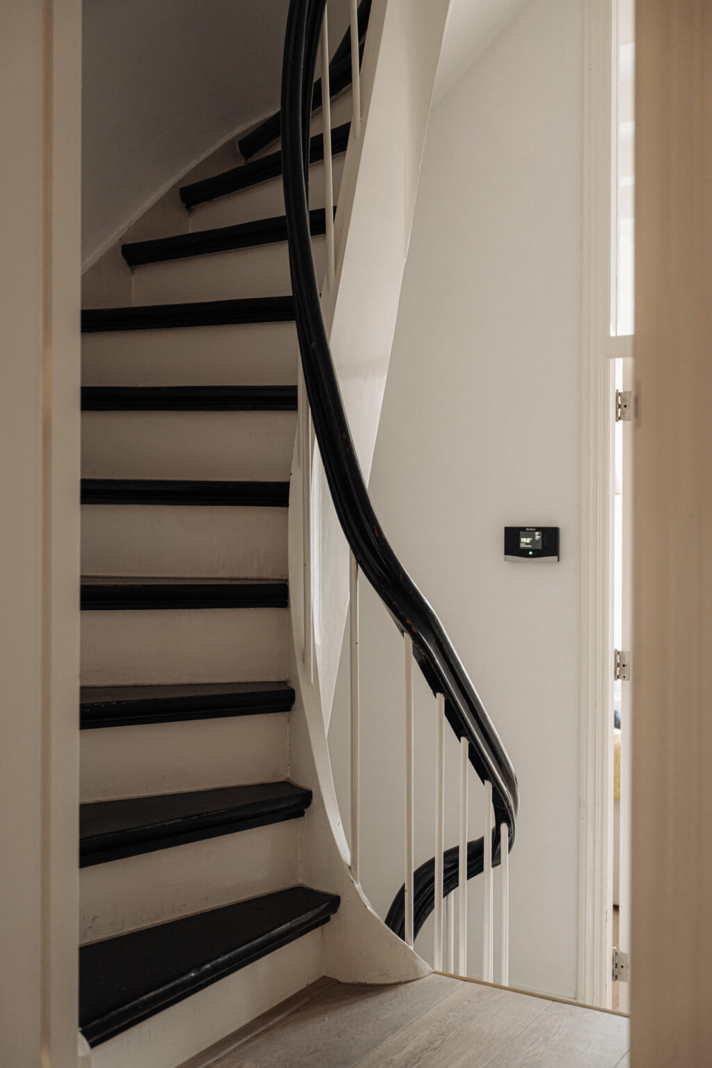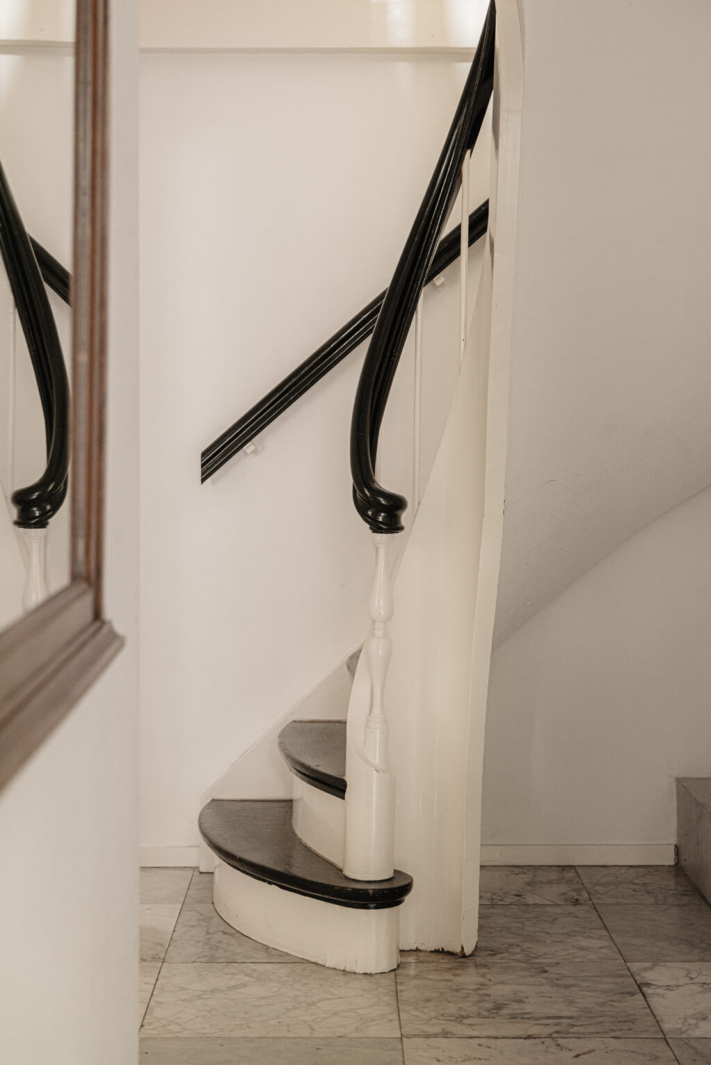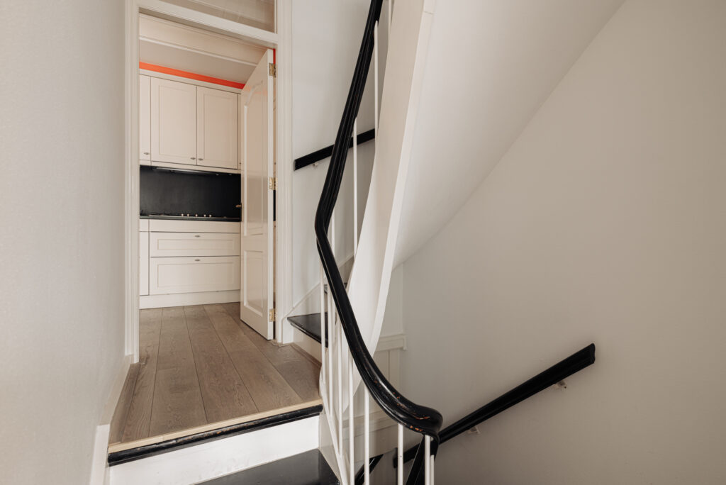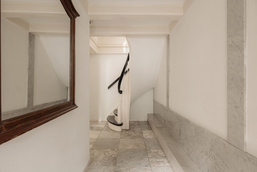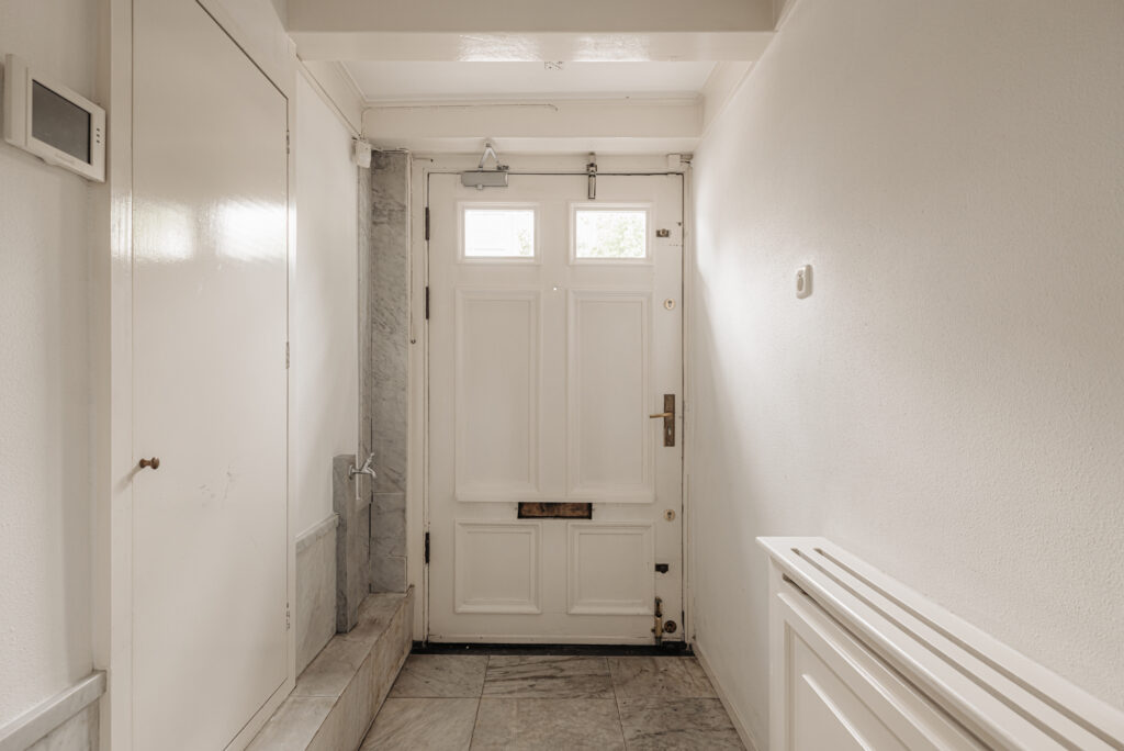 Het verzorgde appartement beschikt over een eigen, ruime entree direct vanaf de straat, wat het een ‘woonhuis’-gevoel geeft zonder gedeeld trappenhuis. De entree is royaal opgezet, met ruimte voor een garderobe, een (elektrische) fiets of een kinderwagen. De hal is voorzien van fraaie marmeren tegels die perfect aansluiten bij de uitstraling van het gebouw. Een ronde trap leidt naar de woonetage.
